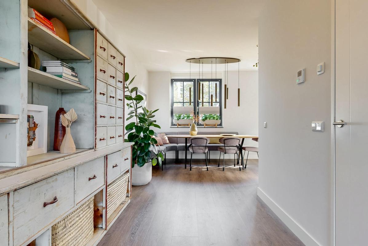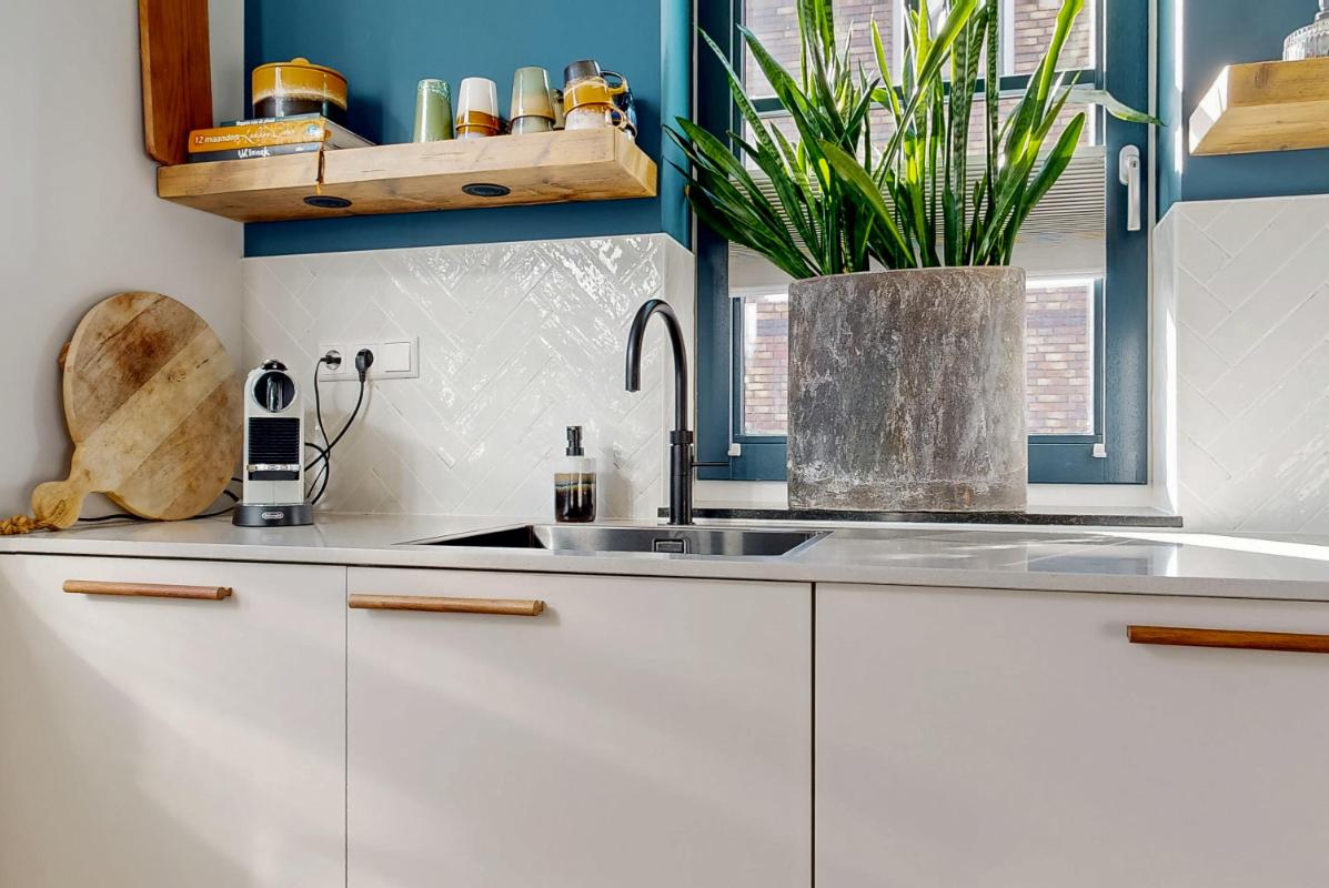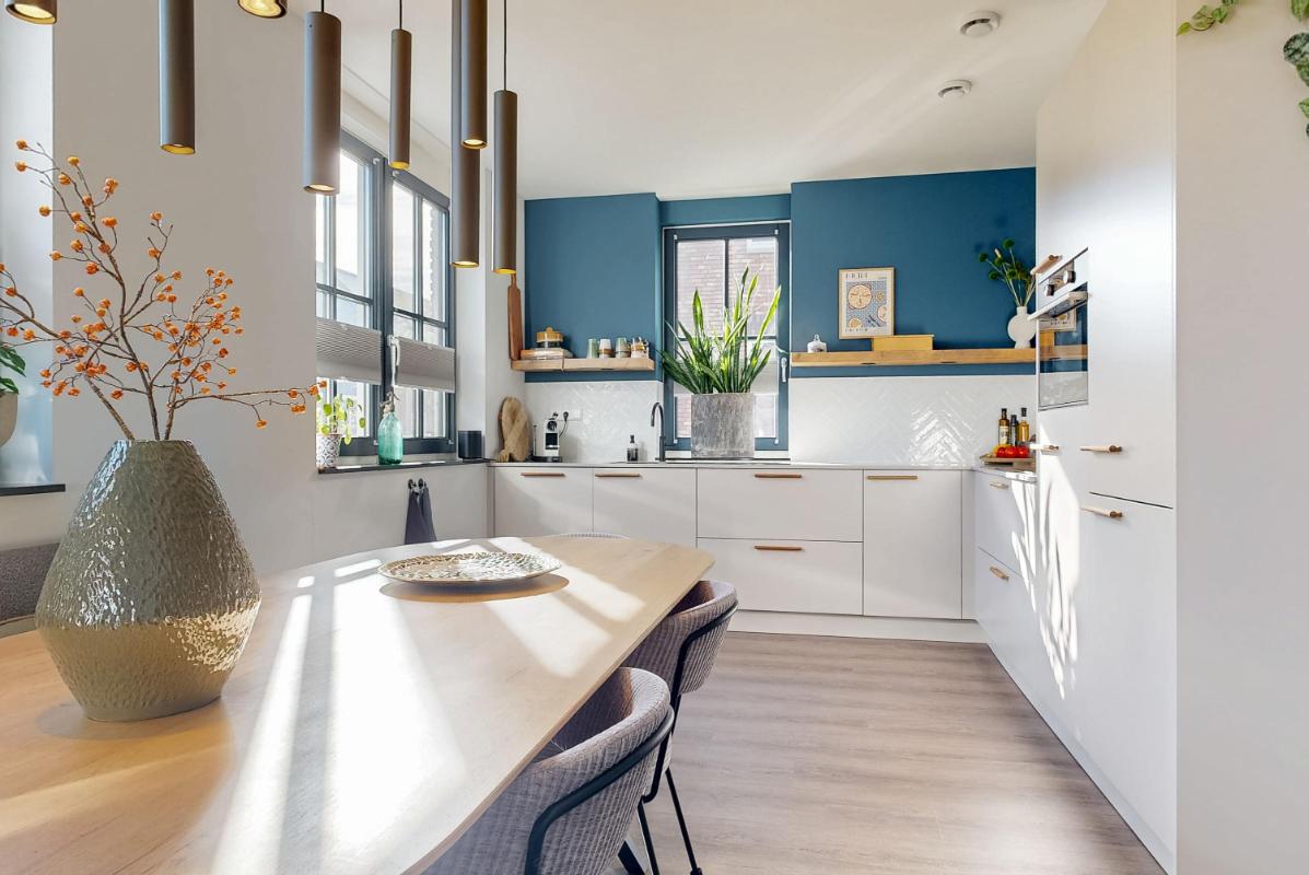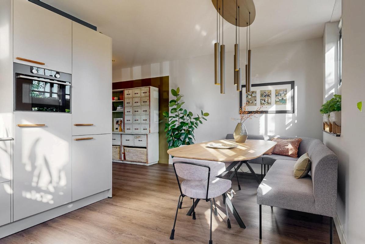 Aangrenzend aan de woonkamer ligt de sfeervolle ruime woonkeuken met een modern keukenblok en een composiet keukenblad. De keuken is voorzien van moderne inbouwapparatuur zoals een Bora inductiekookplaat met geïntegreerde afzuiging, combi-oven, vaatwasser, koel-/vriescombinatie én een Quooker. Hier wordt koken en samen eten een plezierige beleving.