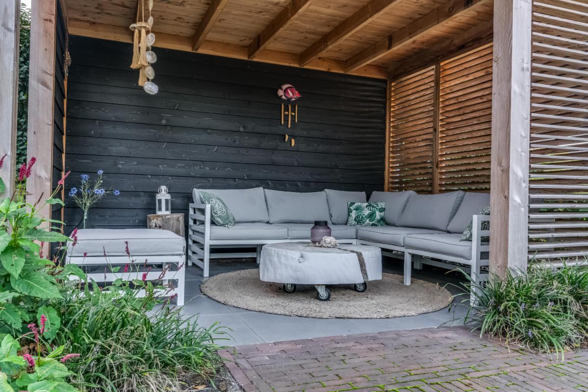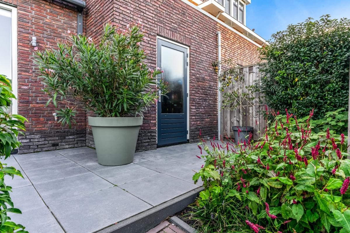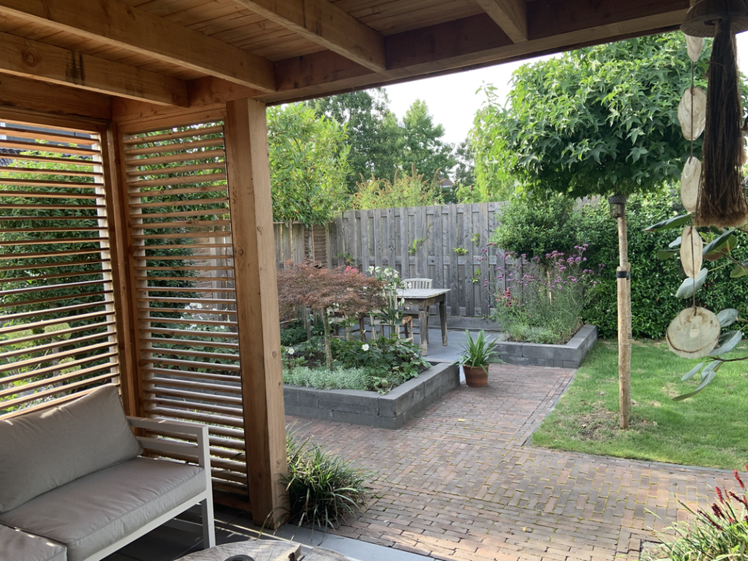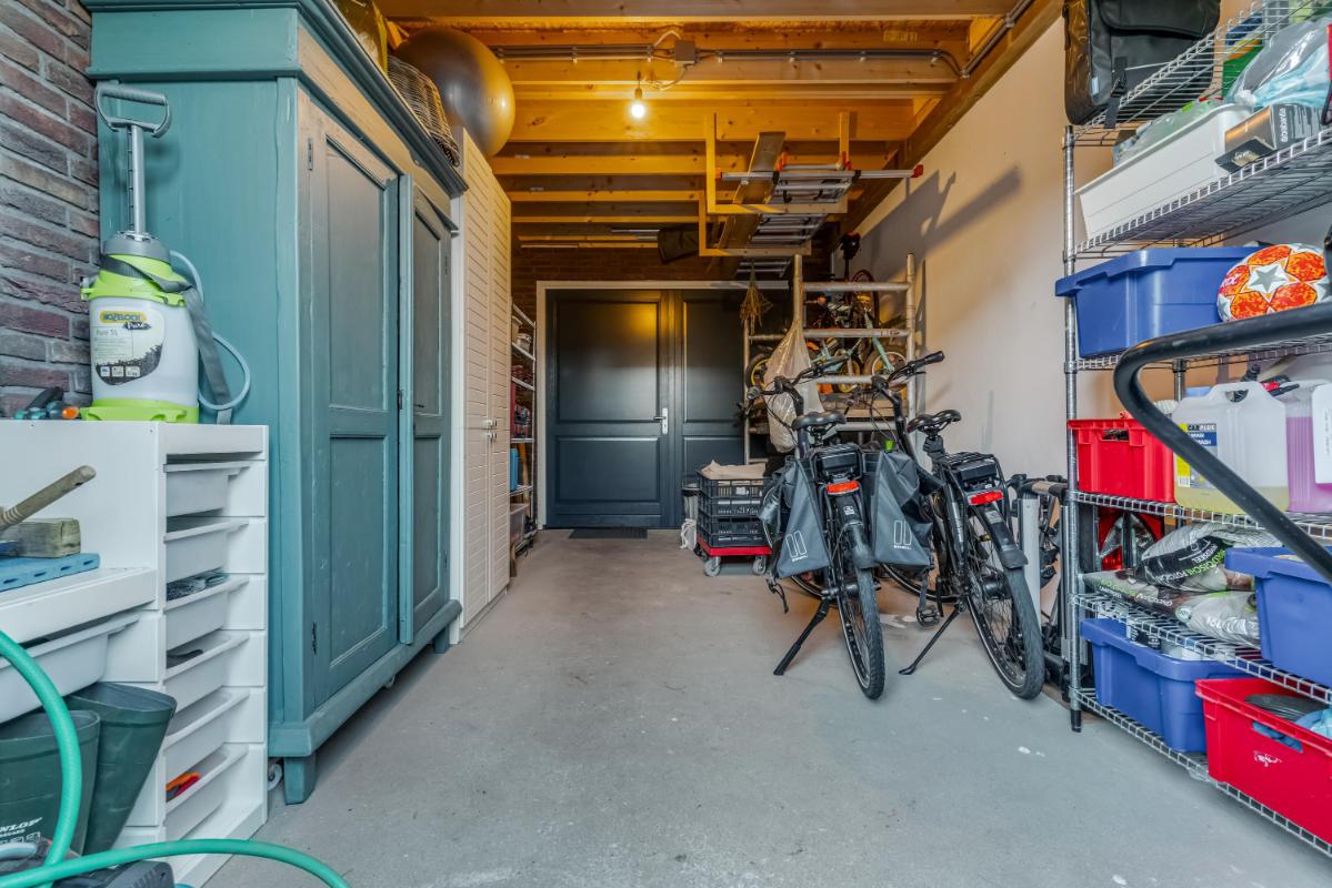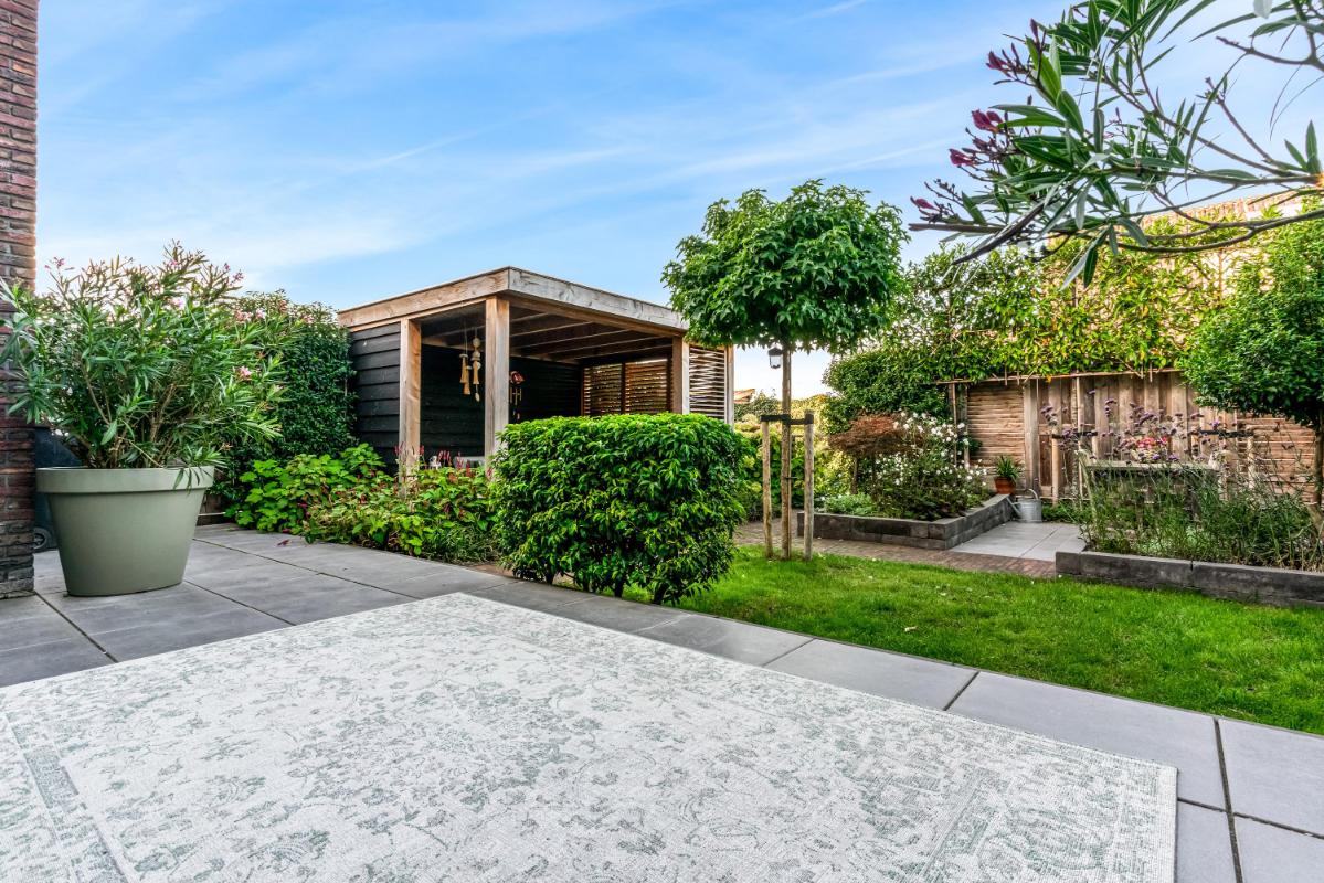 De achtertuin op het zuidwesten is fraai aangelegd met een onderheid terras, sfeervolle overkapping en kleurrijke beplanting. Dit is een heerlijke plek om van lange zomeravonden te genieten. Vanuit de tuin heeft u toegang tot de ruime garage, voorzien van elektra, een loopdeur en openslaande deuren. Anders dan bij een standaard garagedeur, zijn de openslaande deuren ideaal wanneer u de garage ook als hobbyruimte of atelier gebruikt. Daarnaast zorgen de deuren voor een luxe en moderne uitstraling van de garage.