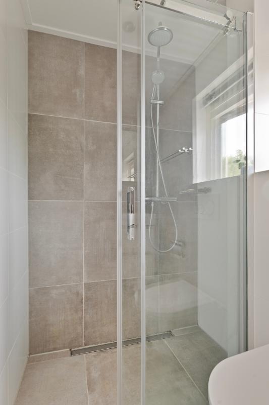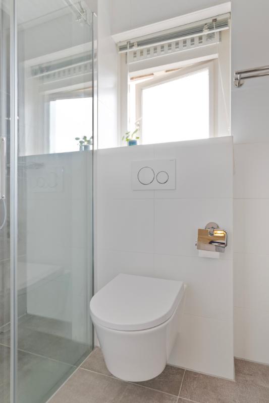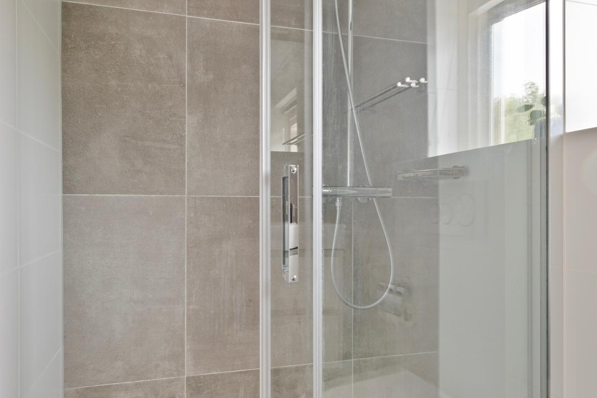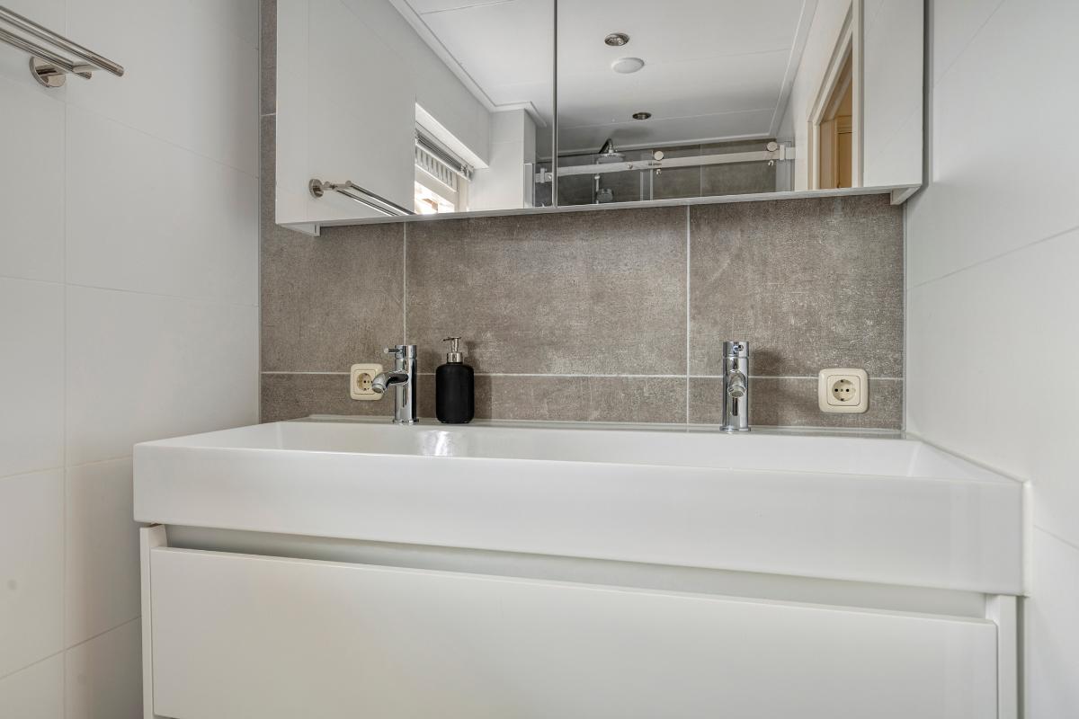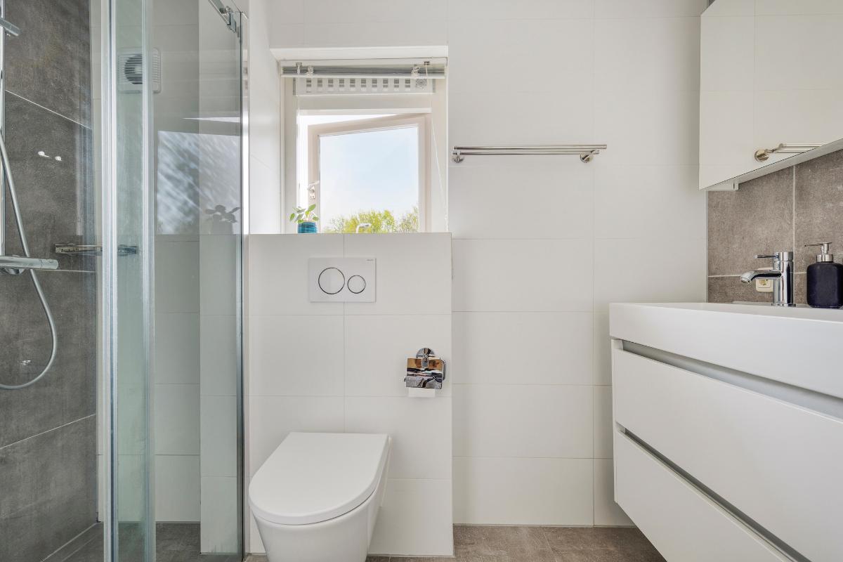 De badkamer ligt, net als de derde slaapkamer, aan de voorzijde van de woning. De moderne badkamer is in 2020 geheel vernieuwd en ingedeeld met een ruime inloopdouche, een toilet en een badkamermeubel met brede wastafel met twee kranen. Verwarming is door middel van vloerverwarming. In de badkamer is een raam aanwezig voor natuurlijke ventilatie en daglichttoetreding.