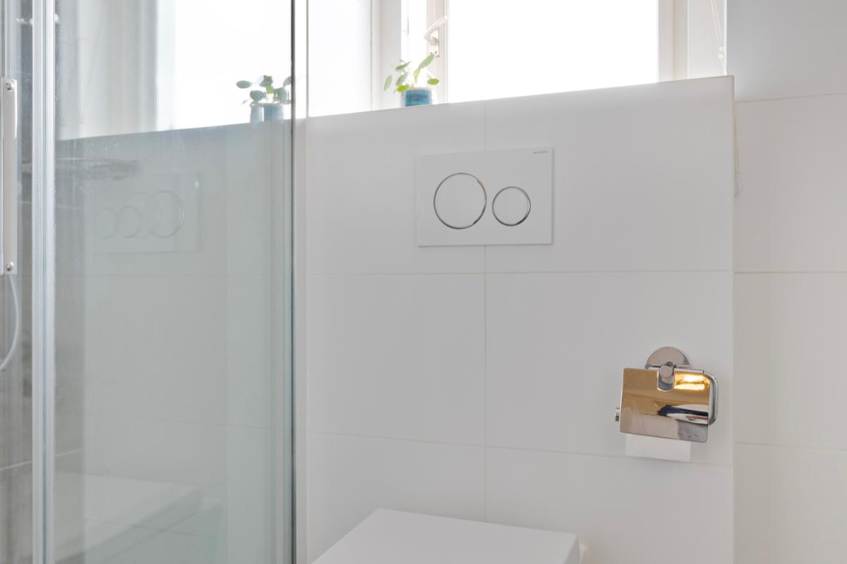 The bathroom, like the third bedroom, is located at the front of the house. The modern bathroom was completely renovated in 2020 and is equipped with a spacious walk-in shower, a toilet and a bathroom cabinet with a wide sink with two taps. Heating is by means of underfloor heating. There is a window in the bathroom for natural ventilation and daylight.