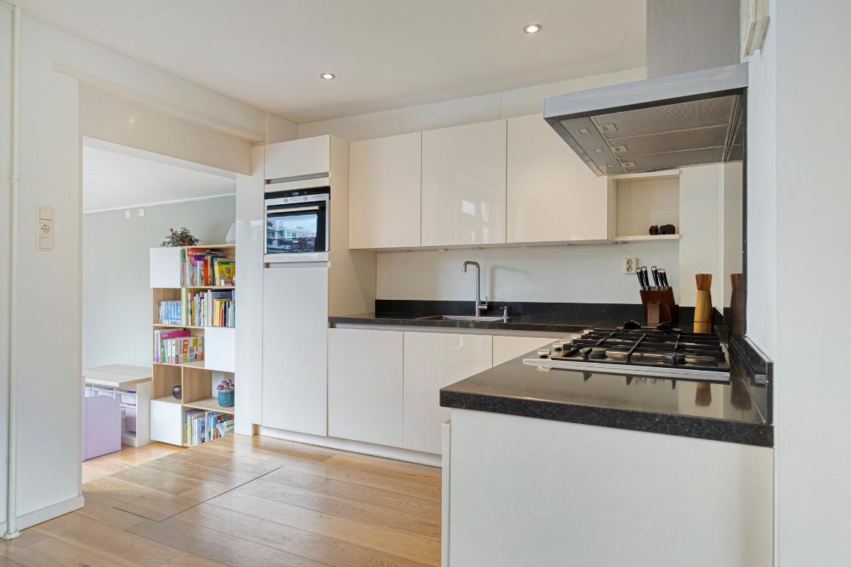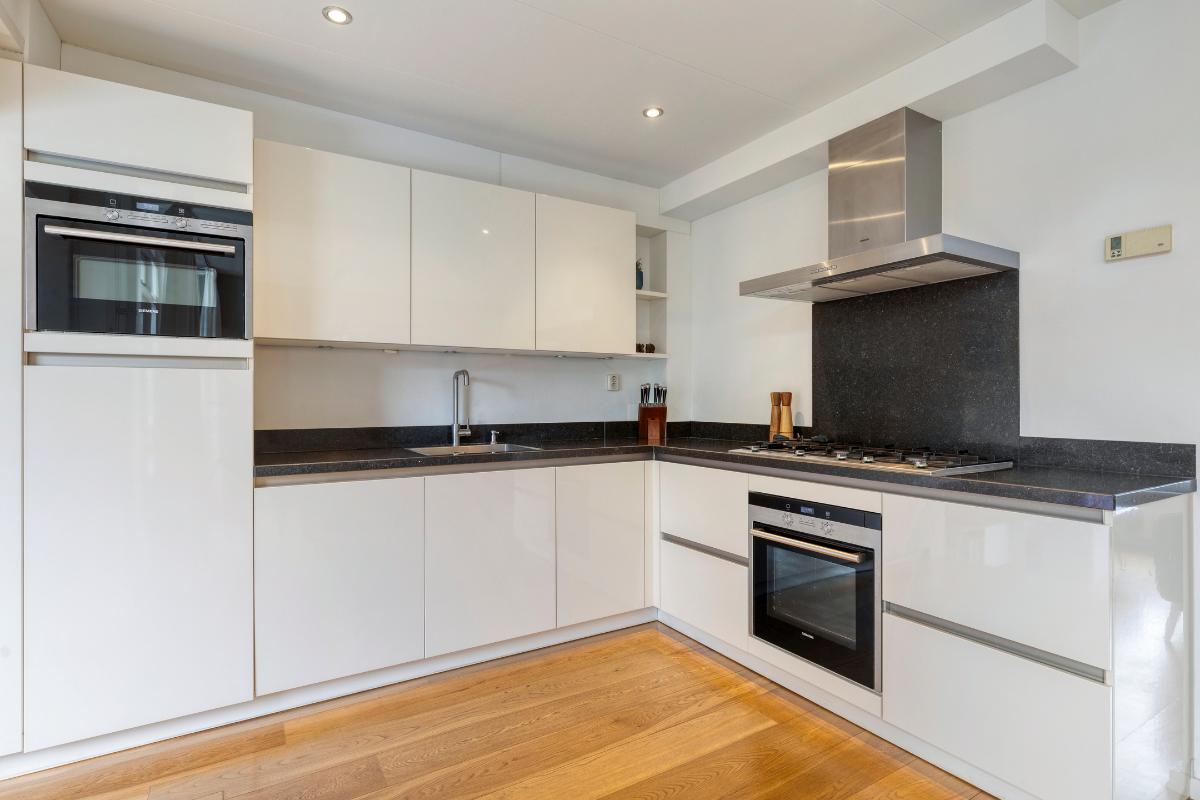 De moderne open keuken is in een L-vorm geplaatst. Er is voldoende bergruimte aanwezig in de aanwezige kasten en lades. De keuken is voorzien van een natuurstenen blad, een 5-pitsgaskookplaat, een afzuigkap, een grote oven, een combimagnetron, een koelkast en een vaatwasmachine. De woning is aan de keukenzijde uitgebouwd.