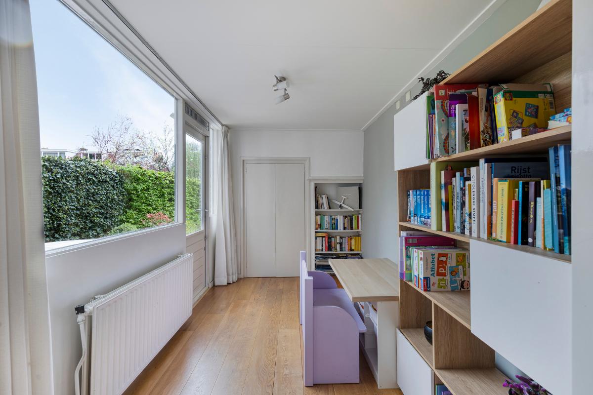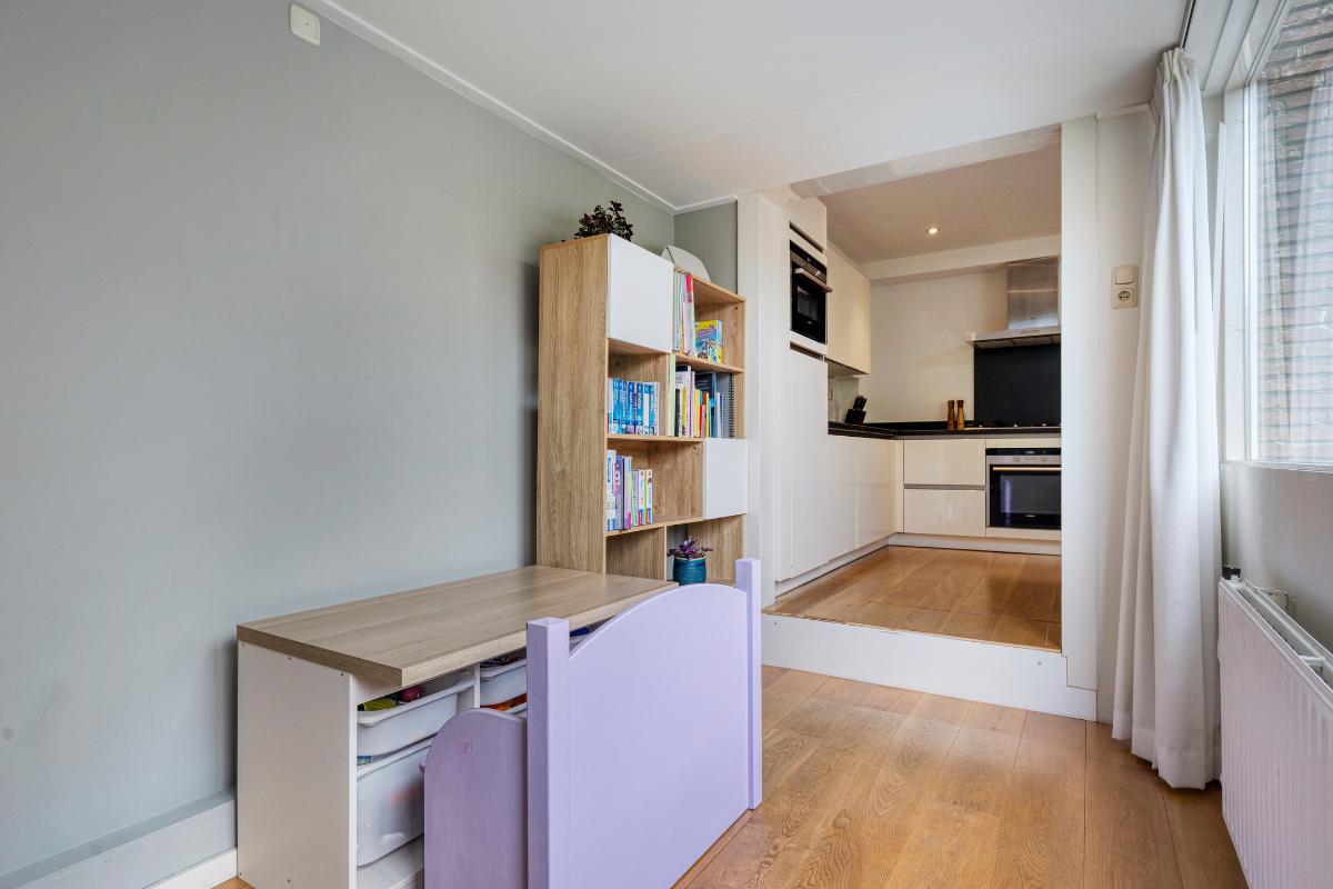 De kamer in deze uitbouw is een multifunctionele ruimte, momenteel is deze ingericht als speelkamer, maar deze kamer is ook uitermate geschikt voor bijvoorbeeld kantoor aan huis. Via deze kamer is de achtergelegen bijkeuken en de achtertuin te bereiken. De praktische bijkeuken is voorzien van de aansluitingen voor de wasmachine en droger.