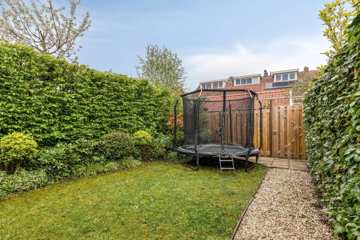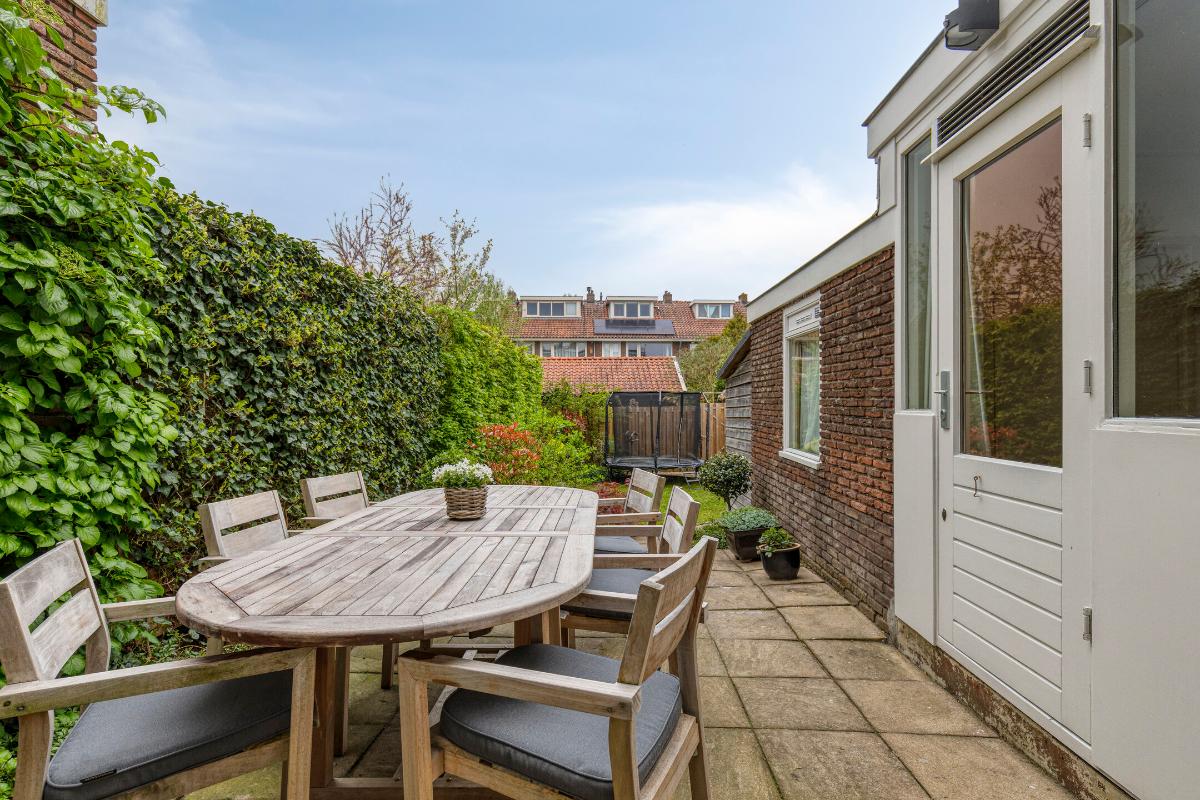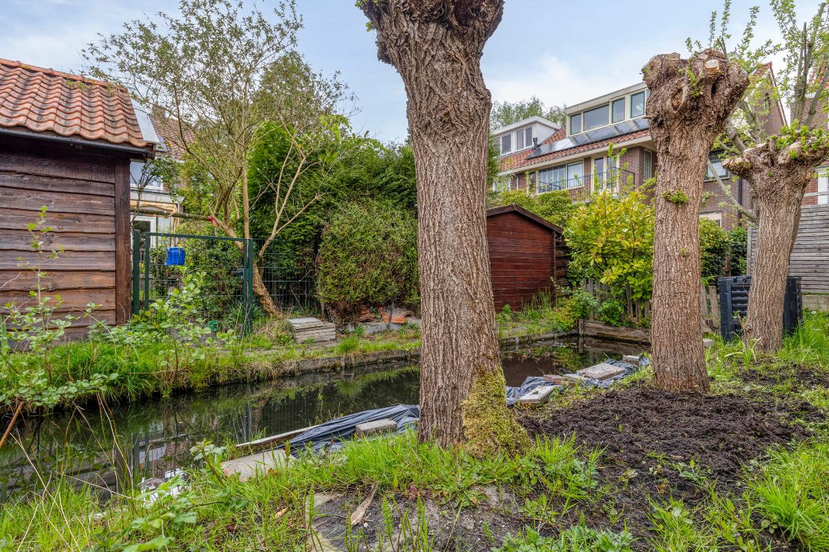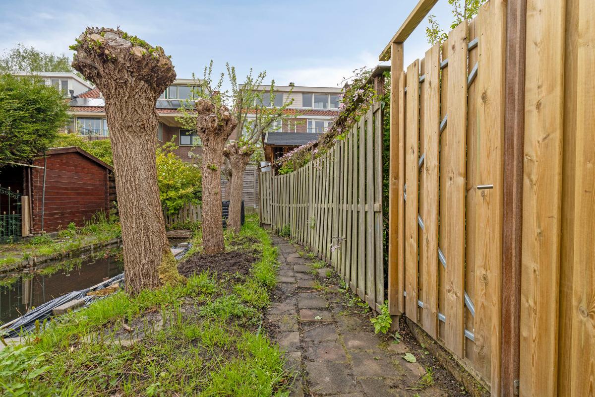 De sfeervolle en diepe achtertuin ligt op het westen. De tuin biedt veel privacy en heeft een fijne indeling met een terras en veel groen. Aangrenzend aan de bijkeuken is een houten overkapping gemaakt die voldoende plaats biedt voor de berging van bijvoorbeeld tuingereedschap en fietsen. Achter de tuin is een achterpad met sloot aanwezig.