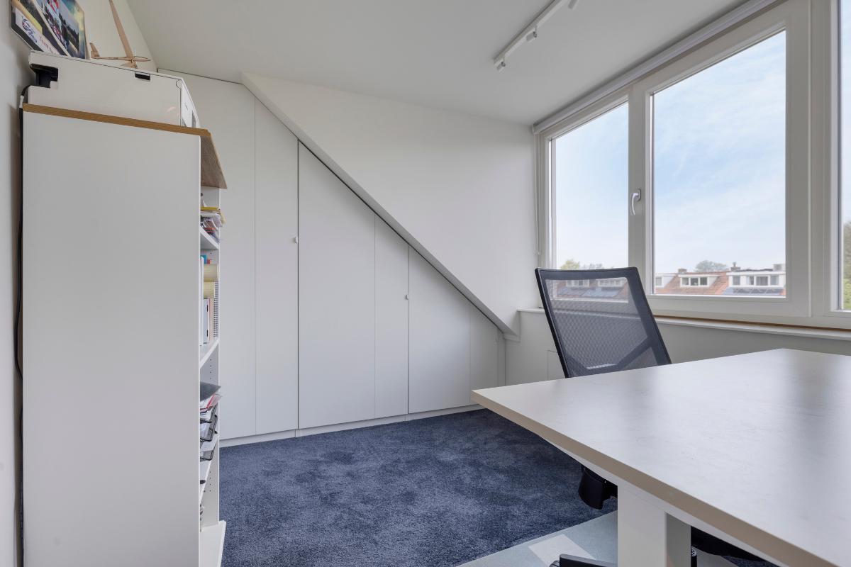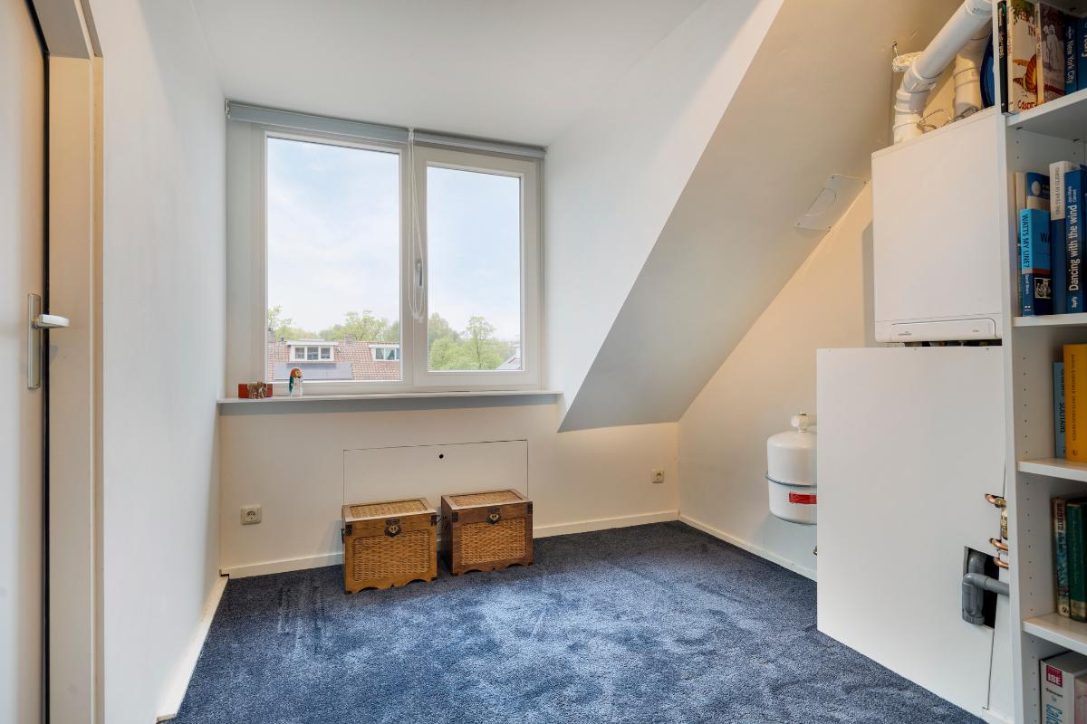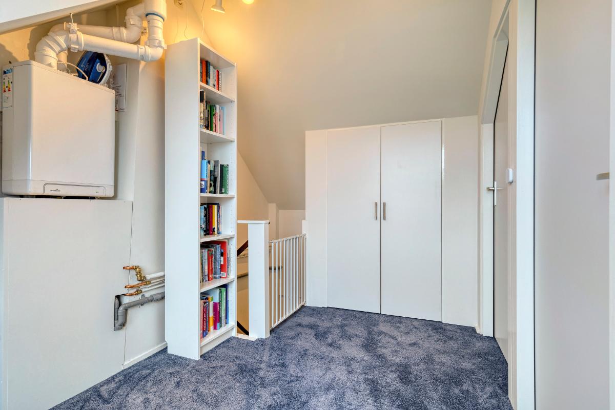 The second floor can be reached via a fixed staircase. This floor consists of a landing and two rooms. Ideal for use as a bedroom or office. On the spacious landing is the central heating boiler, a storage cupboard and storage space behind the knee walls. Both rooms, like the landing, have a dormer window with even more storage space behind the knee walls. The room at the rear also has fitted wardrobes. The room at the front has a washbasin.