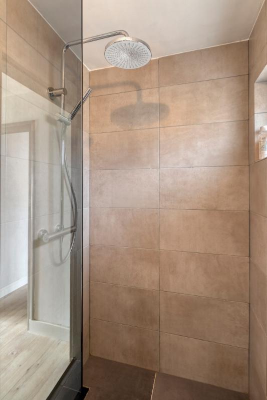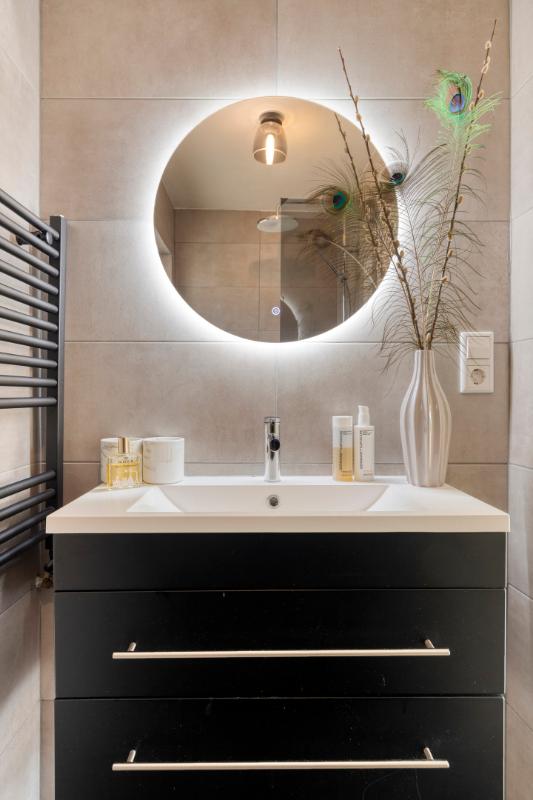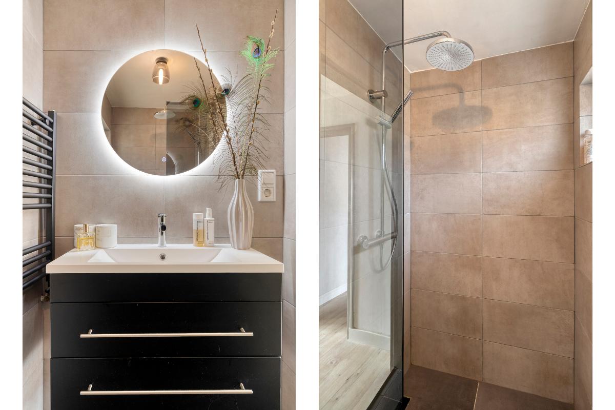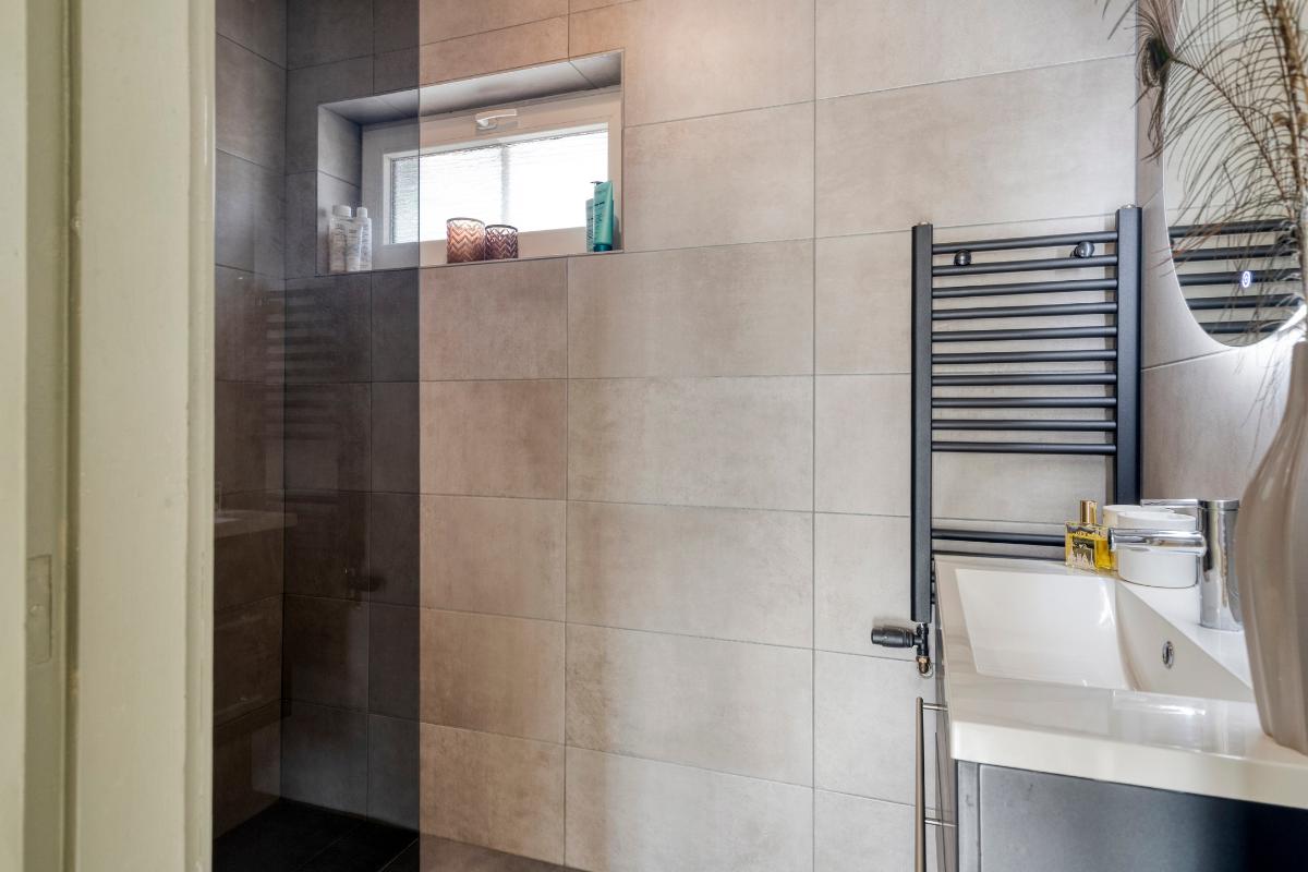 BADKAMER De geheel betegelde badkamer is in 2022 gerenoveerd en bestaat uit een ruime inloopdouche met regendouche, een wastafel in meubel en designradiator.