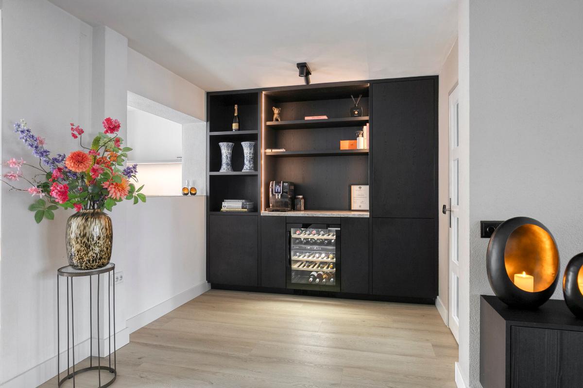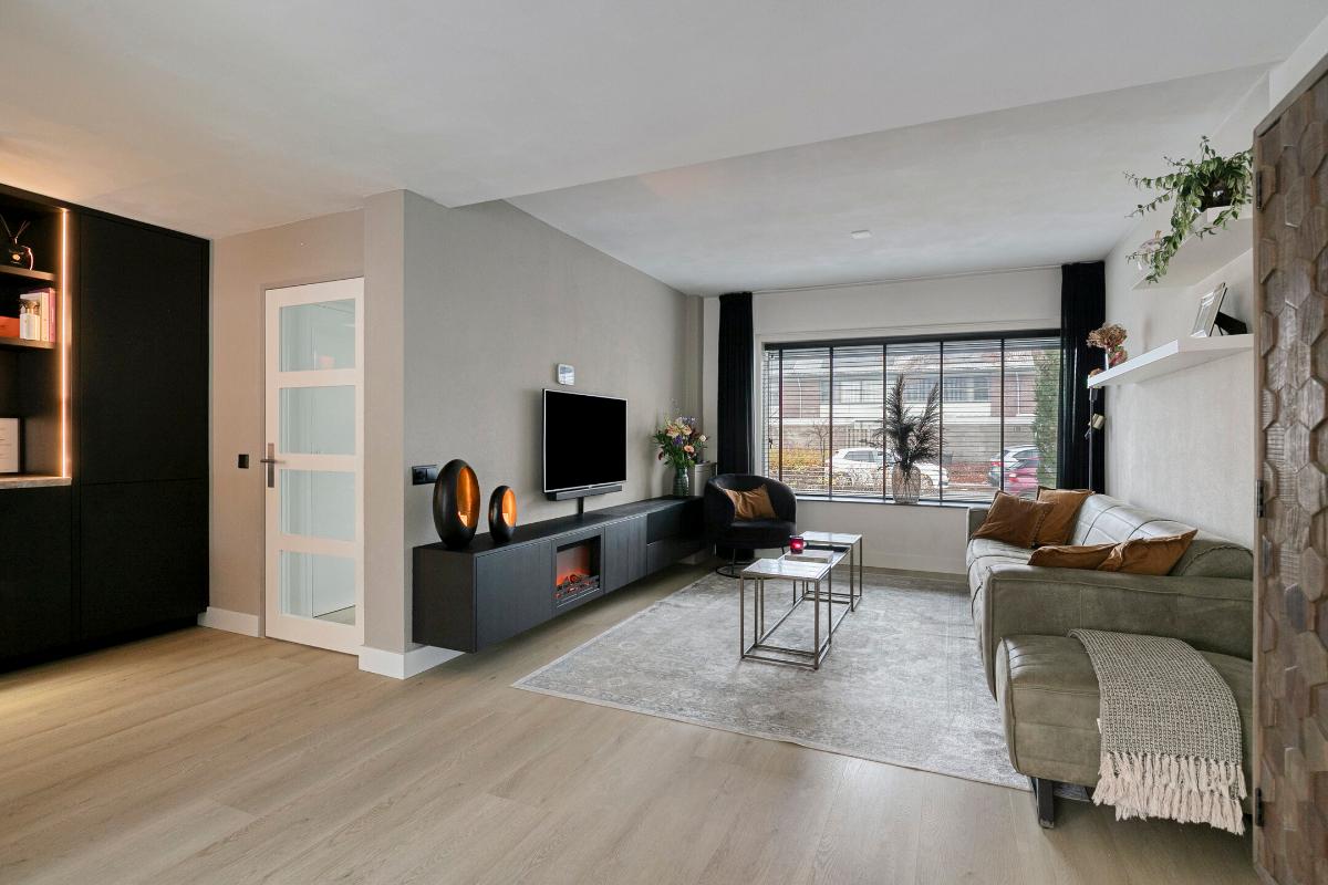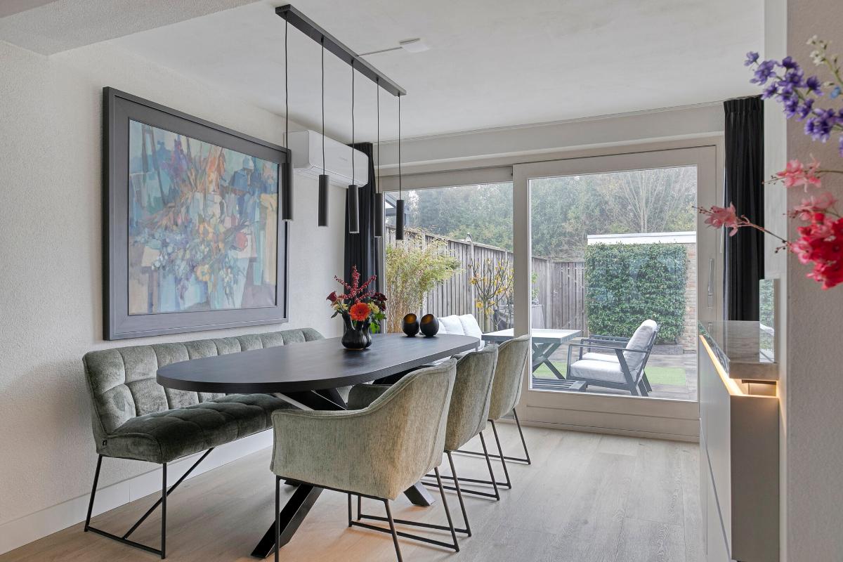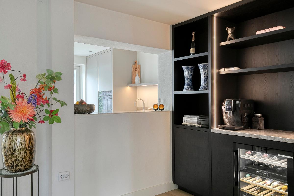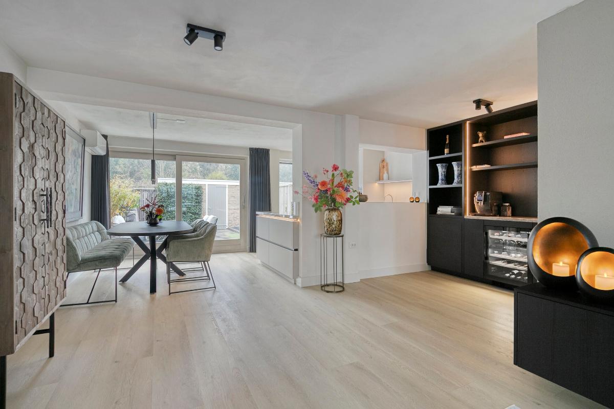 De woonkamer is het hart van het huis: een ruime, lichte leefruimte met een volledig vernieuwde erker die zorgt voor extra lichtinval en een prachtig uitzicht op de tuin. De erker is voorzien van een elektrisch bedienbare zonnescreen, die het hele jaar door voor een aangename temperatuur en privacy zorgt. De ruimte is verder uitgerust met airconditioning, een pvc-vloer met vloerverwarming (via de cv-ketel) en strakke stucwerk wanden en plafond. De open verbinding met de keuken creëert een sociale en gezellige sfeer. Tussen de keuken en de woonkamer bevindt zich een op maat gemaakte kastenwand met een wijnklimaatkast (maatwerk Studio van Gennip). Door middel van een schuifpui kunt u de tuin bereiken.