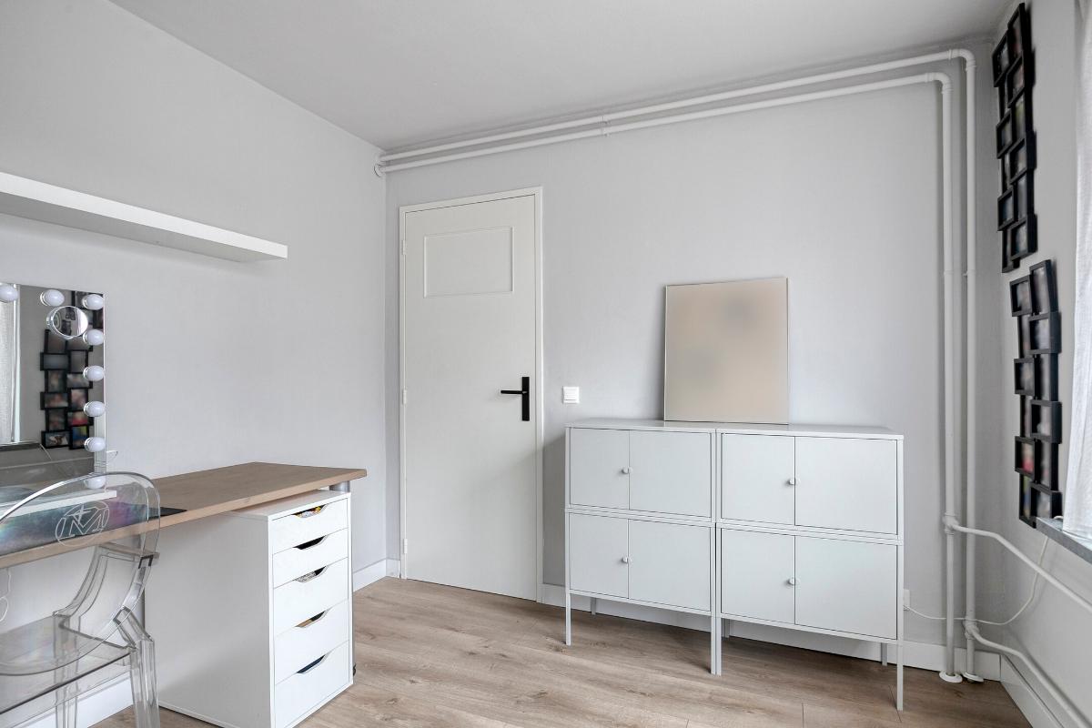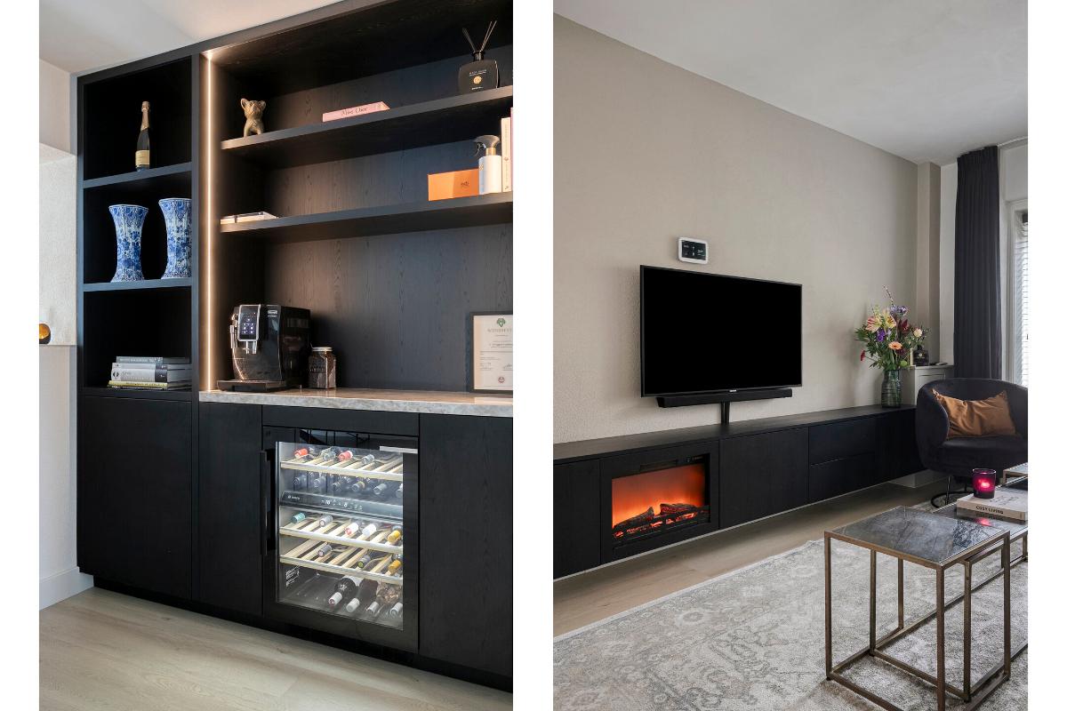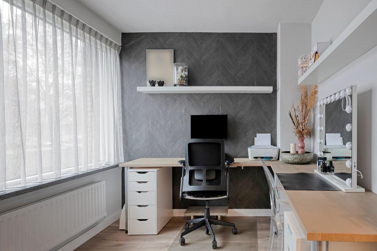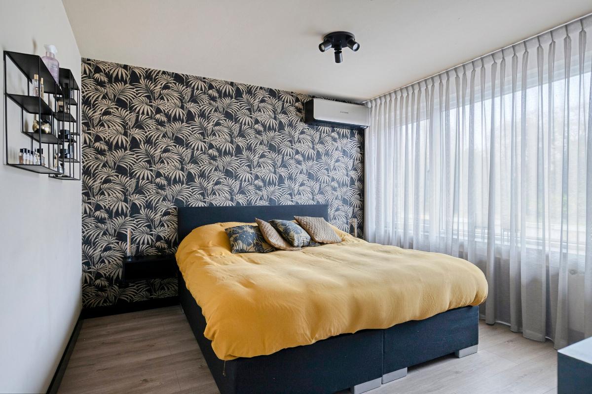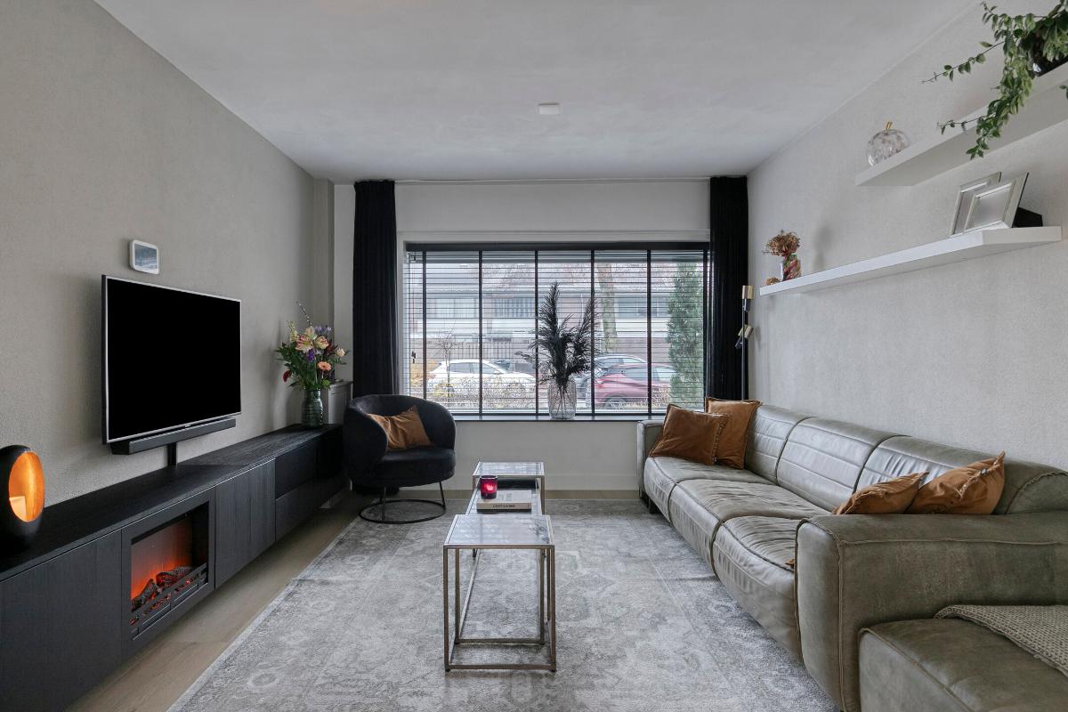 De woonkamer is het hart van het huis: een ruime, lichte leefruimte met een volledig vernieuwde erker die zorgt voor extra lichtinval en een prachtig uitzicht op de tuin. De erker is voorzien van een elektrisch bedienbare zonnescreen, die het hele jaar door voor een aangename temperatuur en privacy zorgt. De ruimte is verder uitgerust met airconditioning, een pvc-vloer met vloerverwarming (via de cv-ketel) en strakke stucwerk wanden en plafond. De open verbinding met de keuken creëert een sociale en gezellige sfeer. Tussen de keuken en de woonkamer bevindt zich een op maat gemaakte kastenwand met een wijnklimaatkast (maatwerk Studio van Gennip). Door middel van een schuifpui kunt u de tuin bereiken.