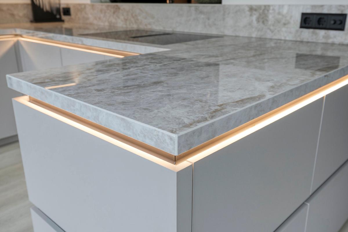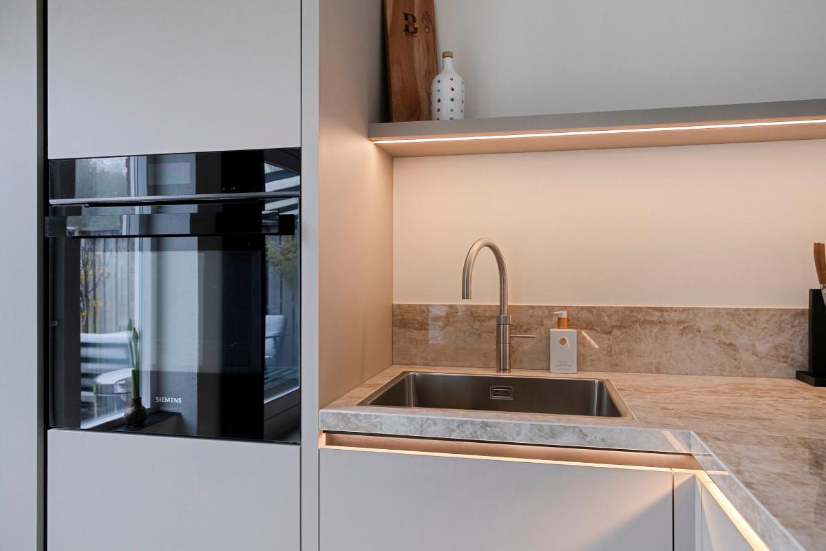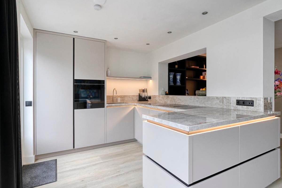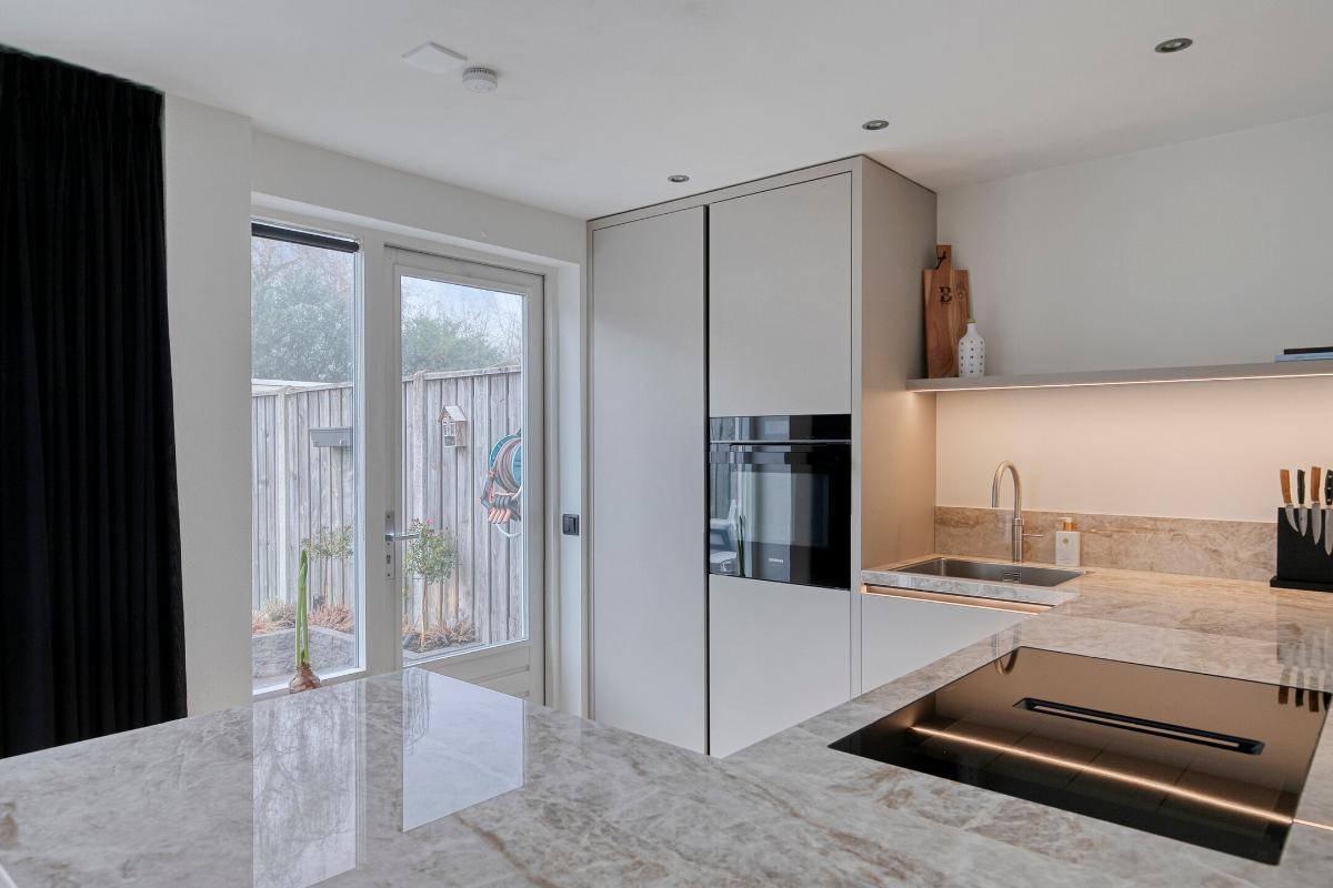 Keuken (2025, maatwerk Studio van Gennip) De keuken is volledig uitgerust met moderne apparatuur van Siemens (Studioline): vaatwasser, grote koelkast, grote vrieskast, inductie kookplaat met downdraft afzuiging, combimagnetron, Dekton (untracompact materiaal wat gemaakt is van glas, porselein en kwarts en is extreem sterk) aanrechtblad met daaronder led verlichting en een rvs spoelbak met Quoocker kraan met met (gekoelde) bruiswater functie. Deze zeer luxe keuken is de blikvanger van de woning en met het uitzicht op de tuin maakt koken hier extra plezierig.
