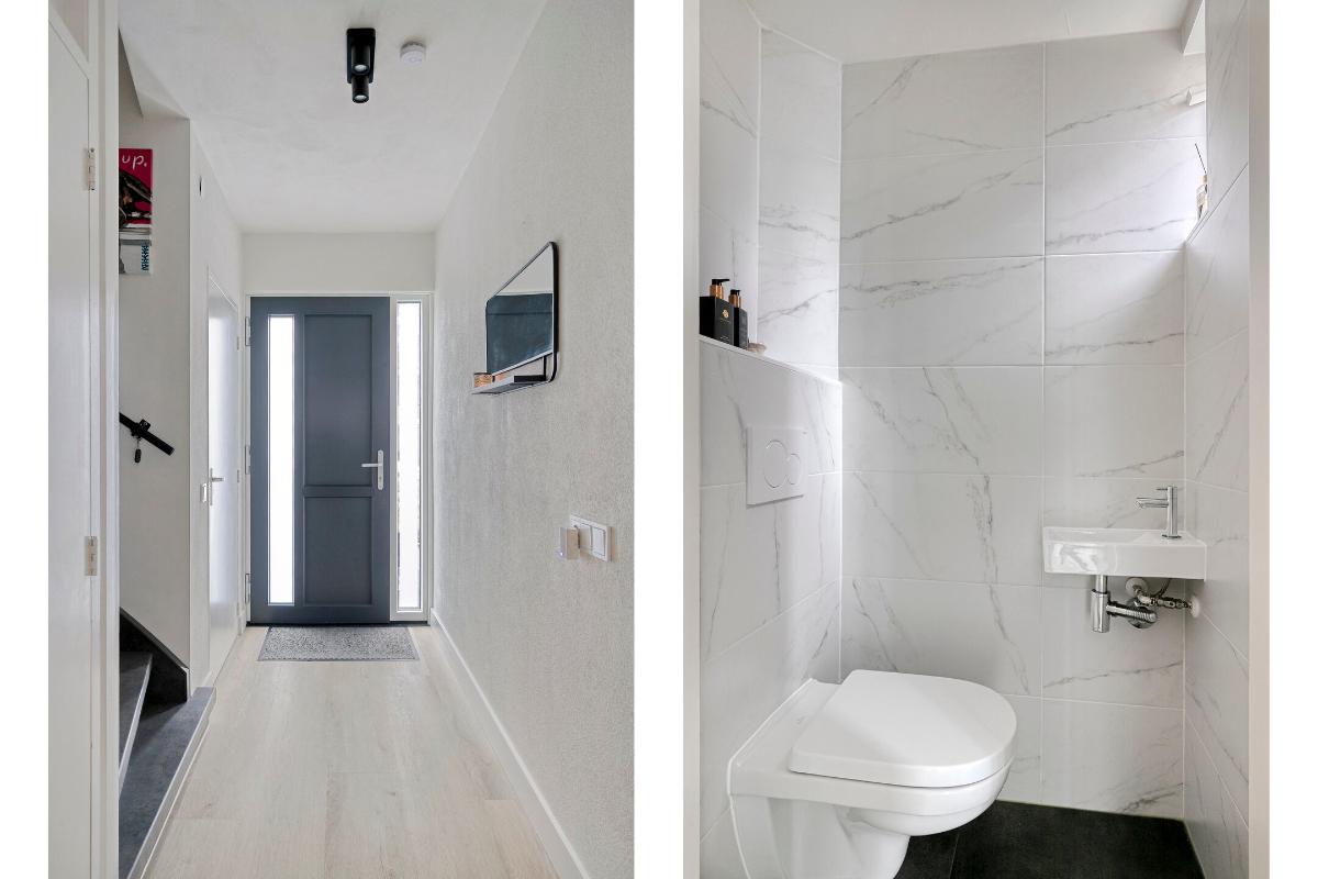 Via de entreehal betreed je een lichte en uitnodigende ruimte. De toiletruimte is volledig betegeld en voorzien van modern zwevend toilet met fonteintje, inclusief vloerverwarming (via Cv ketel).
