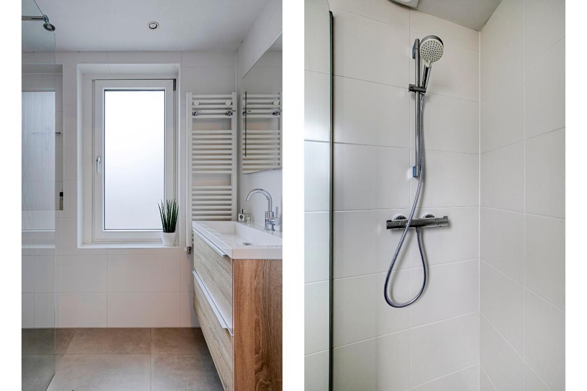 De badkamer uit 2020 is erg praktisch ingericht met een moderne inloopdouche, wastafelmeubel en designradiator.