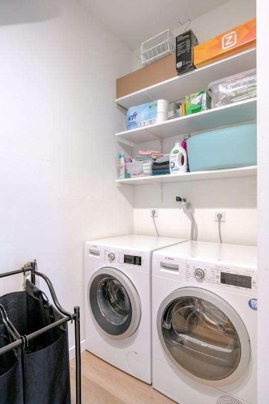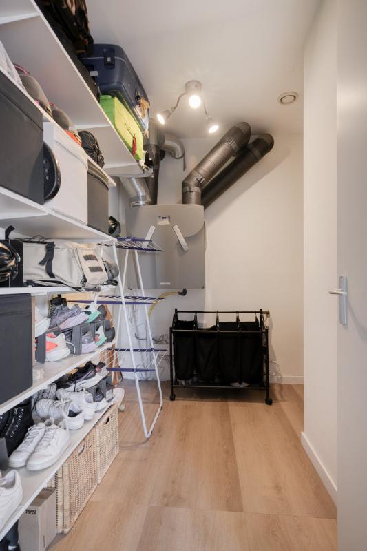 De berg-/wasruimte is eveneens afgewerkt met de voornoemde PVC-vloer en voorzien van de WTW-installatie, de verdeler t.b.v. vloerverwarming (met 9 circuits), mechanische ventilatie en aansluitingen t.b.v. de wasapparatuur.