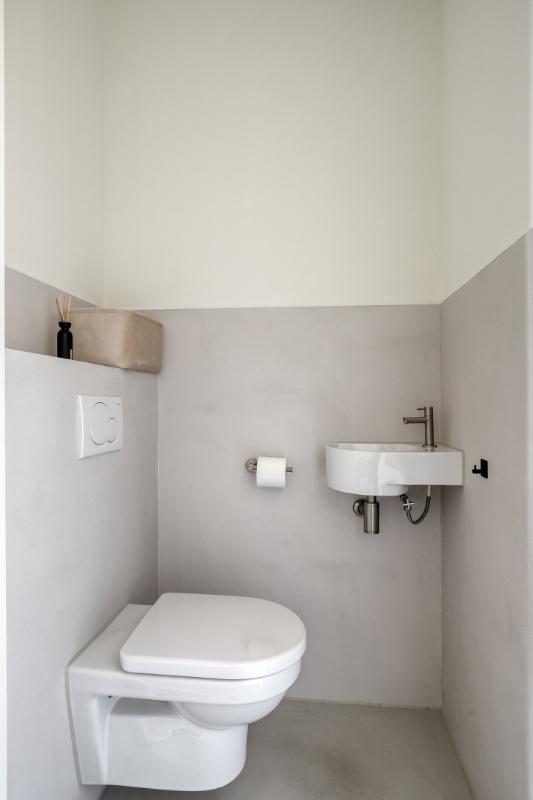 De moderne toiletruimte is volledig gestuct en voorzien van een ‘Villeroy & Boch’ wandcloset, een fonteintje en mechanische ventilatie.