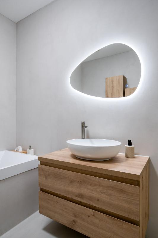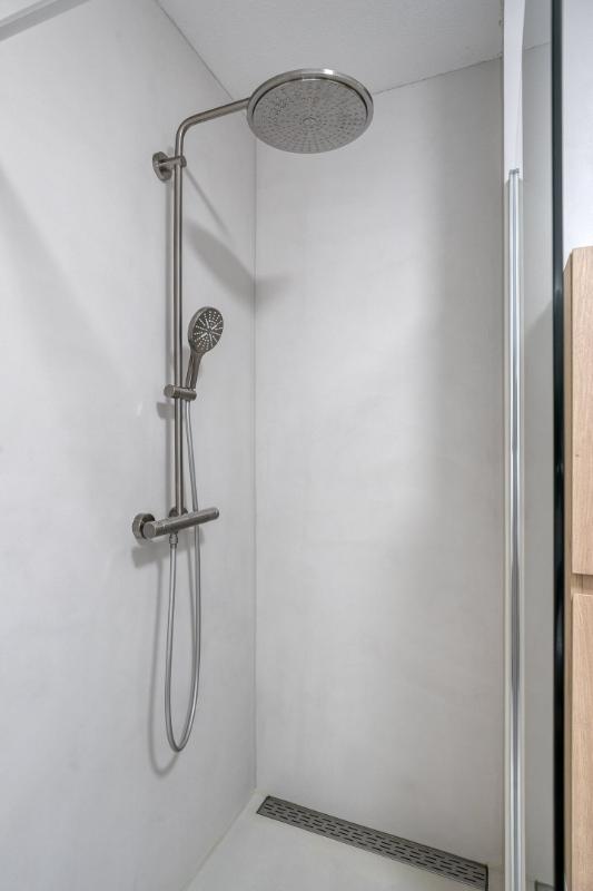 De in 2023 volledig gerenoveerde, moderne badkamer is eveneens volledig gestuct en compleet uitgerust met een groot kunststof ligbad met handdouche en een ‘Grohe’ thermostaatkraan, een ruime inloopdouche met een hardglazen wand, een regen- en handdouche met ‘Grohe’ thermostaatkraan en een RVS douchegootje, een badkamermeubel met twee laden en een waskom met een éénhendelmengkraan en een spiegel met verlichting en verwarming, 2 dubbele wandkastjes en mechanische ventilatie.