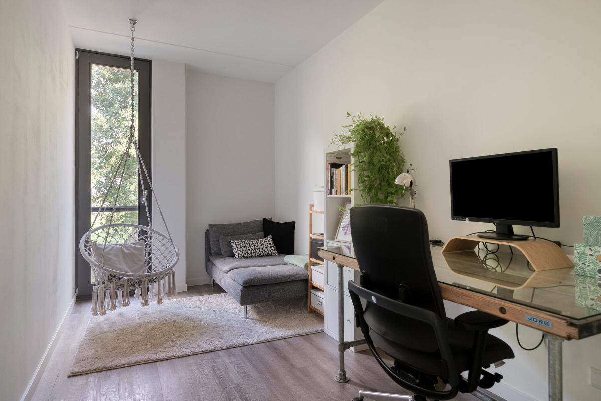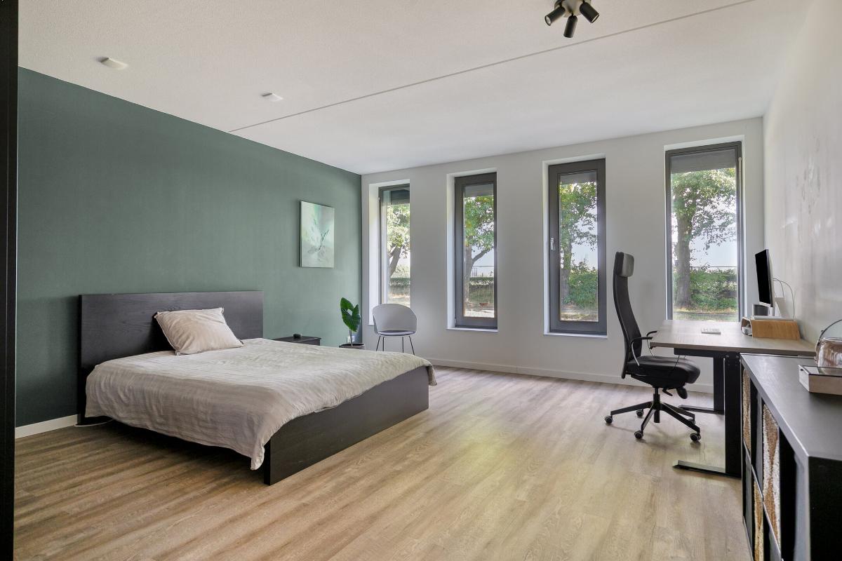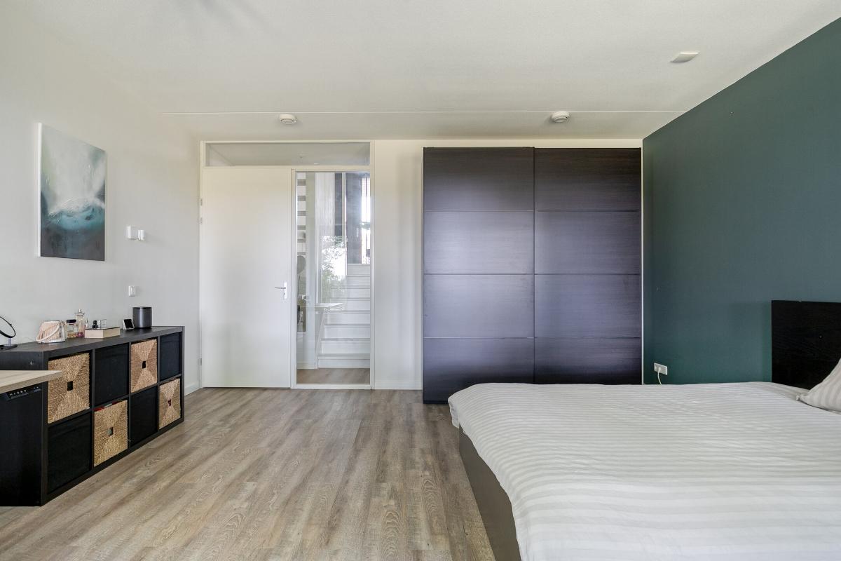 De royale master bedroom (van ruim 25 m²) aan de achterzijde van de woning is eveneens afgewerkt met een PVC-vloer en voorzien van hardhouten (draai-/kiep)ramen met hardstenen vensterbanken en manueel bedienbare rolluiken. Vanuit deze kamer heeft u uitzicht op groen en het achtergelegen fiets- en wandelpad.