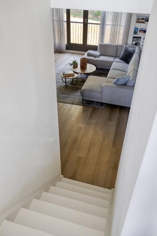 BENEDENVERDIEPING (NIVEAU -0,5): Via het portaaltje met PVC-vloer onderaan de trap heeft u toegang tot de badkamer en de master bedroom op deze woonlaag.