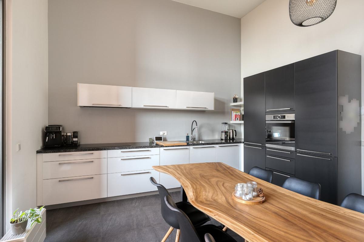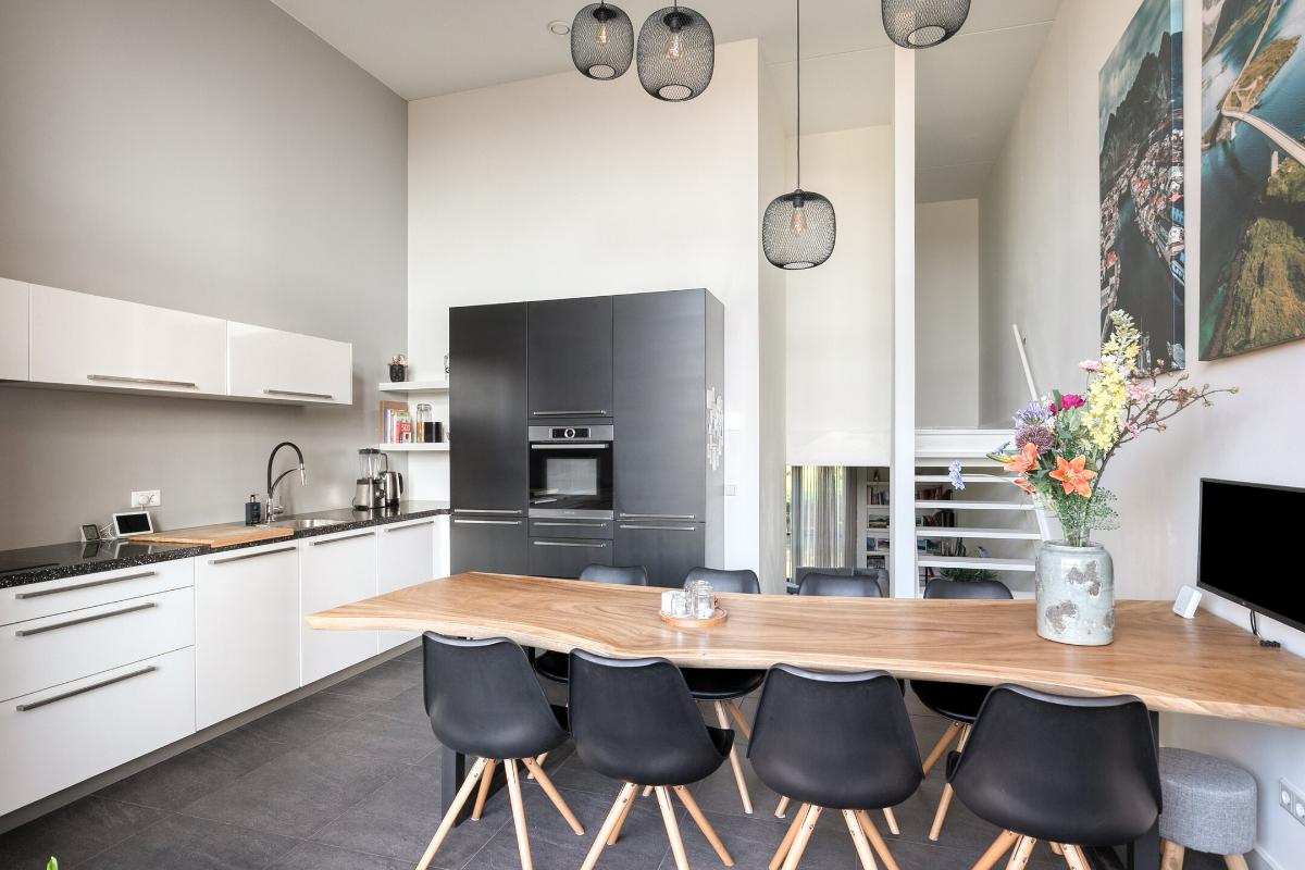 Deze riante woonkeuken (van ± 20 m²) heeft een plafondhoogte van maar liefst 4,12 meter (!), wat tezamen met de even hoge raampartijen zorgt voor een extra ruimtelijk effect en veel daglichttoetreding. Deze keuken, die eveneens is afgewerkt met een PVC-vloer, is ingericht met een moderne installatie in hoekopstelling, voorzien van onder- en bovenkasten, laden en 2 legplanken, alsmede een natuurstenen aanrechtblad met een RVS spoelbak met een handdouche en éénhendelmengkraan en een 5-pits inductiekookplaat met een RVS afzuigkap (recirculatie). Daarnaast is deze keuken uitgerust met een ingebouwde vaatwasser, een combimagnetron/heteluchtoven en een koel-vriescombinatie.