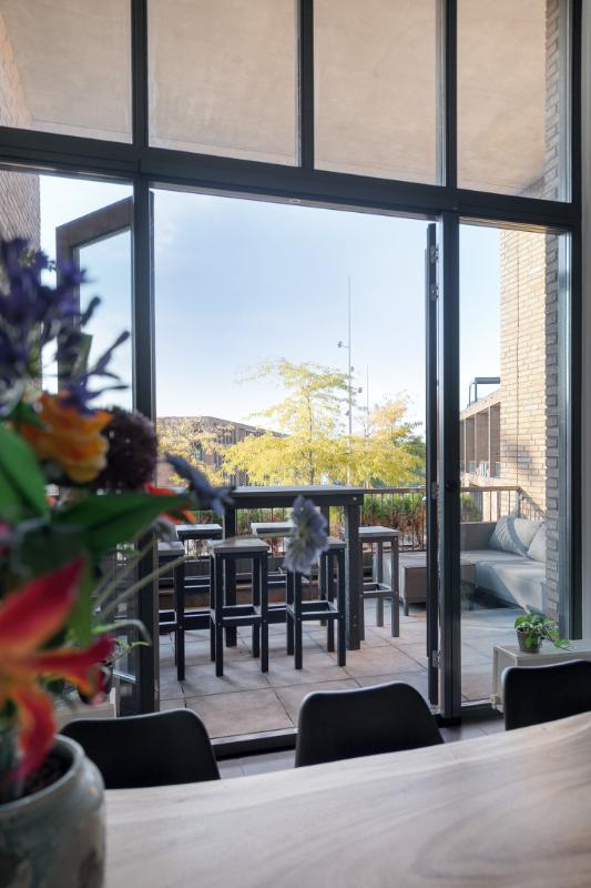 Middels de 2 openslaande deuren in de enorme pui aan de voorzijde van de keuken, welke voorzien is van een dubbel plisséhor, heeft u toegang tot de gezellige, solitaire loggia met een betontegelvloer, een stalen balkonhek met plantenbakken en een buitenlamp tegen de gevel van de woning. Hier kunt u heerlijk en rustig buiten zitten, met een vrij uitzicht over de openbare ruimte en parkeerplaatsen.