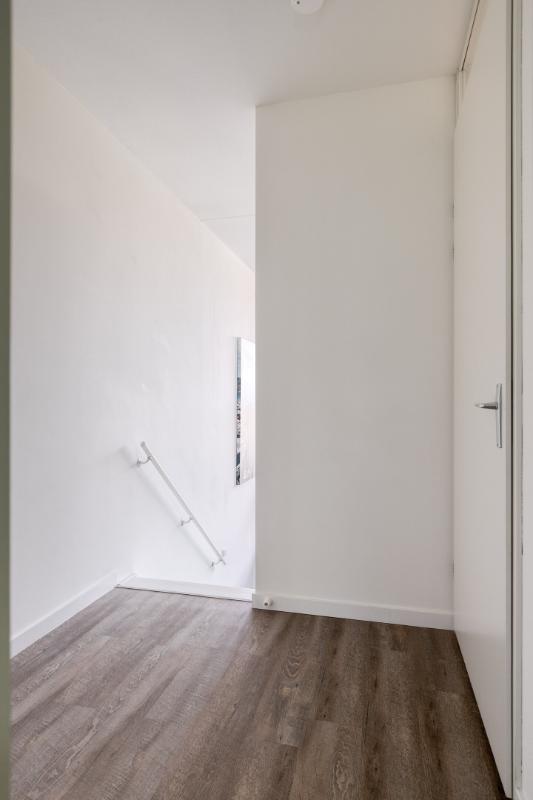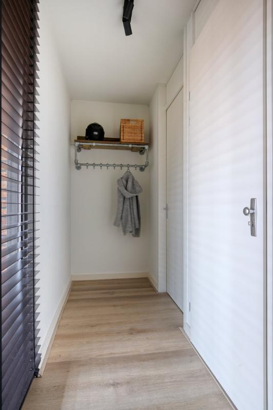 De ruime, L-vormige hal van de woning is afgewerkt met een PVC-vloer (over een bestaande tegelvloer) en voorzien van garderoberuimte en de meterkast (met o,a. een uitgebreide groepenkast, de stadsverwarmingsunit en de glasvezelaansluiting). Tevens bevindt zich hier een inpandige berg-/wasruimte, het toilet en de toegang tot het afgesloten trappenhuis naar de beneden- en bovenverdieping.