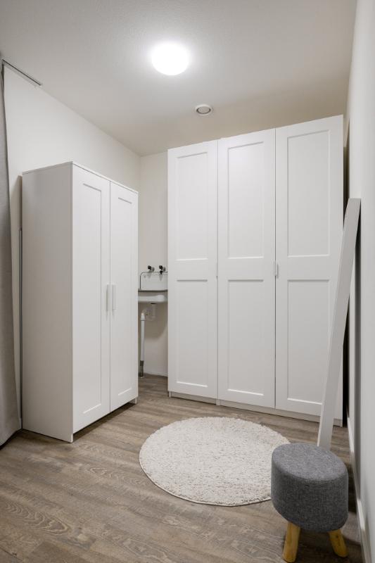 De kleed-/bergruimte (van ca. 6 m²) op deze verdieping, met eveneens de voormelde PVC-vloer, is voorzien van een uitstortgootsteen met warm en koud water. Indien gewenst kan in deze ruimte een 2e badkamer worden gecreëerd.