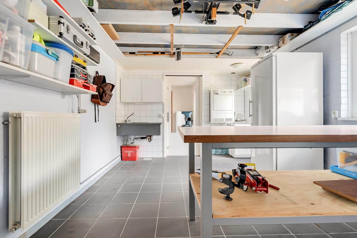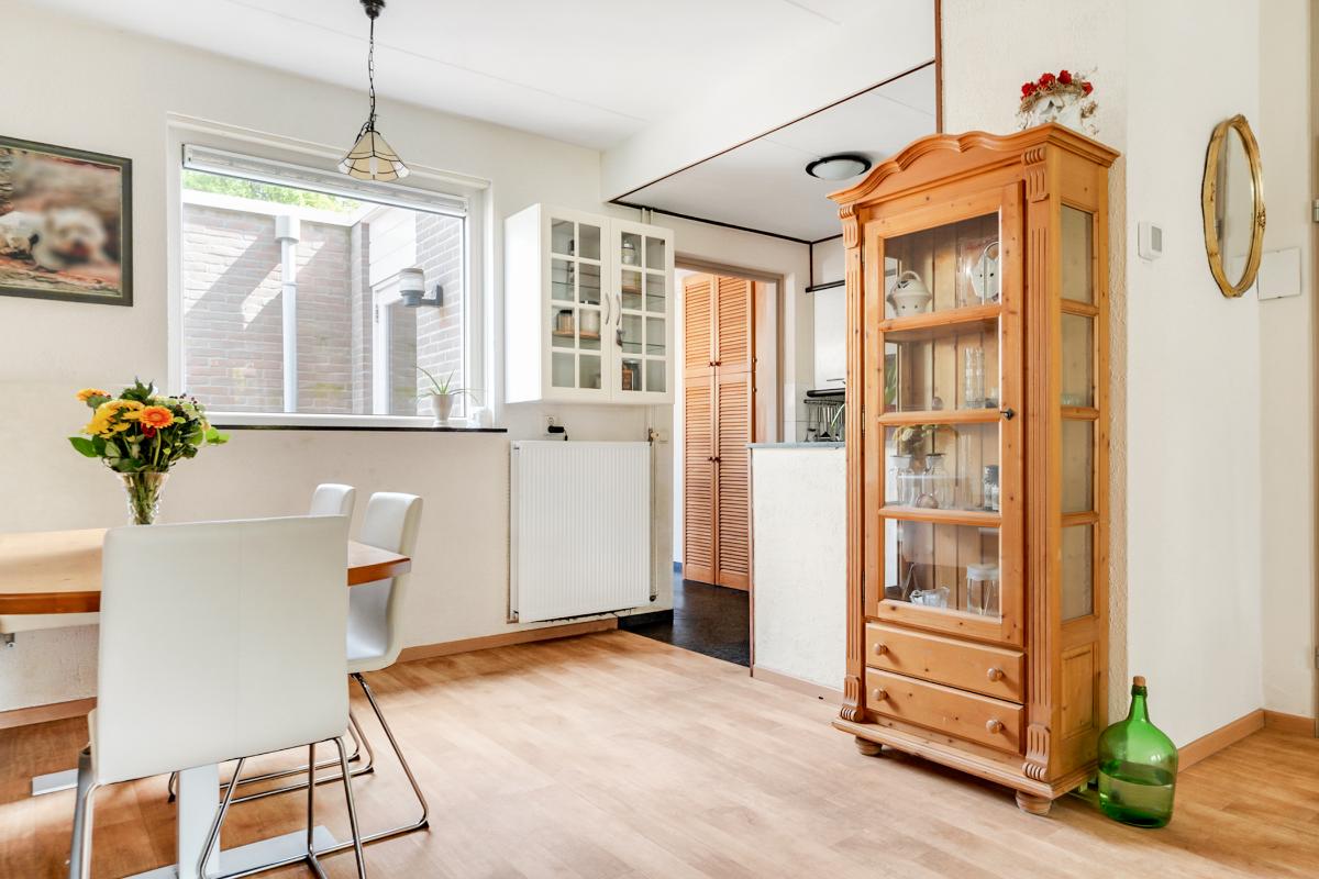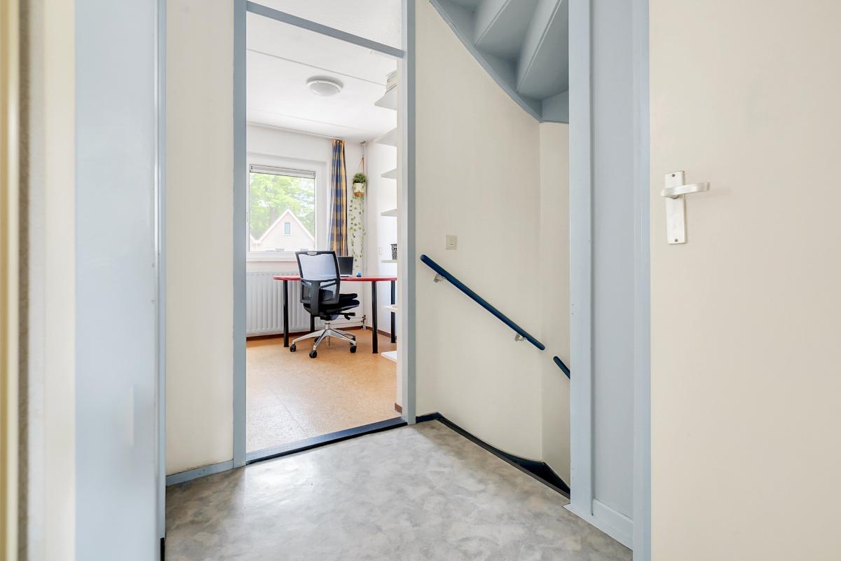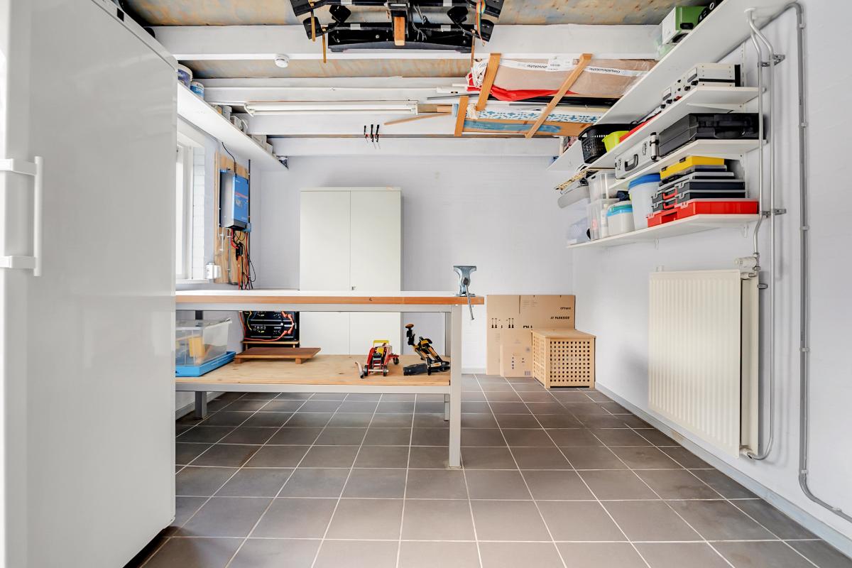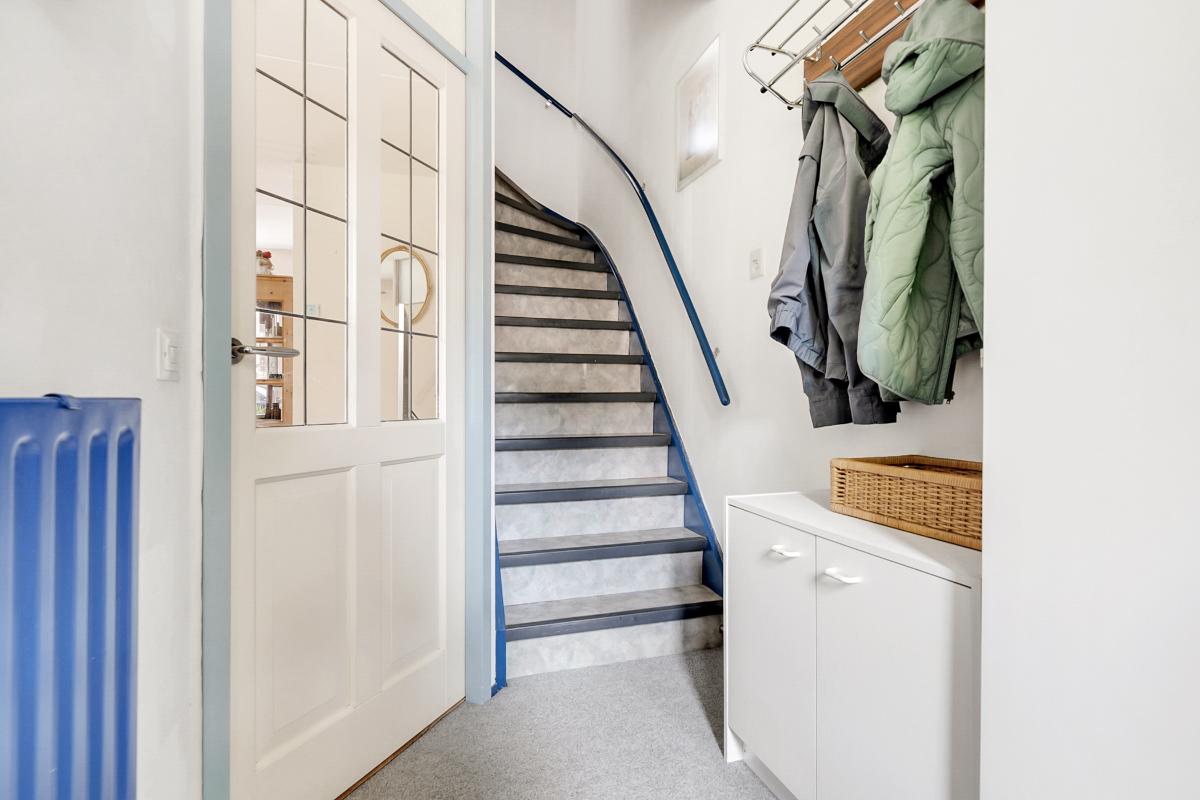 Begane grond: Bij binnenkomst via de voordeur stap je in de entreehal, die is voorzien van een meterkast, een trap naar de verdieping en de deur naar de woonkamer met aangrenzende keuken. Aan de voorzijde van de woning bevindt zich de royale, lichte woonkamer, waar het daglicht binnenvalt door de grote raampartij. Ook is er een praktische inbouwkast die onder de trap zit met voldoende ruimte voor voorraad of huishoudelijke spullen. De woonkamer loopt naadloos over in de eethoek en de keuken. Deze keuken in hoekopstelling is licht, ruim en functioneel ingericht, met veel werkruimte en inbouwapparatuur als een 5 pits gaskookplaat, een moderne afzuigkap, elektrische oven en vaatwasser. Vanuit de eethoek kijk je uit op de zijkant van de woning. Aansluitend aan de keuken bevindt zich een hal die toegang biedt tot het toilet met fontein, de achterdeur naar de tuin en een hobbyruimte. Deze hobbyruimte is een volwaardige, verwarmde, goed afgewerkte ruimte met daglicht en binnendoor bereikbaar via de hal. Hier bevindt zich ook de aansluiting voor de wasmachine. Dankzij de directe verbinding met de woning is deze ruimte ideaal in te zetten als atelier, thuiswerkplek of klusruimte.