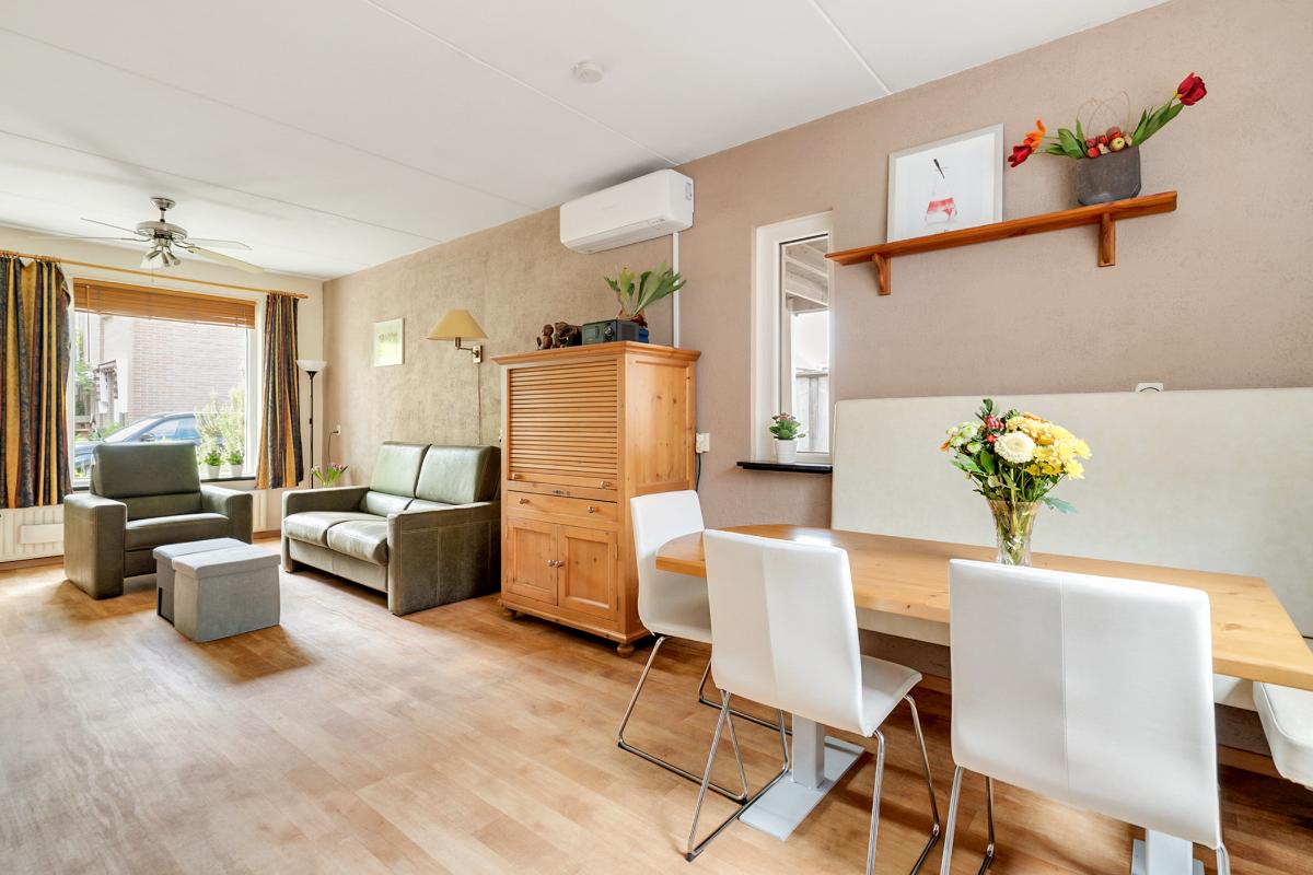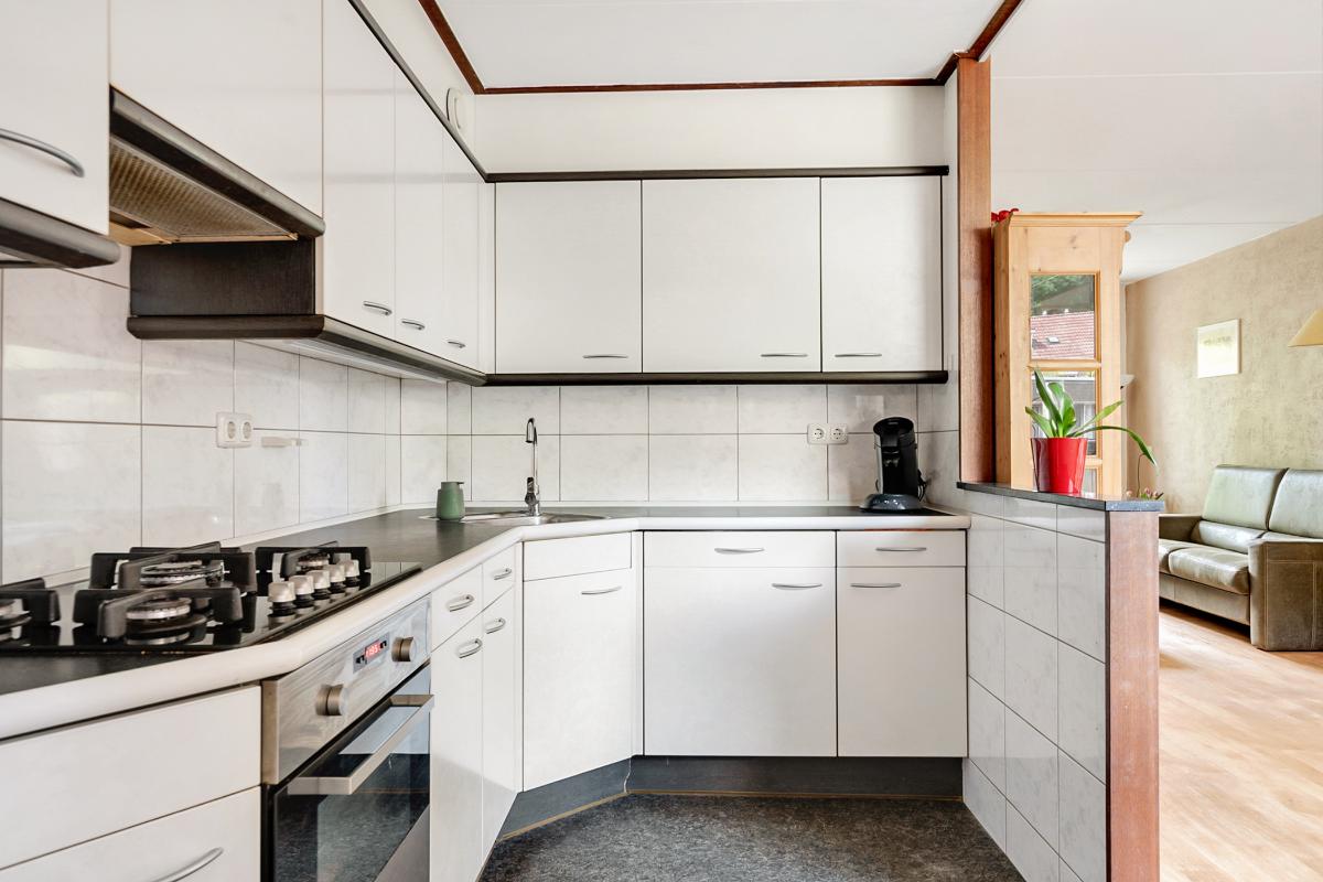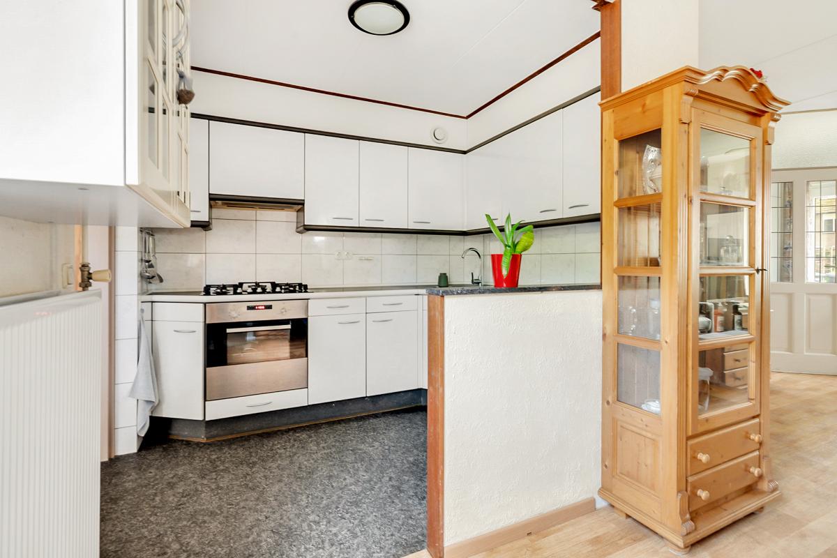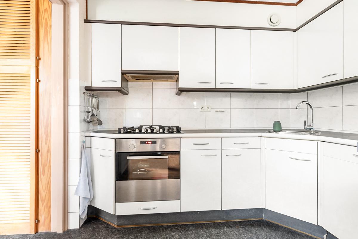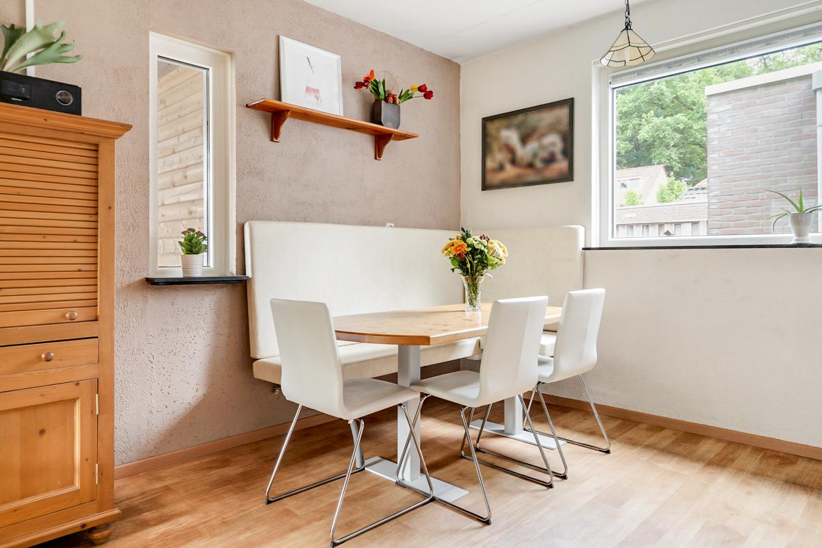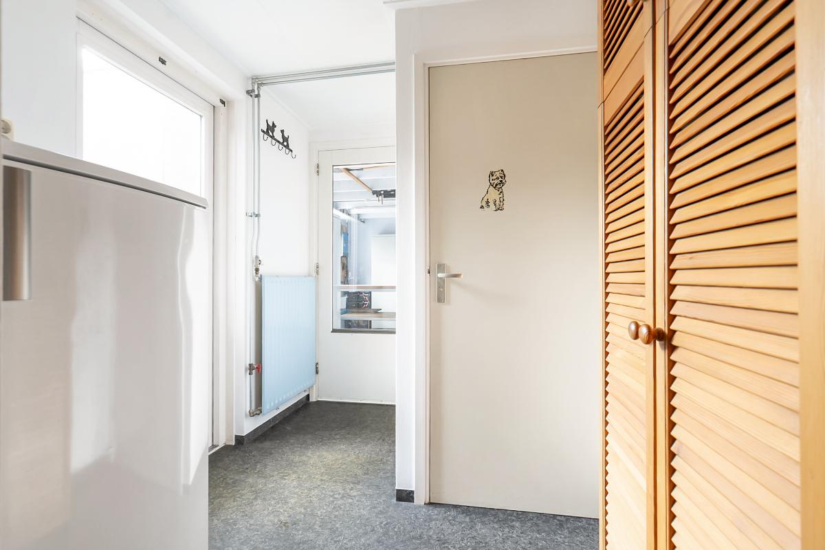 Begane grond: Bij binnenkomst via de voordeur stap je in de entreehal, die is voorzien van een meterkast, een trap naar de verdieping en de deur naar de woonkamer met aangrenzende keuken. Aan de voorzijde van de woning bevindt zich de royale, lichte woonkamer, waar het daglicht binnenvalt door de grote raampartij. Ook is er een praktische inbouwkast die onder de trap zit met voldoende ruimte voor voorraad of huishoudelijke spullen. De woonkamer loopt naadloos over in de eethoek en de keuken. Deze keuken in hoekopstelling is licht, ruim en functioneel ingericht, met veel werkruimte en inbouwapparatuur als een 5 pits gaskookplaat, een moderne afzuigkap, elektrische oven en vaatwasser. Vanuit de eethoek kijk je uit op de zijkant van de woning. Aansluitend aan de keuken bevindt zich een hal die toegang biedt tot het toilet met fontein, de achterdeur naar de tuin en een hobbyruimte. Deze hobbyruimte is een volwaardige, verwarmde, goed afgewerkte ruimte met daglicht en binnendoor bereikbaar via de hal. Hier bevindt zich ook de aansluiting voor de wasmachine. Dankzij de directe verbinding met de woning is deze ruimte ideaal in te zetten als atelier, thuiswerkplek of klusruimte.