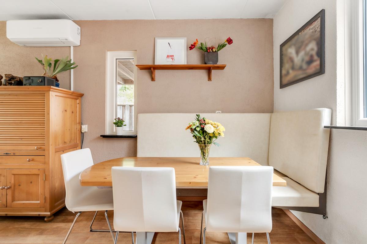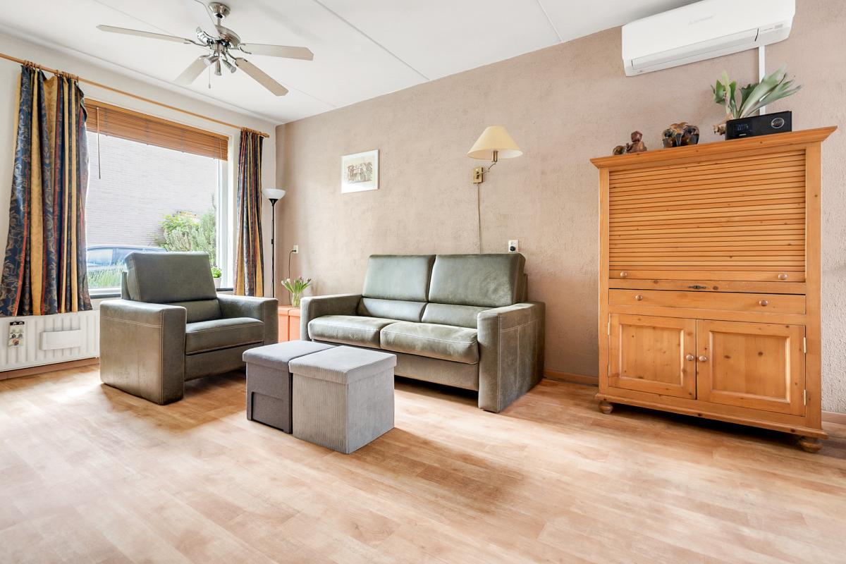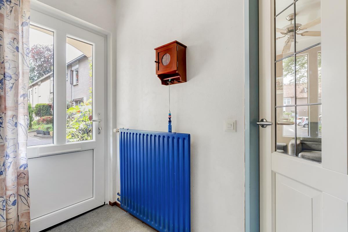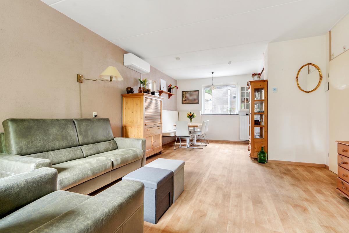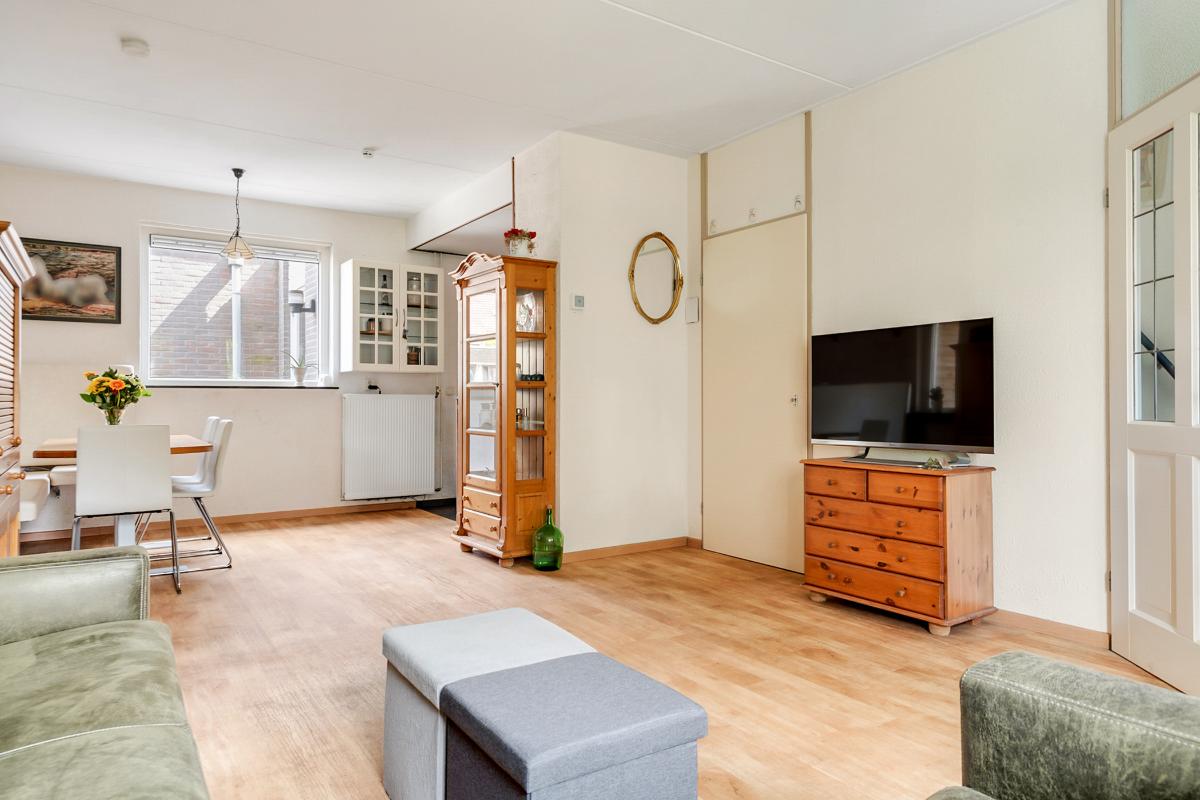 Begane grond: Bij binnenkomst via de voordeur stap je in de entreehal, die is voorzien van een meterkast, een trap naar de verdieping en de deur naar de woonkamer met aangrenzende keuken. Aan de voorzijde van de woning bevindt zich de royale, lichte woonkamer, waar het daglicht binnenvalt door de grote raampartij. Ook is er een praktische inbouwkast die onder de trap zit met voldoende ruimte voor voorraad of huishoudelijke spullen. De woonkamer loopt naadloos over in de eethoek en de keuken. Deze keuken in hoekopstelling is licht, ruim en functioneel ingericht, met veel werkruimte en inbouwapparatuur als een 5 pits gaskookplaat, een moderne afzuigkap, elektrische oven en vaatwasser. Vanuit de eethoek kijk je uit op de zijkant van de woning. Aansluitend aan de keuken bevindt zich een hal die toegang biedt tot het toilet met fontein, de achterdeur naar de tuin en een hobbyruimte. Deze hobbyruimte is een volwaardige, verwarmde, goed afgewerkte ruimte met daglicht en binnendoor bereikbaar via de hal. Hier bevindt zich ook de aansluiting voor de wasmachine. Dankzij de directe verbinding met de woning is deze ruimte ideaal in te zetten als atelier, thuiswerkplek of klusruimte.