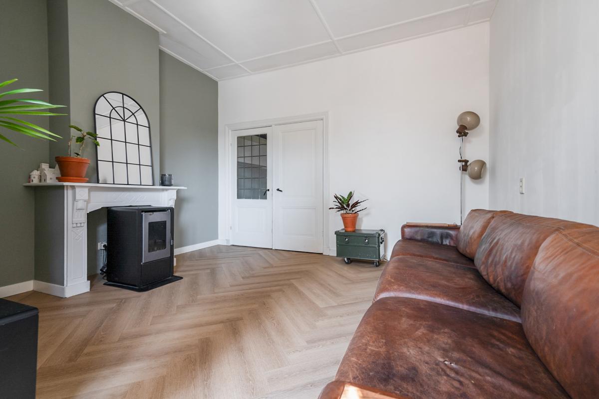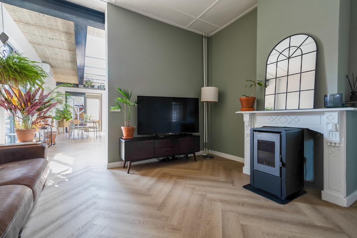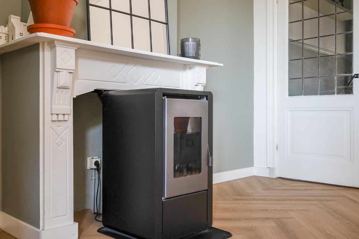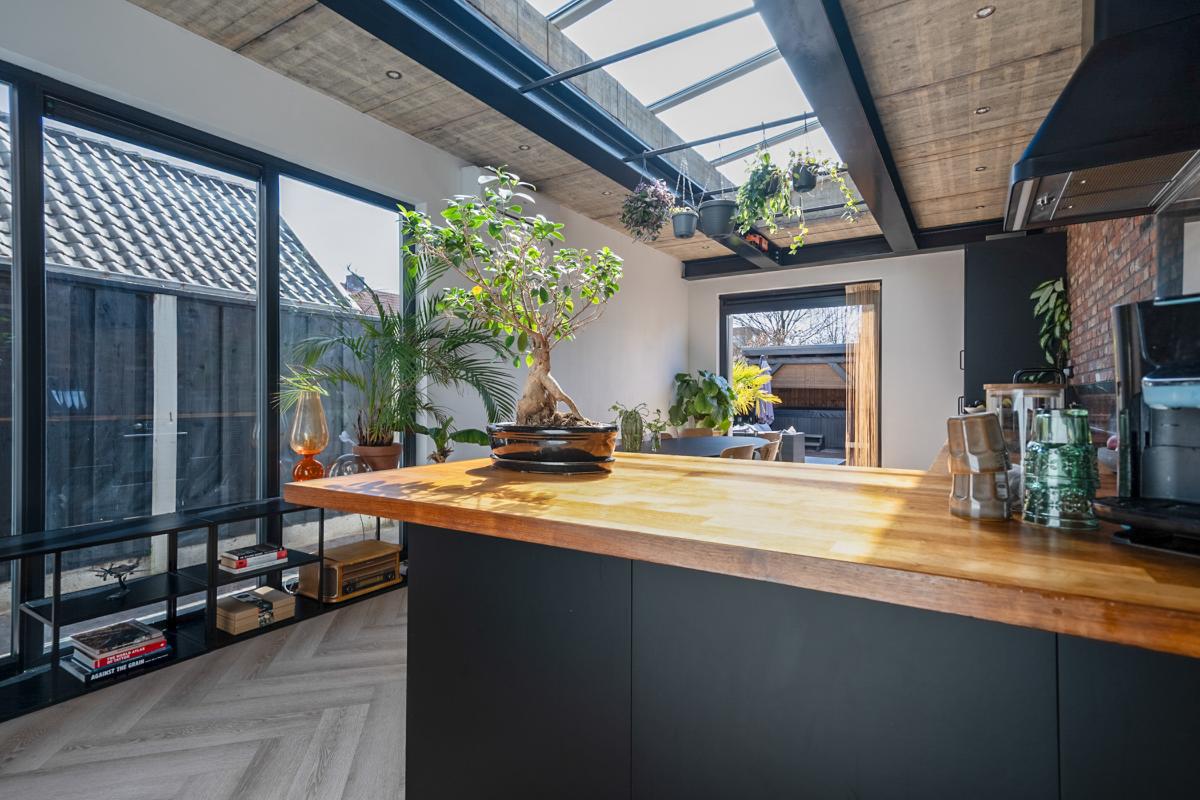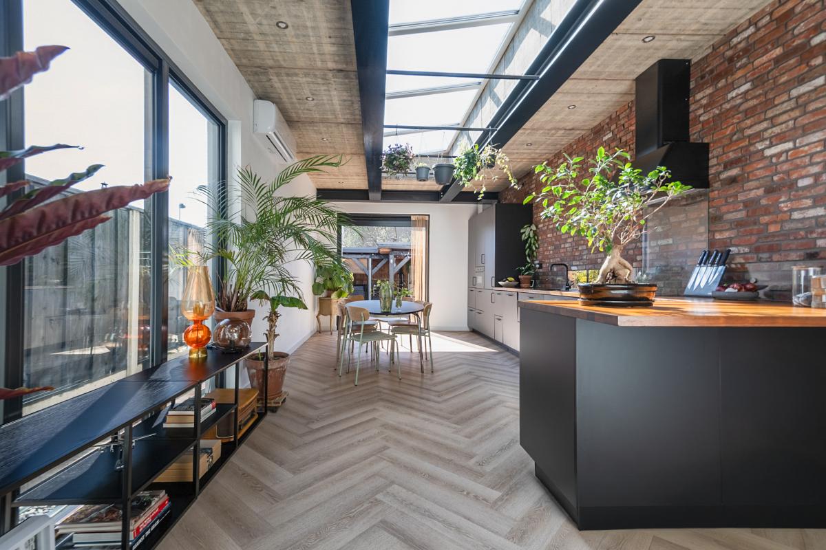 Begane grond: Zodra je binnenstapt, voel je het meteen: hier wil je gewoon wonen! En eerlijk? Dat snappen we helemaal. De sfeer, de afwerking, de details, alles klopt. De entree leidt je rechtdoor langs een praktische hal richting de gezellige woonkamer, maar in de entree heb je ook direct toegang tot een aparte voorkamer. Deze ruimte is perfect te gebruiken als thuiskantoor, speelkamer of logeerkamer. Vanuit deze kamer heb je ook toegang tot het toilet en een handige wasruimte met wasmachine aansluiting. Beide liggen op een verhoogd gedeelte, wat je het gevoel geeft dat je in een stijlvol hotel of luxe restaurant bent beland. De woonkamer is knus en sfeervol, met een fraaie haard en een vleugje vintage charme. De moderne visgraatvloer zorgt voor een chique uitstraling, gecombineerd met de authentieke glas-in-looddeuren die karakter en warmte toevoegen aan het geheel. Je zakt lekker weg op de bank, je voeten omhoog, drankje erbij en genieten maar. Extra fijn, in de winter hoef je niet bang te zijn voor koude voeten, want het huis is gedeeltelijk voorzien van vloerverwarming. En in de zomer is het heerlijk koel door de airco. Dan door naar de keuken. WAUW! Deze keuken lijkt zo uit een woonmagazine te komen. Een echte industriële eyecatcher met een stoere bakstenen muur, een robuust kookeiland en een glazen dak dat een zee aan natuurlijk licht binnenlaat. De open indeling, het luxe werkblad en moderne apparatuur maken van koken een feestje. Je vindt hier onder andere een ingebouwde oven, inductieplaat, afzuigkap, koelkast, vriezer, magnetron en vaatwasser. Alles wat je nodig hebt, en meer. Hier ga je van “ik hou niet van koken” naar “ik open binnenkort mijn eigen restaurant”. De grote openslaande glazen tuindeuren zorgen ervoor dat binnen en buiten naadloos in elkaar overlopen. Want geef toe, waarom kiezen tussen woonkamer of tuin, als je ook van beide tegelijk kunt genieten.