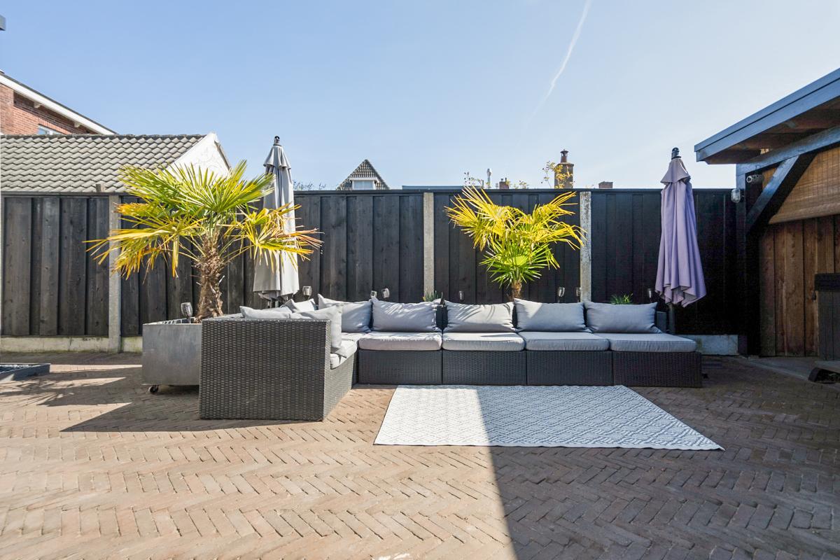 Tuin: Stap de woonkamer uit en laat je verrassen: achter de openslaande tuindeuren wacht een heerlijke buitenruimte gelegen op het zuiden. Geen gedoe met onderhoud, geen gesjouw met grasmaaiers, deze tuin is slim betegeld en altijd klaar voor gebruik. In de ruime L-vormige overkapping achter in de tuin kun je genieten van de lange zomeravonden met vrienden of luisteren naar het zachte getik van de regen op het dak terwijl je knus kunt blijven zitten. De tuin is bereikbaar via de openslaande tuindeuren van de woonkeuken, maar ook via de poort aan de zijkant van de woning.