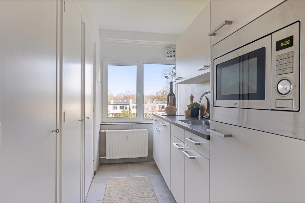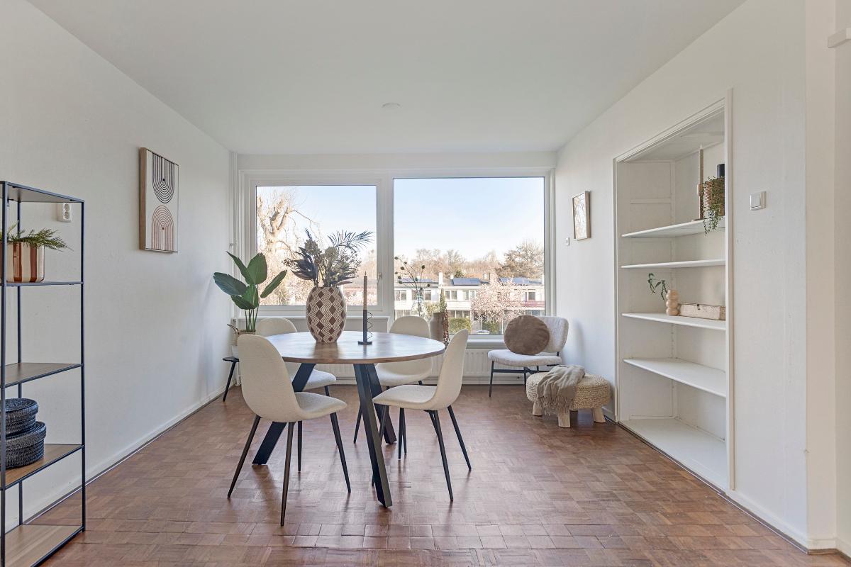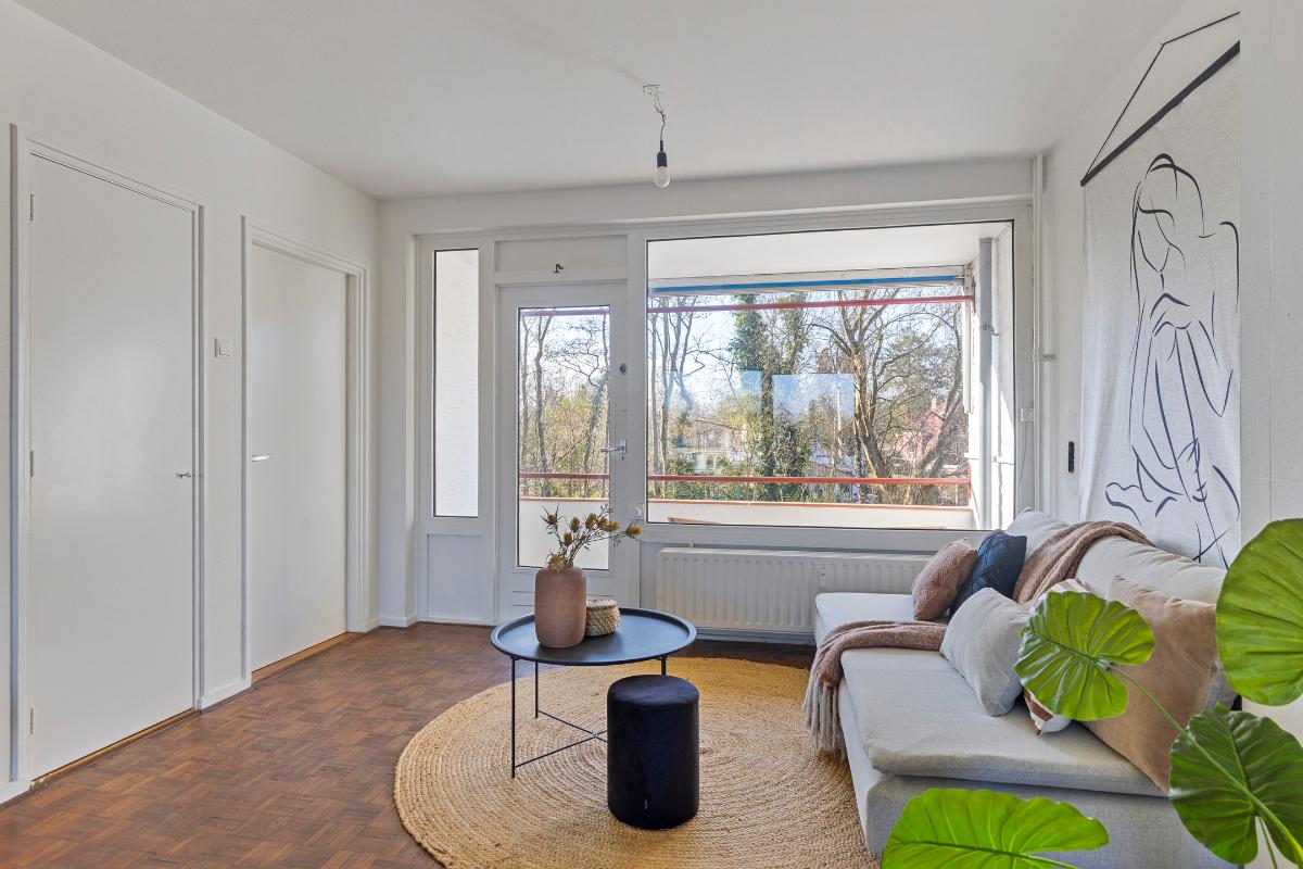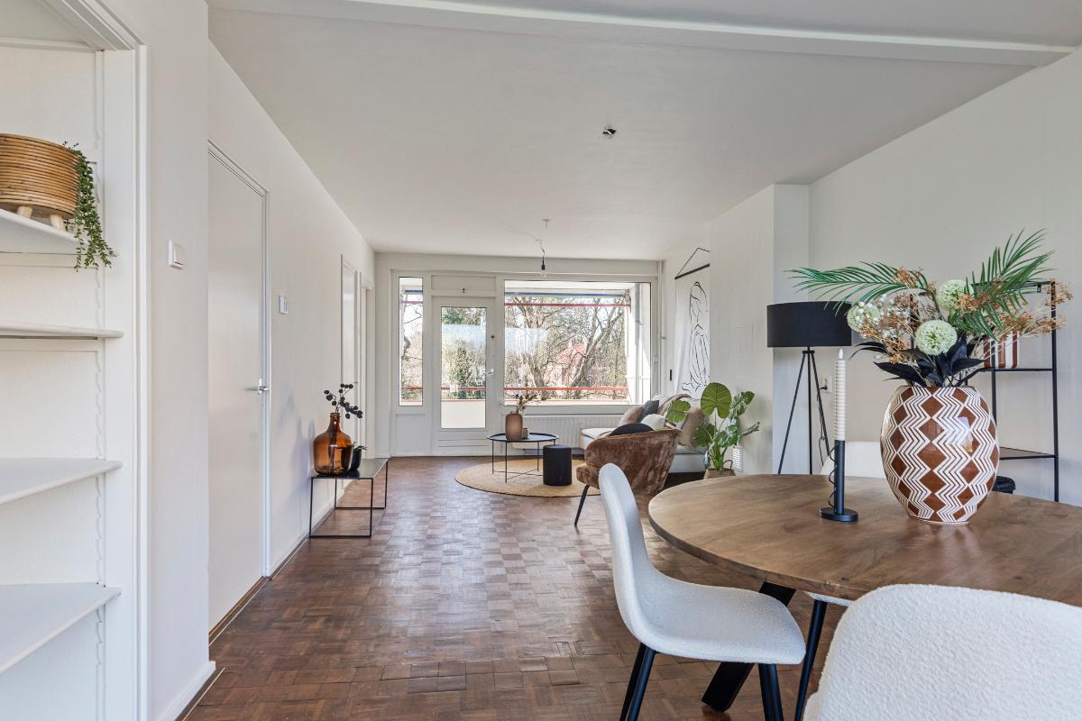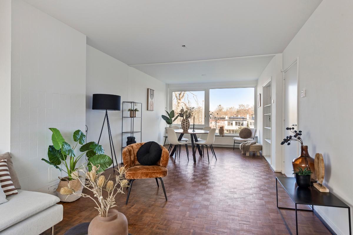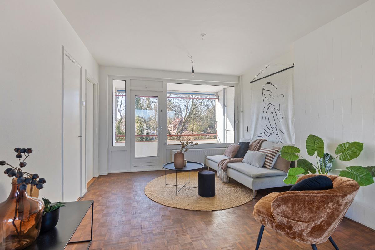 Van drie- naar twee-kamers Oorspronkelijk heeft het appartement een woonkamer en twee slaapkamers. Eén van de slaapkamers is met de woonkamer samengevoegd tot een ‘’heuse balzaal” van een woonkamer. De woonkamer is bijzonder zonnig en heeft zowel aan de voor- als aan de achterzijde een heerlijk vrij uitzicht.