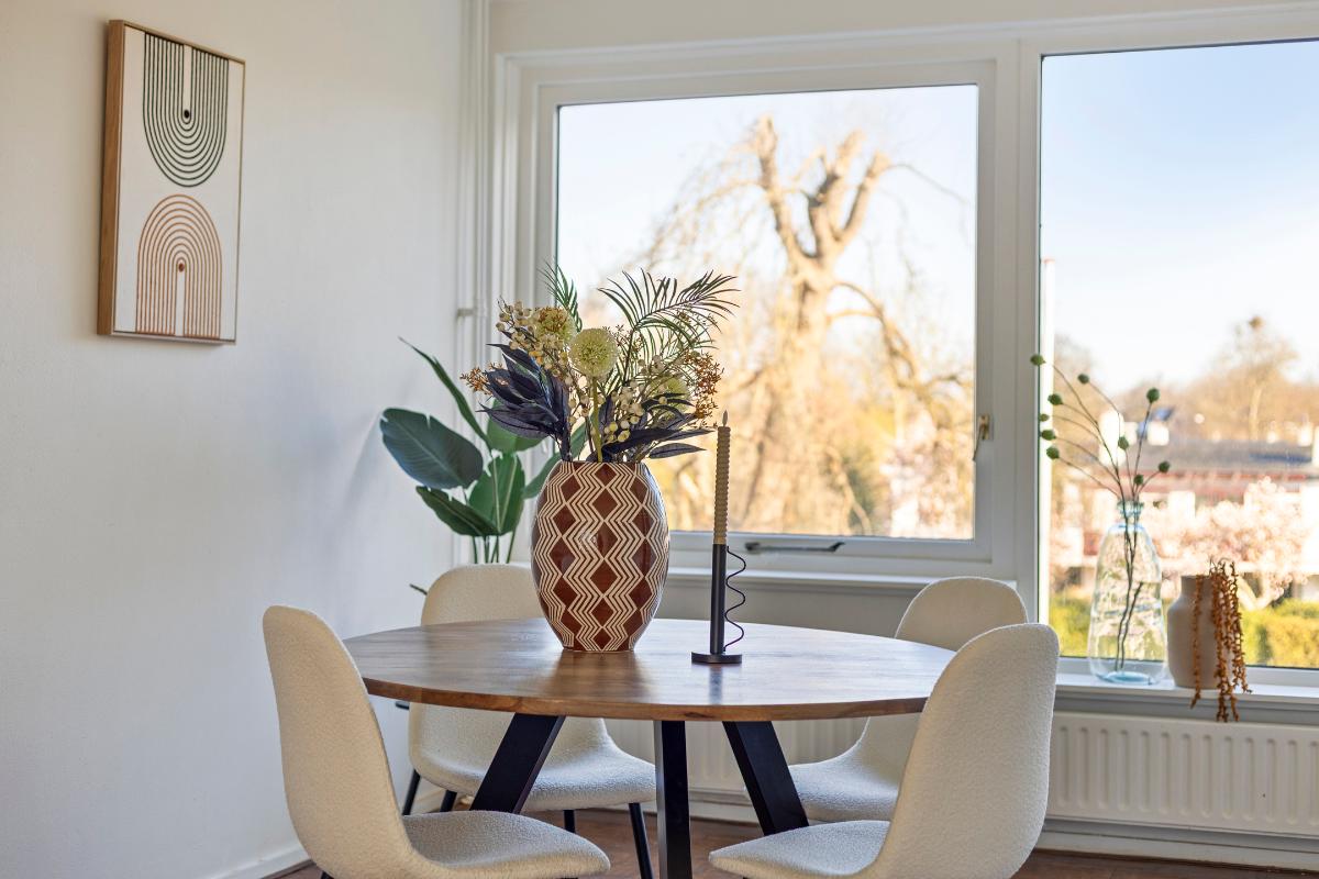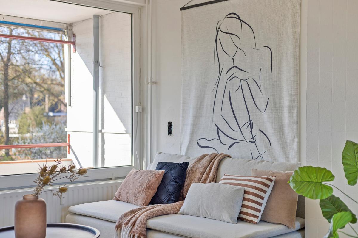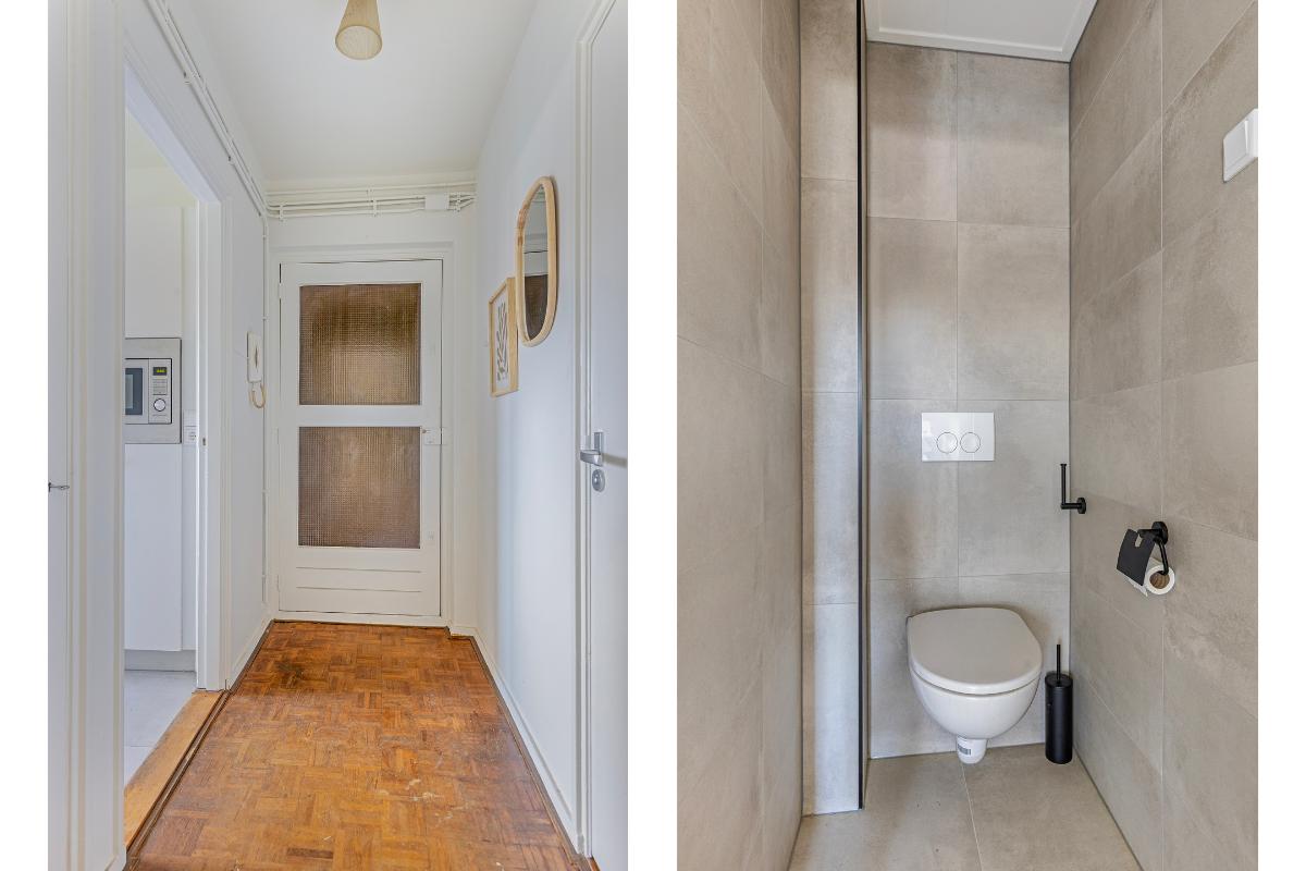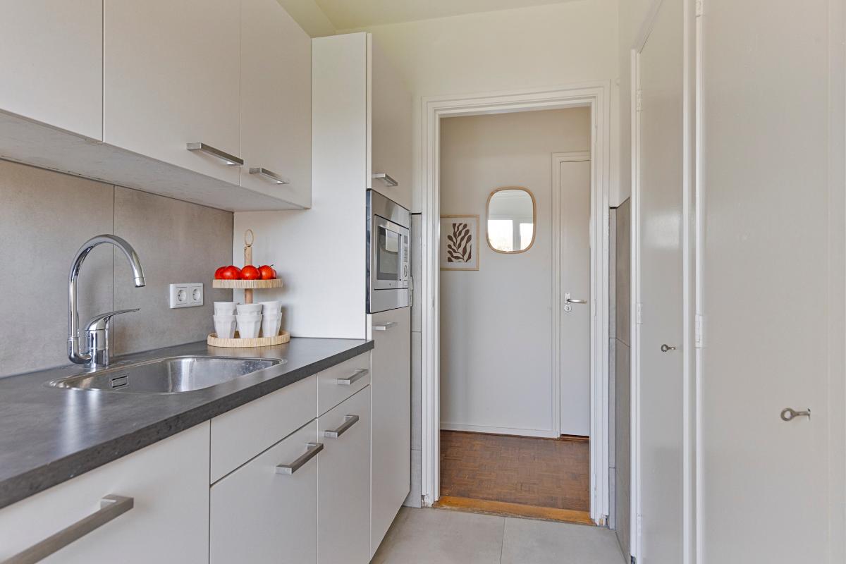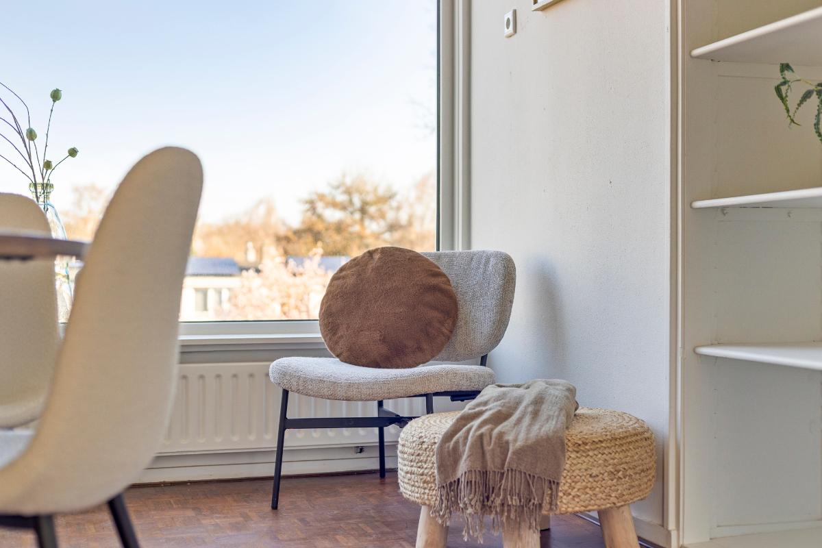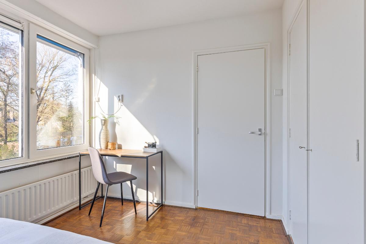 Van drie- naar twee-kamers Oorspronkelijk heeft het appartement een woonkamer en twee slaapkamers. Eén van de slaapkamers is met de woonkamer samengevoegd tot een ‘’heuse balzaal” van een woonkamer. De woonkamer is bijzonder zonnig en heeft zowel aan de voor- als aan de achterzijde een heerlijk vrij uitzicht.