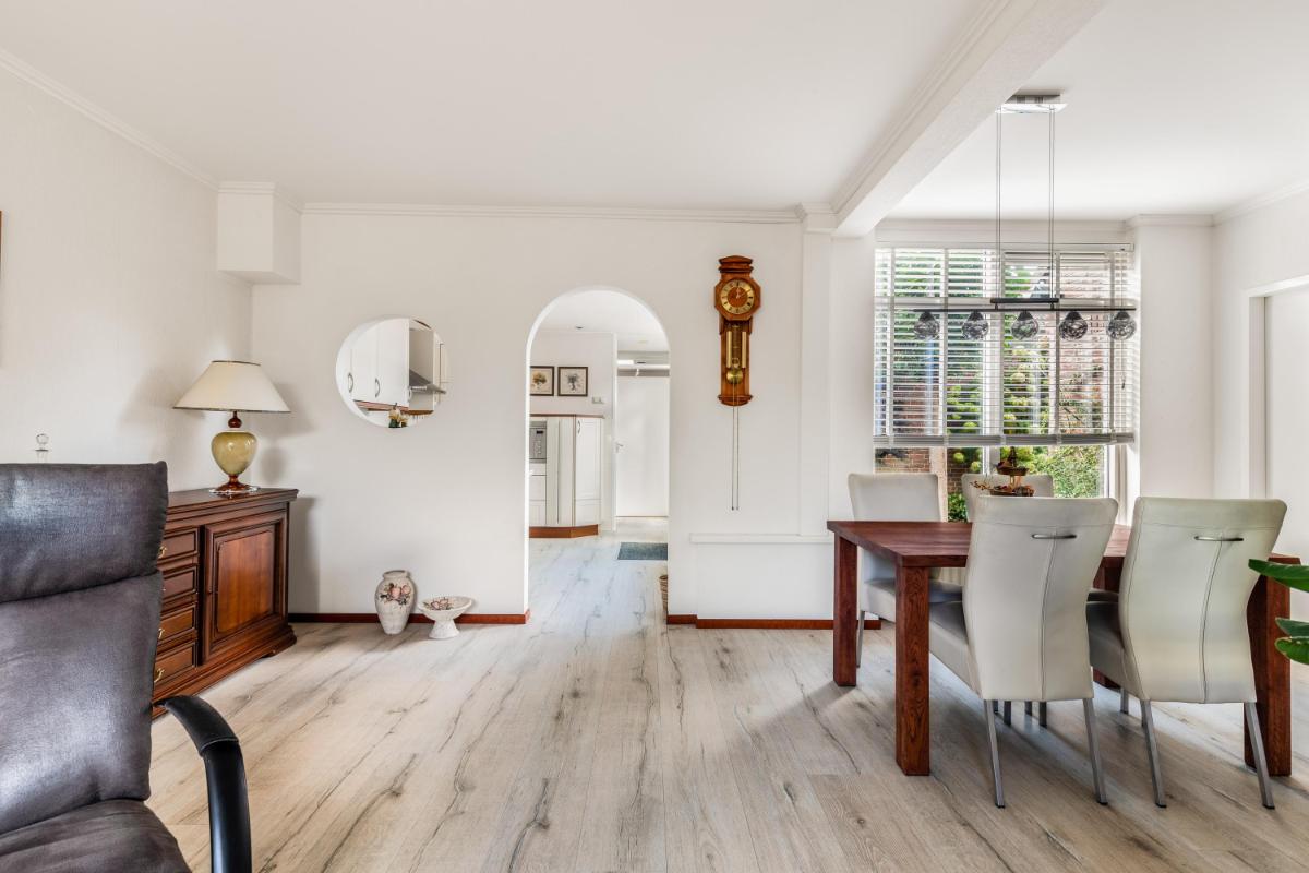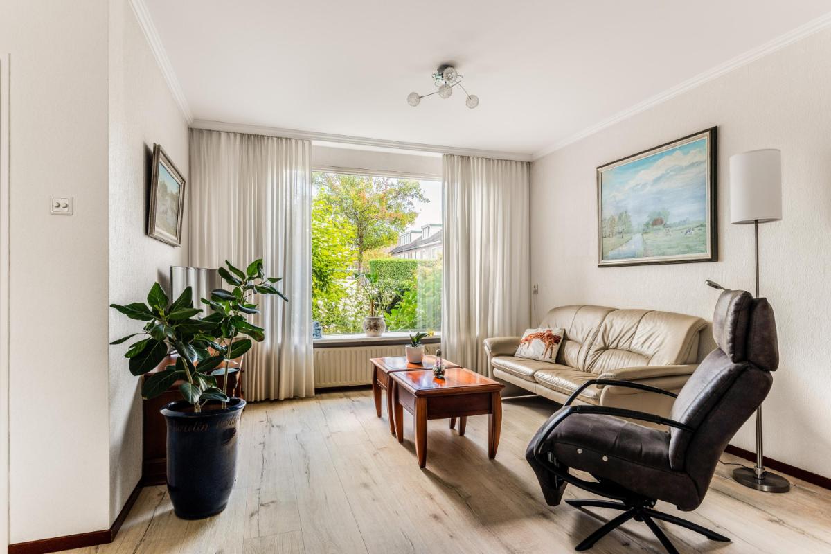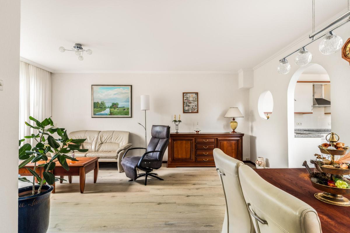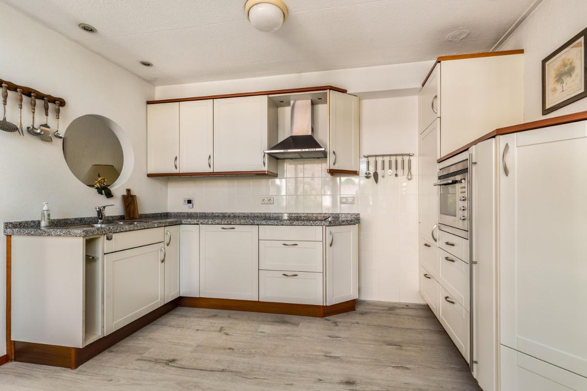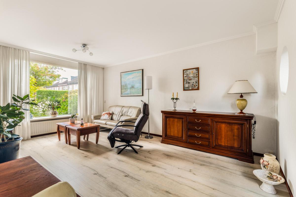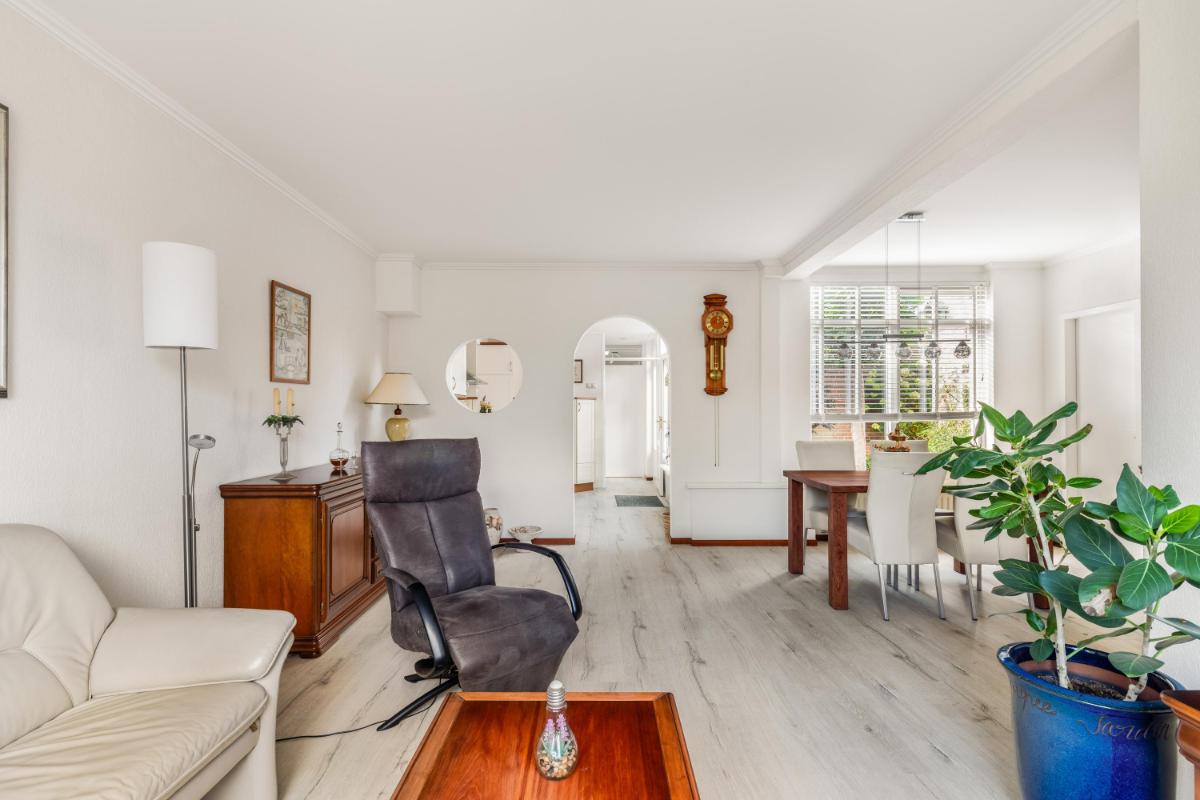 De woonkamer, met veel lichtinval, ligt aan de voorzijde van de woning met een zitgedeelte en het eetgedeelte aan de achterzijde, met uitzicht op de patio. De open keuken ligt centraal in de woning en is opgesteld in een combinatie van een hoekopstelling en een rechte wandopstelling met hoge kasten en diverse inbouwapparatuur.