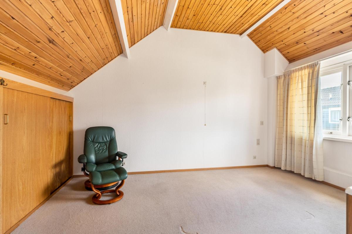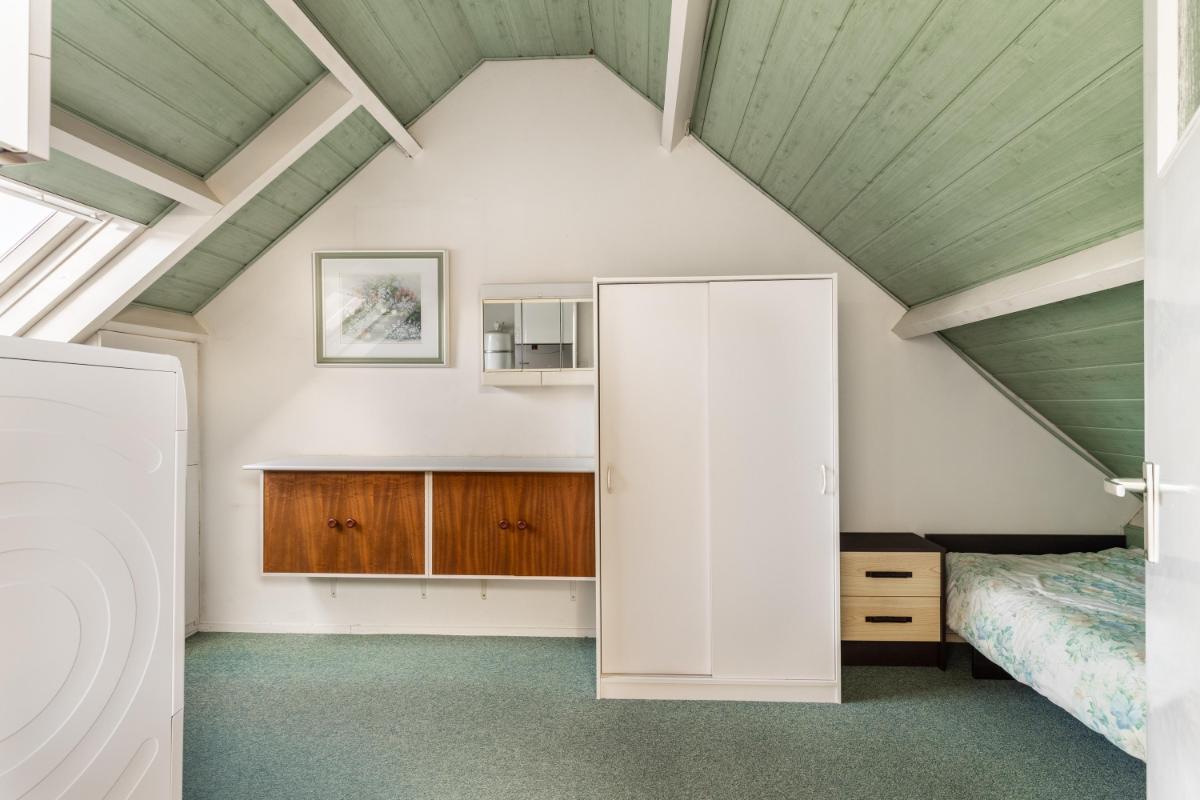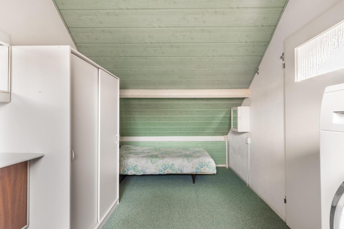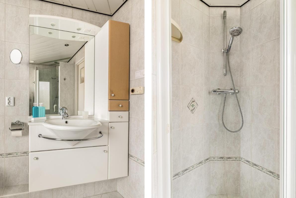Grenzend aan de keuken ligt de ruime slaapkamer op de begane grond, voorzien van een lichtkoepel. Tevens is hier een tweede badkamer gerealiseerd met een moderne inloopdouche en wastafel – ideaal voor wie gelijkvloers wil wonen of gasten wil ontvangen.
