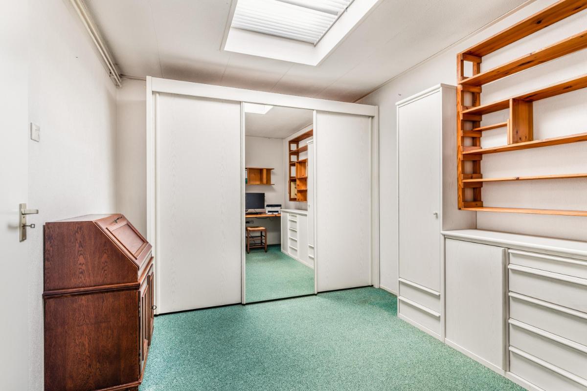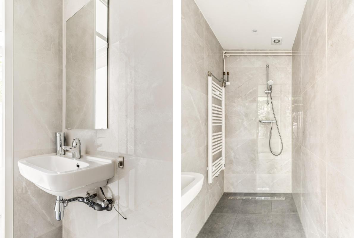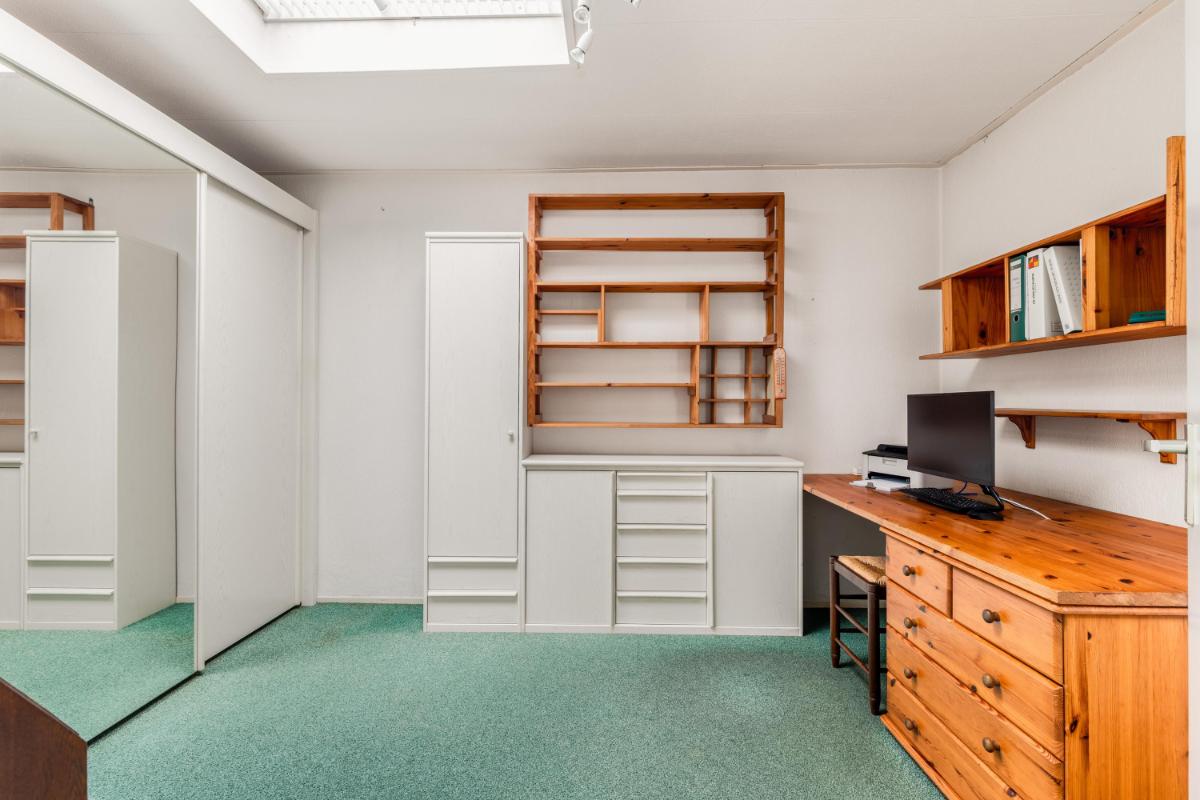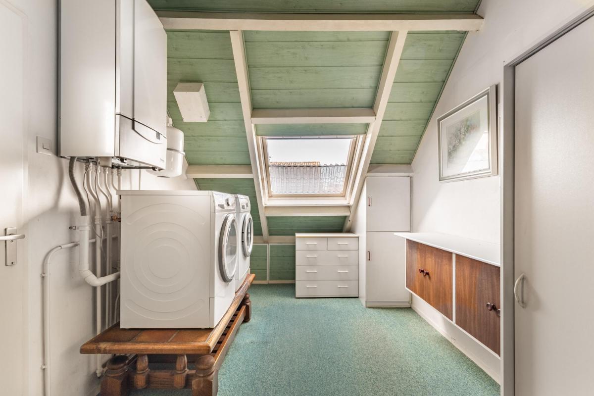 Grenzend aan de keuken ligt de ruime slaapkamer op de begane grond, voorzien van een lichtkoepel. Tevens is hier een tweede badkamer gerealiseerd met een moderne inloopdouche en wastafel – ideaal voor wie gelijkvloers wil wonen of gasten wil ontvangen.