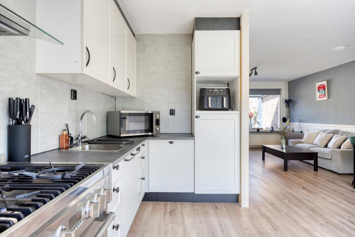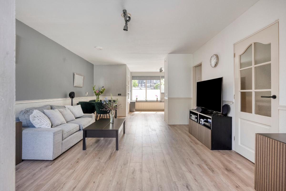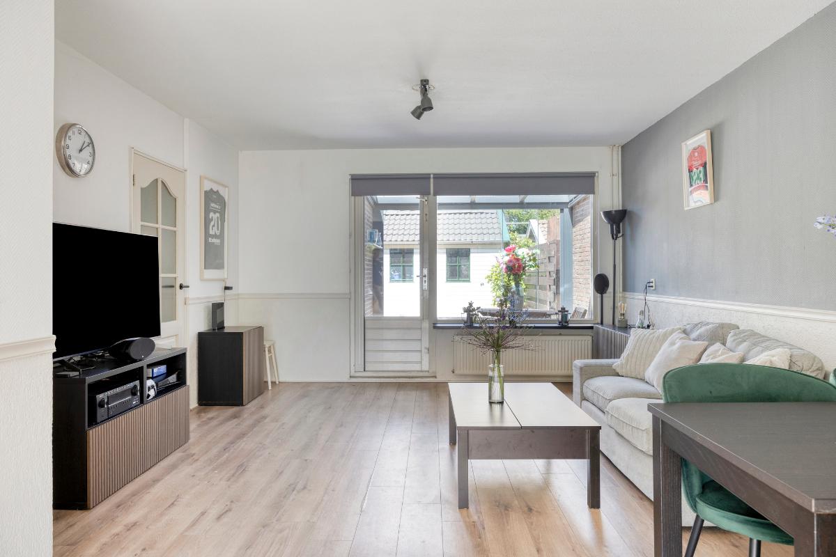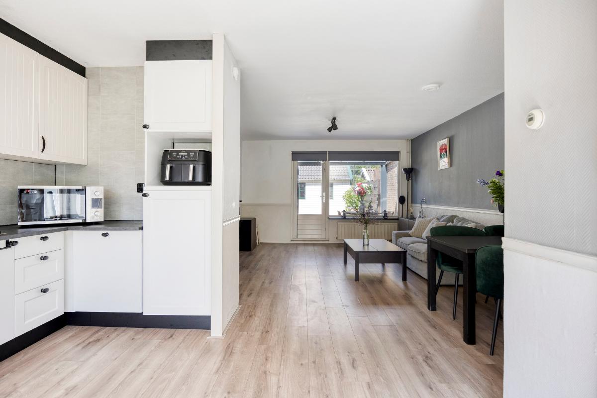 Bij binnenkomst valt meteen op hoe licht en ruim de woning aanvoelt. Aan de voorzijde bevindt zich de open keuken, voorzien van diverse inbouwapparatuur. Deze loopt over in de tuingerichte woonkamer, waar een aangebouwde serre zorgt voor extra leefruimte en een prettige verbinding met de achtertuin. De tuin is gelegen op het noordwesten en biedt daardoor veel zon in de middag en avond – perfect om na een drukke dag te ontspannen.