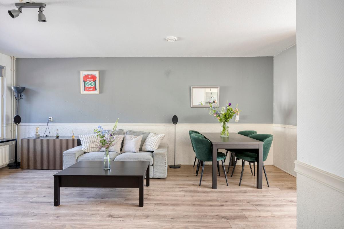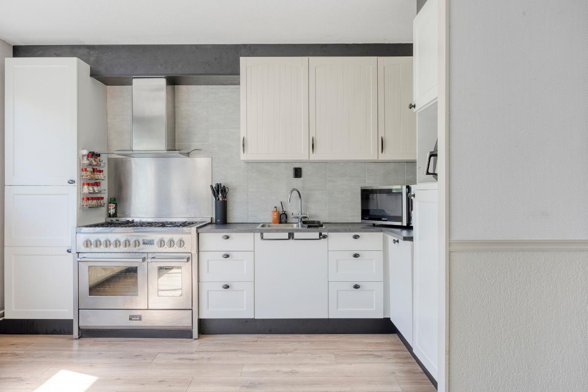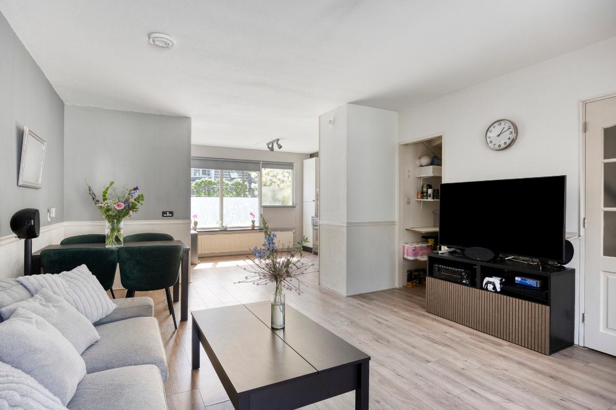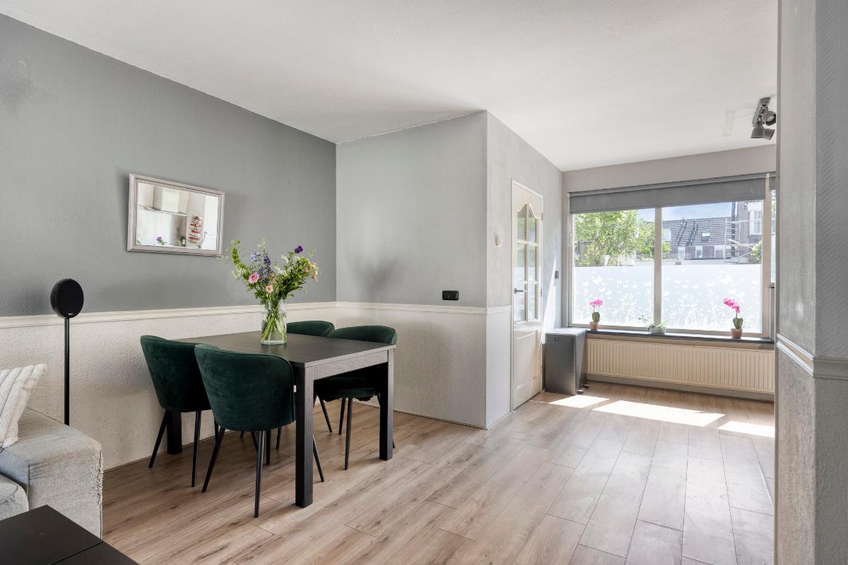 Bij binnenkomst valt meteen op hoe licht en ruim de woning aanvoelt. Aan de voorzijde bevindt zich de open keuken, voorzien van diverse inbouwapparatuur. Deze loopt over in de tuingerichte woonkamer, waar een aangebouwde serre zorgt voor extra leefruimte en een prettige verbinding met de achtertuin. De tuin is gelegen op het noordwesten en biedt daardoor veel zon in de middag en avond – perfect om na een drukke dag te ontspannen.