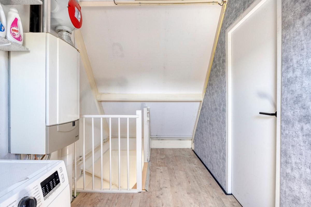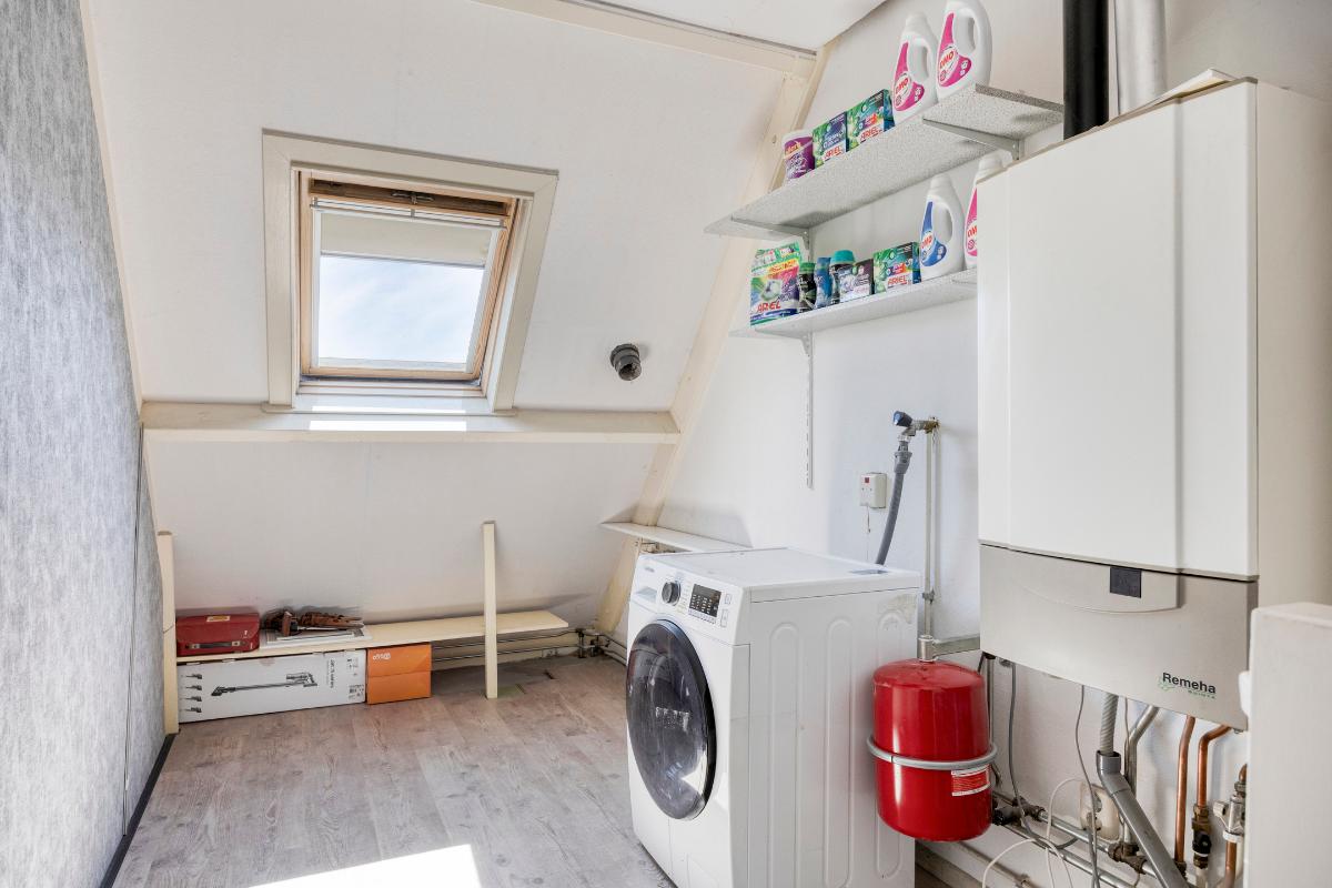 Tweede verdieping: middels een vaste trap naar de voorzolder, opstelling/aansluiting wasmachine/droger, cv-ketel en mechanische ventilatie box, toegang naar slaapkamer en kleine vliering.