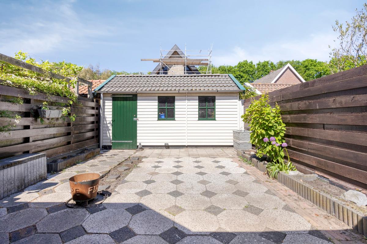 In de achtertuin staat een aangebouwde stenen berging en een vrijstaande houten berging beide voorzien van elektra.