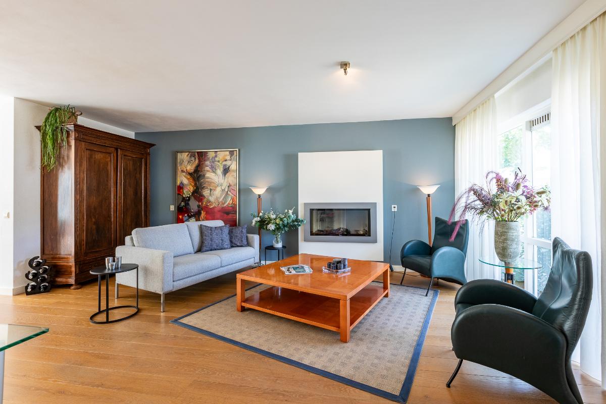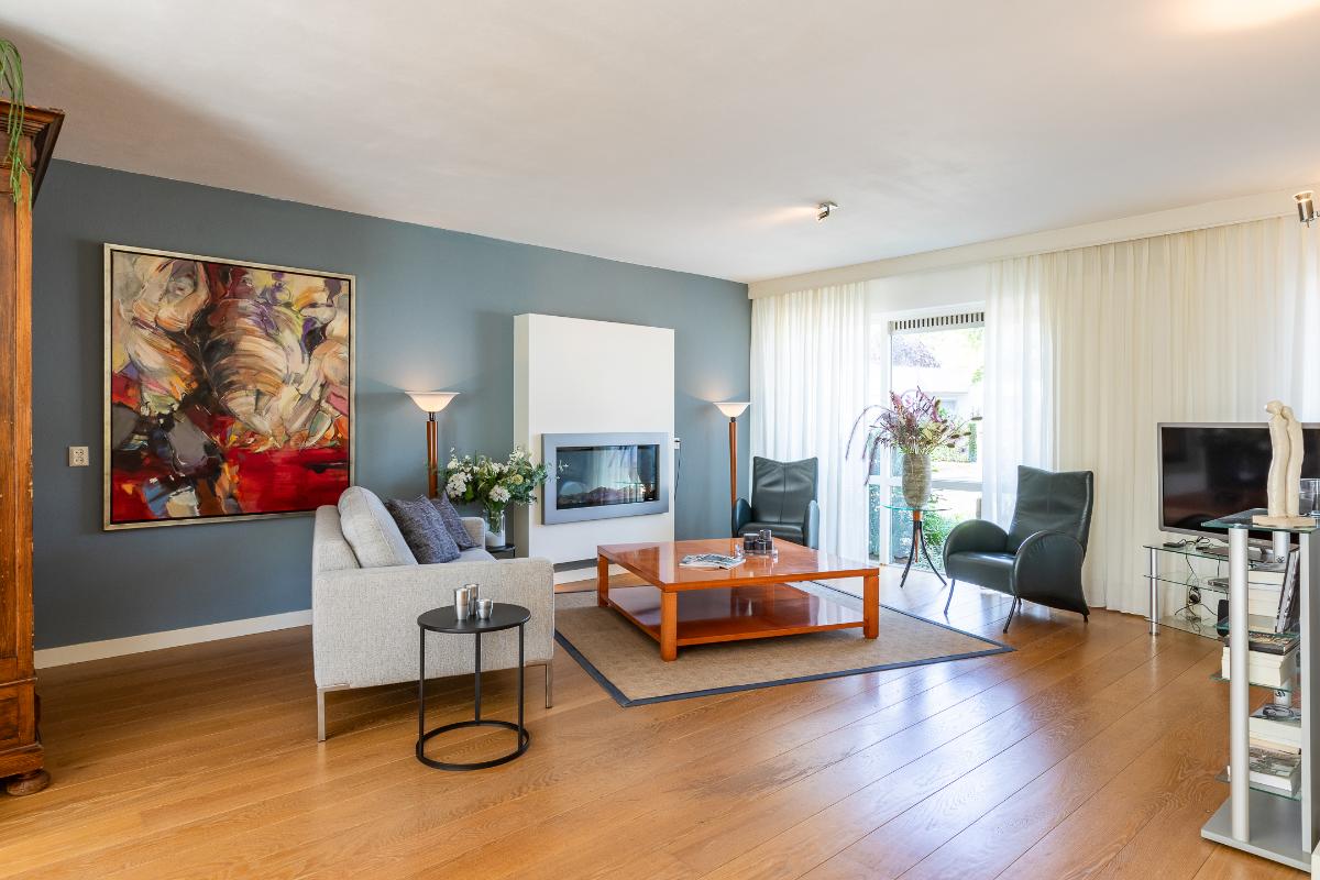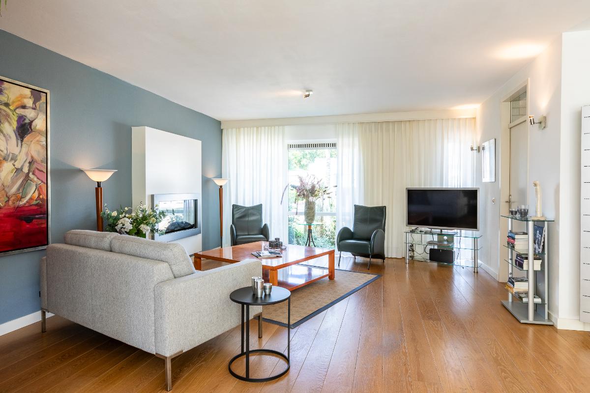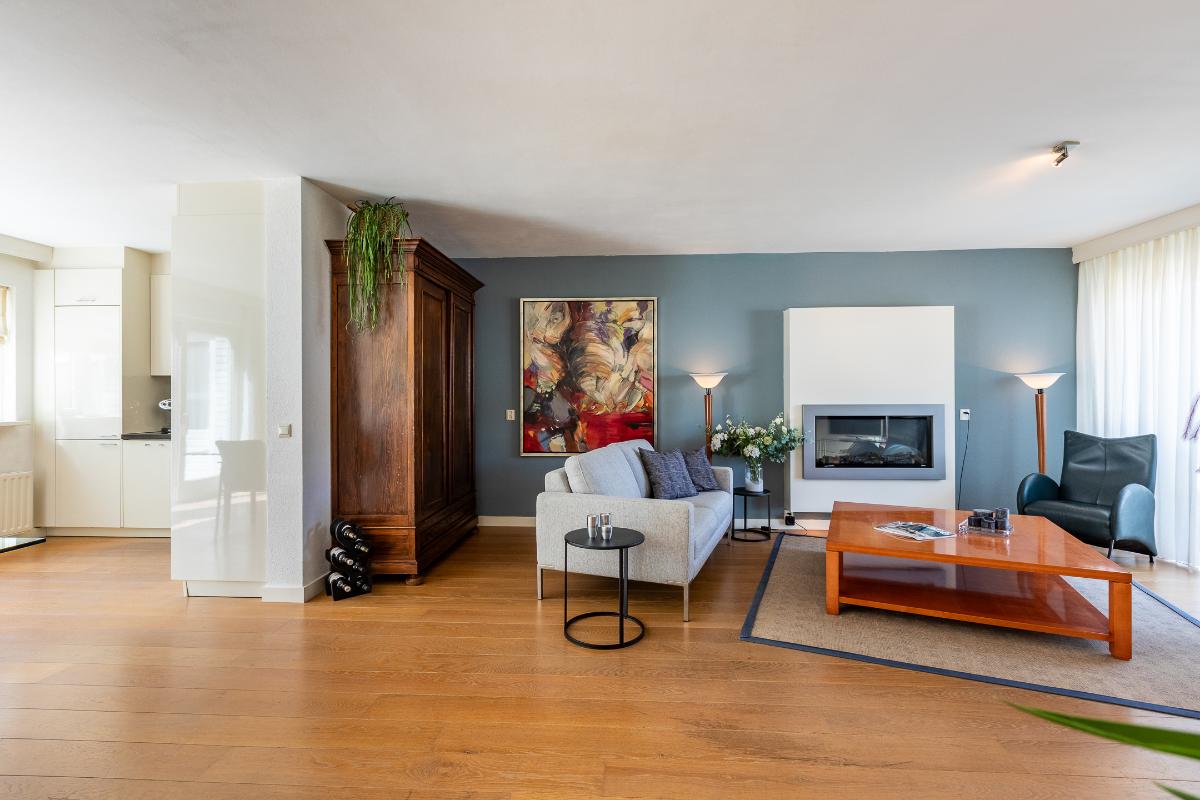 Woonkamer De woonkamer is royaal van opzet en beschikt over een sfeervolle elektrische haard die meteen de aandacht trekt en uitnodigt tot gezellige avonden. Grote ramen aan de voor- en achterzijde zorgen voor een overvloed aan daglicht, waardoor de ruimte licht en uitnodigend oogt. De houten vloer loopt door in het gehele leefgedeelte en geeft de kamer een warme en natuurlijke uitstraling. Het gestuukte plafond boven de zithoek en de strakke wandafwerking zorgen voor een rustige basis. Hier is volop plaats voor een comfortabele zithoek met uitzicht op zowel de voortuin als de achtertuin.