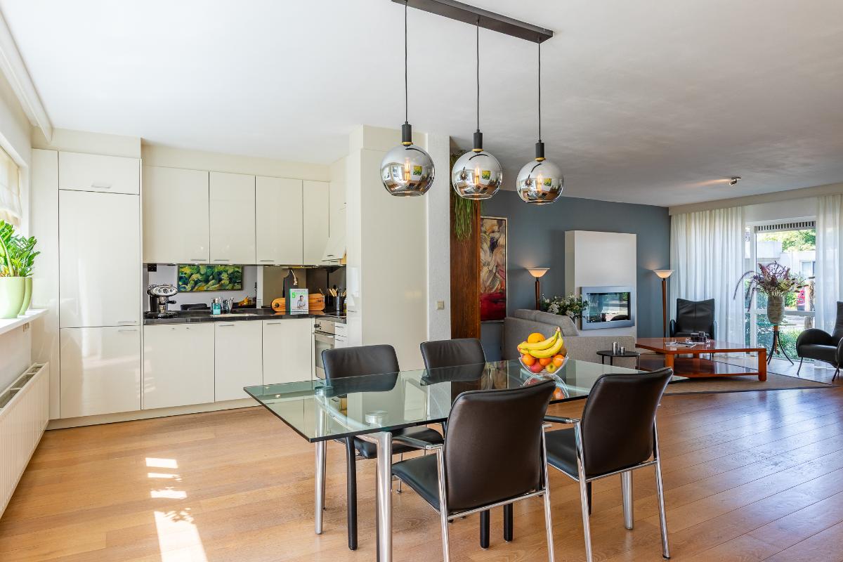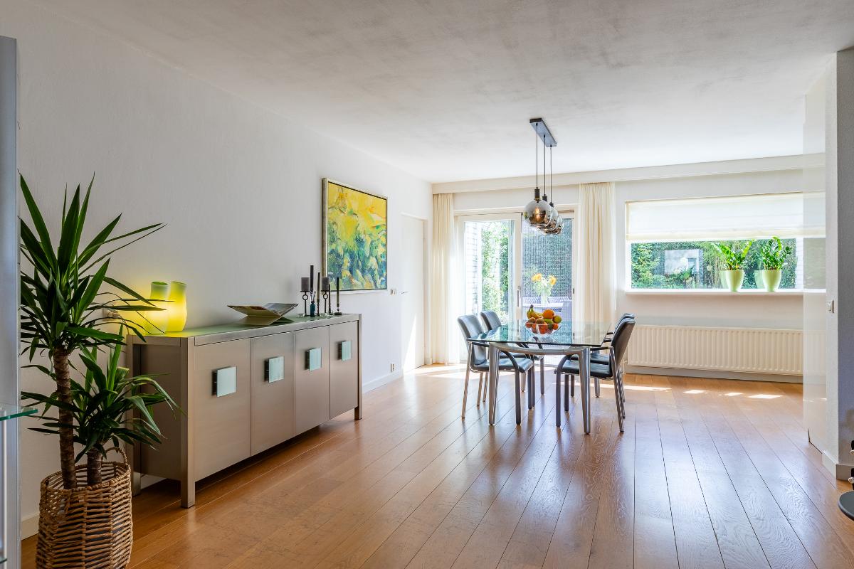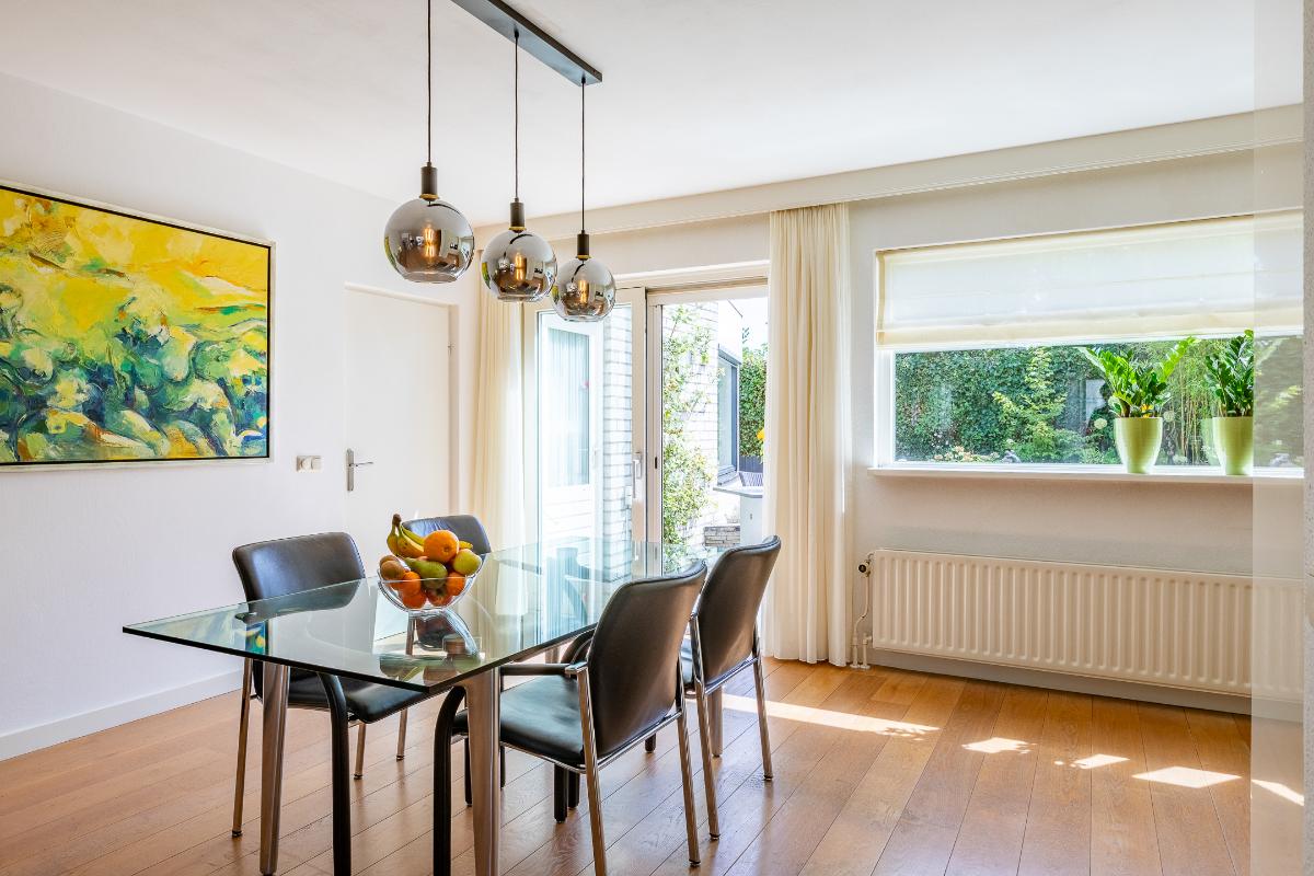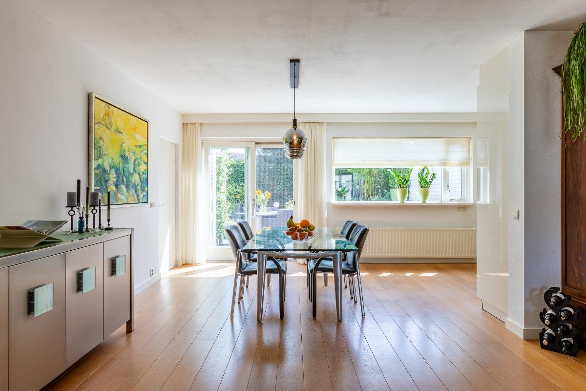 Eetkamer Het eetgedeelte sluit naadloos aan op de woonkamer en vormt een verbindende schakel tussen de zitkamer en de keuken. Hier is ruimte voor een royale eettafel, ideaal voor lange diners met familie of vrienden. Dankzij de schuifpui naar de tuin geniet u van een directe verbinding met buiten, waardoor binnen en buiten op een vanzelfsprekende manier in elkaar overlopen.