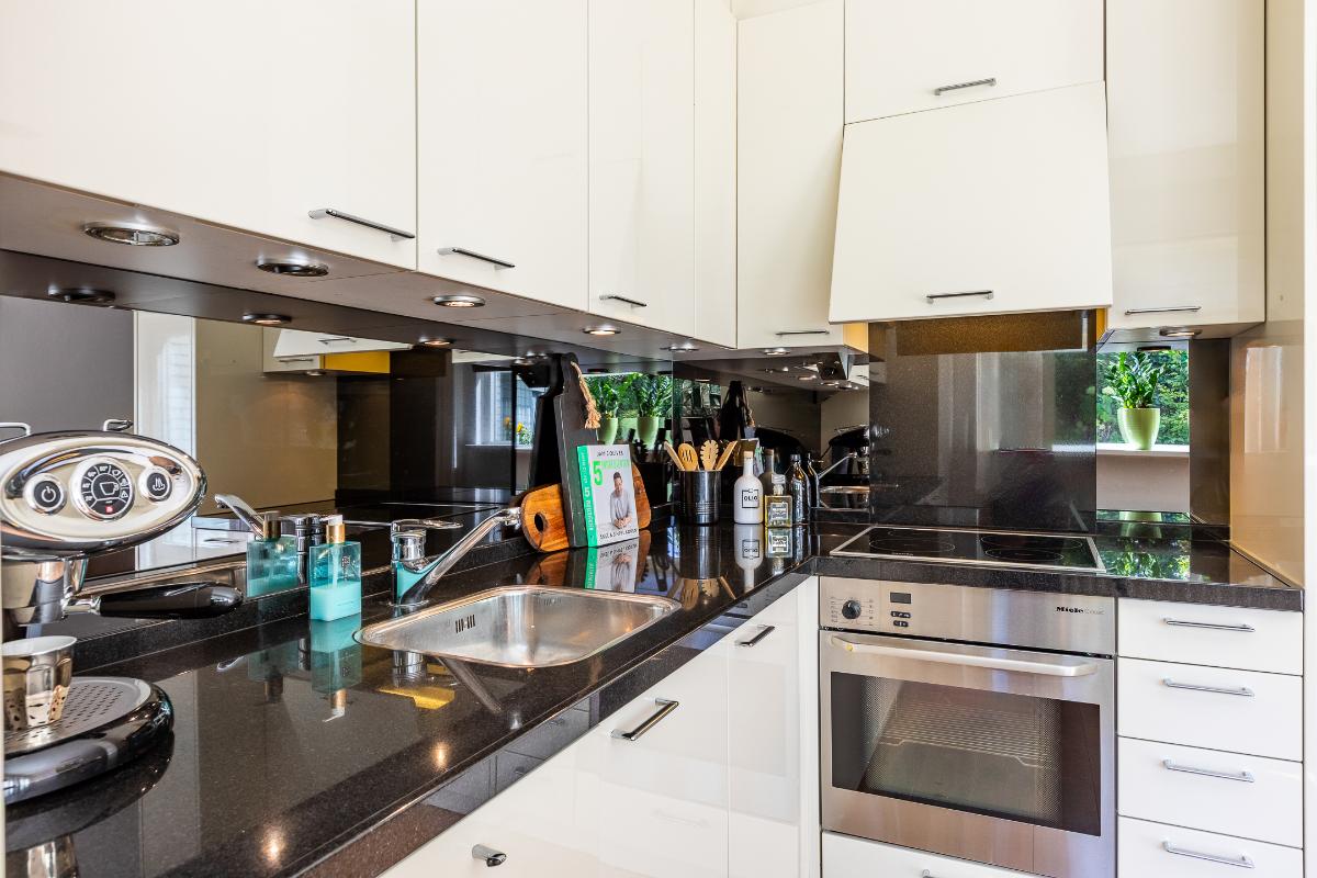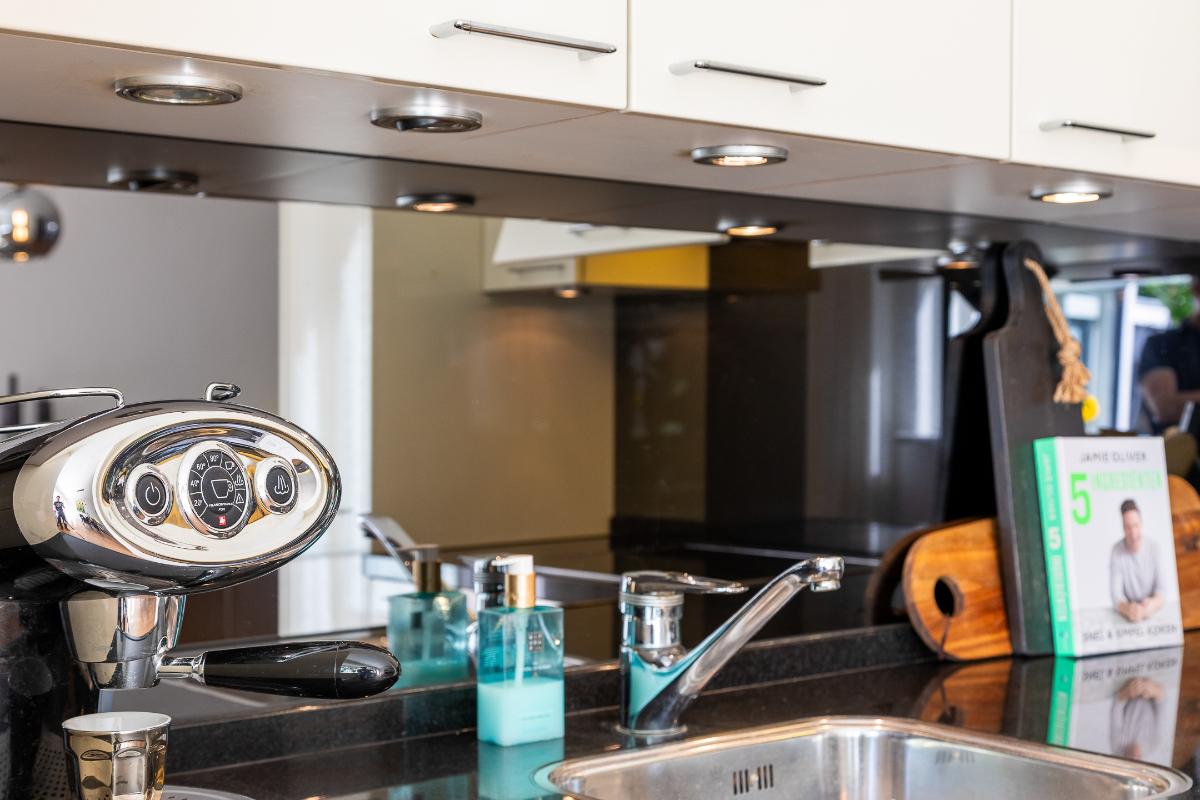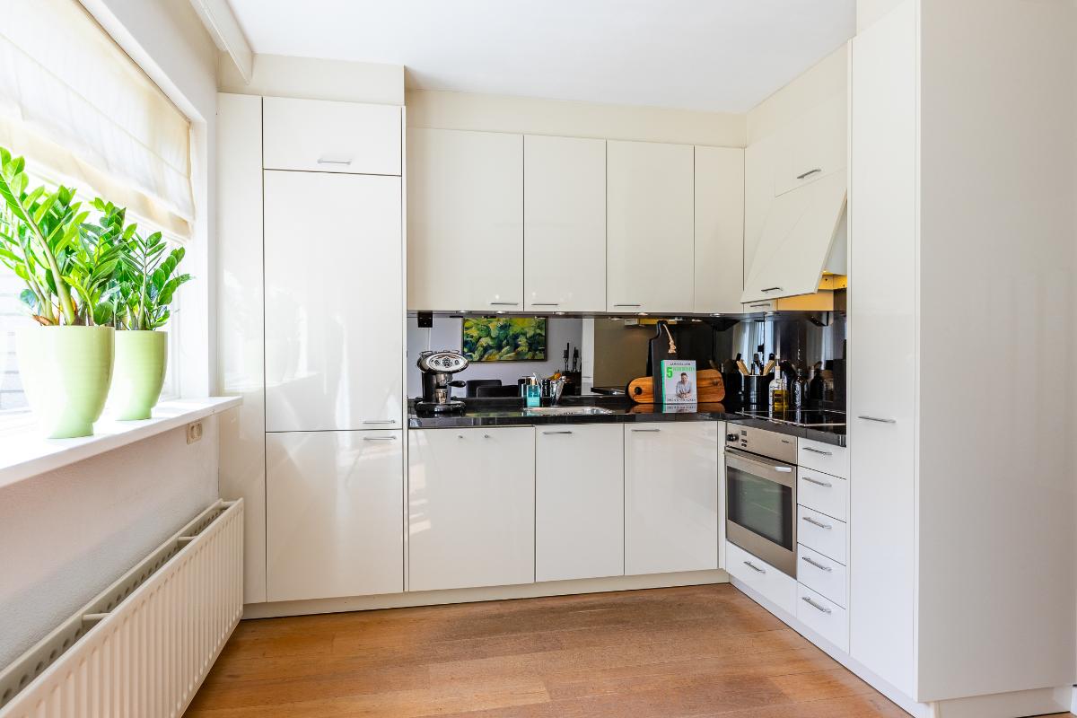 Keuken De halfopen keuken is modern uitgevoerd en vormt een lichte, prettige werkplek. De hoogglans fronten in roomwit combineren mooi met het donkere granieten werkblad en geven de keuken een tijdloze en luxe uitstraling. Er is gekozen voor complete inbouwapparatuur, waaronder een inductiekookplaat met afzuigkap, oven, koelkast, vrieskast en vaatwasser. Dankzij de hoekopstelling is er volop kastruimte en werkblad. Er is tevens een apothekerskast aanwezig en geniet de keuken een fijne lichtinval.