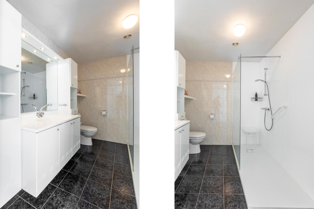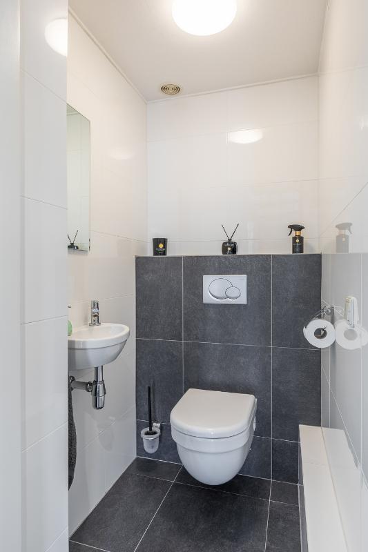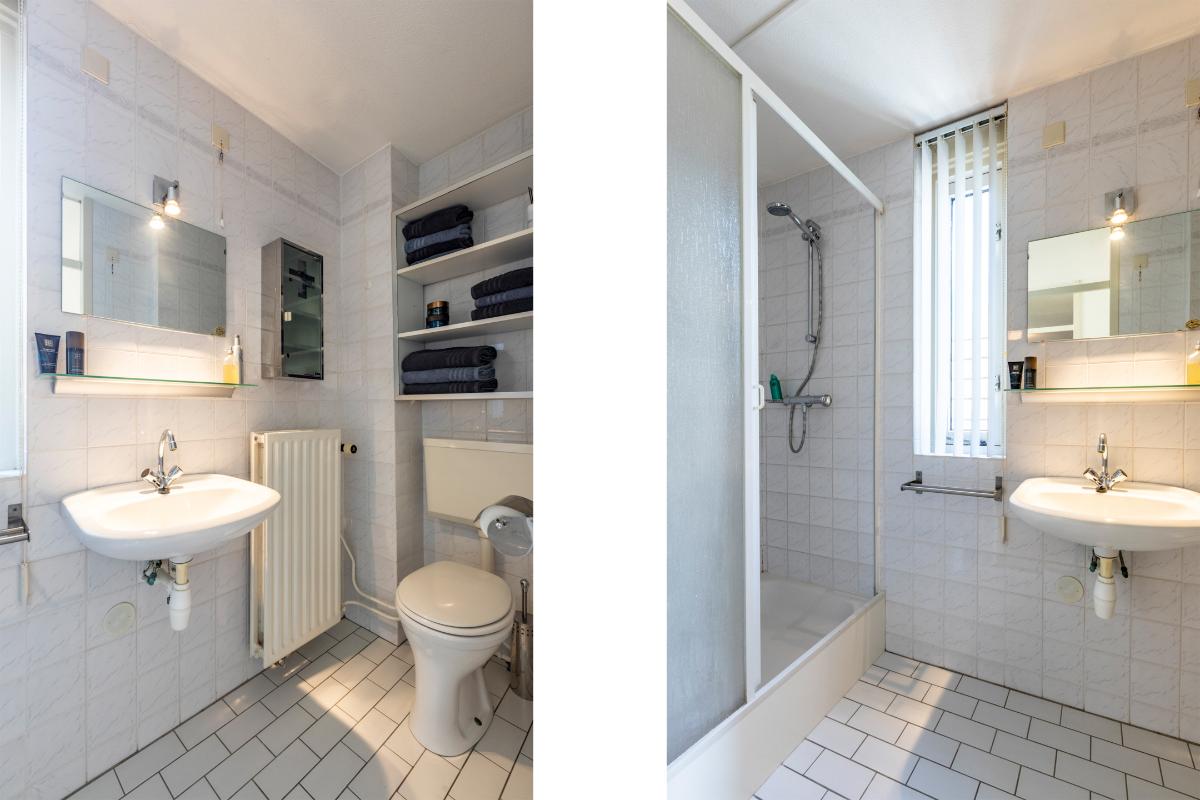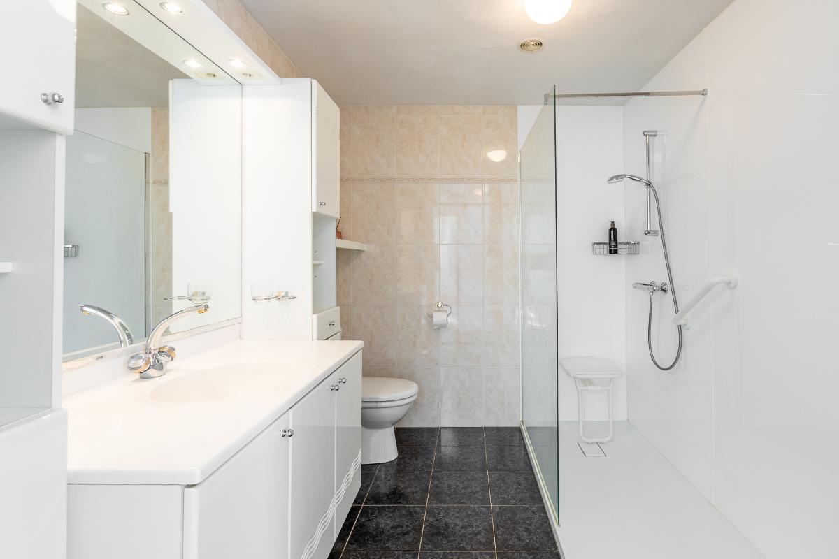 De badkamer grenst direct aan de slaapkamer en is praktisch en compleet uitgevoerd. Er is een ruime inloopdouche, een wastafelmeubel met veel bergruimte en een toilet. De lichte betegeling en neutrale kleurstelling maken dit een frisse en tijdloze ruimte die van alle gemakken is voorzien.