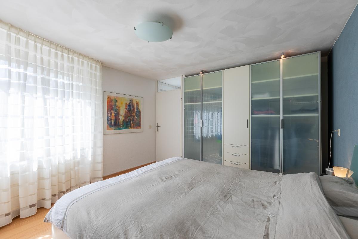 Slaapkamer en badkamer – begane grond De woning beschikt op de begane grond over een ruime slaapkamer, ideaal voor gelijkvloers wonen. De kamer is voorzien van een laminaatvloer en lichte wanden, wat samen zorgt voor een rustige en comfortabele sfeer. Grote ramen met elektrisch zonnescreen bieden zicht op de tuin en laten veel daglicht binnen, waardoor dit een fijne plek is om tot rust te komen.