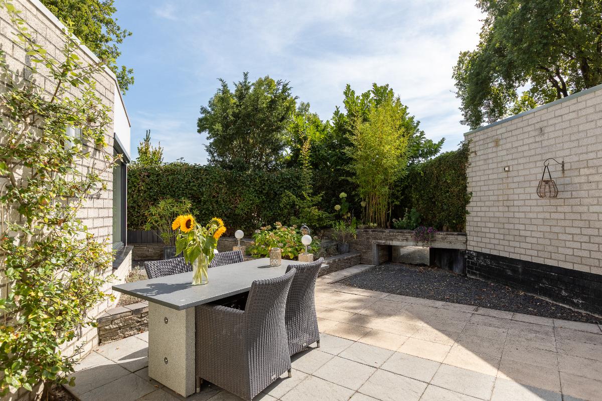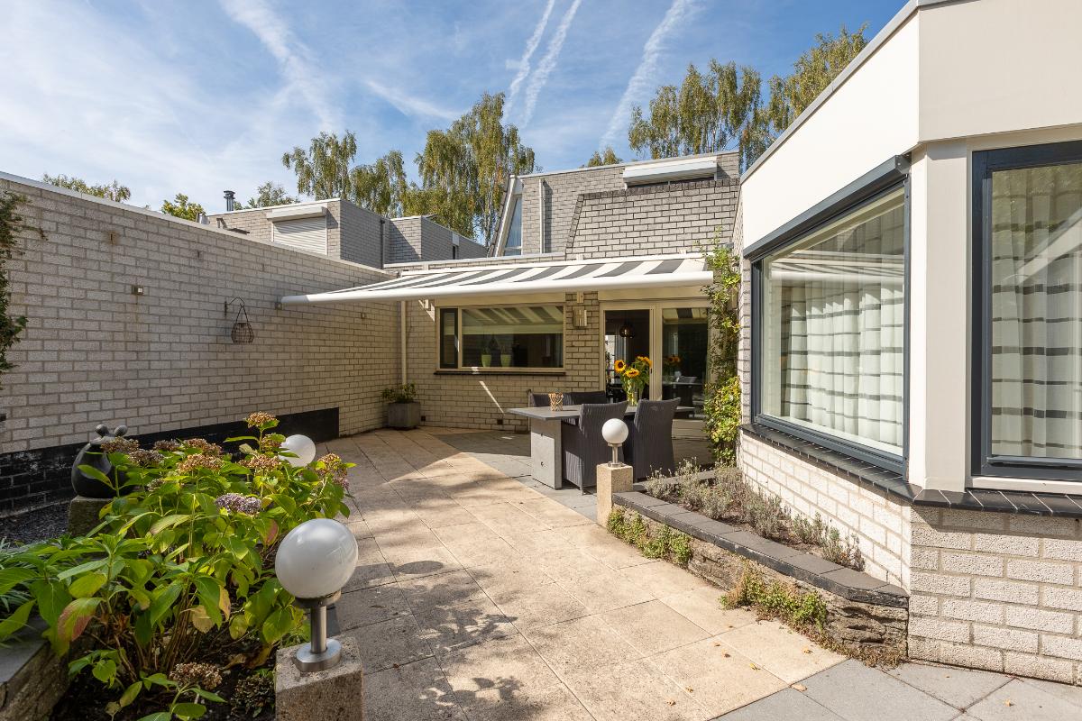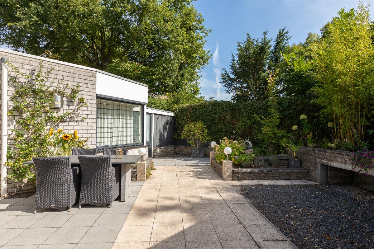 Tuin De achtertuin is verzorgd en onderhoudsvriendelijk aangelegd met sierbestrating, groene borders, elektrische zonneluifel en een verhoogd plantenperkje. De hoge erfafscheiding biedt volop privacy, waardoor dit een beschutte plek is om te genieten. Er is ruimte voor meerdere zitjes: zo kunt u kiezen voor een zonnig terras of juist een plek in de schaduw onder het zonnescherm. De tuin vraagt weinig onderhoud en nodigt vooral uit om te ontspannen. Achter de aanbouw staat een aangebouwde houten berging, ideaal voor het opbergen van tuingereedschap en tuinstoelen.