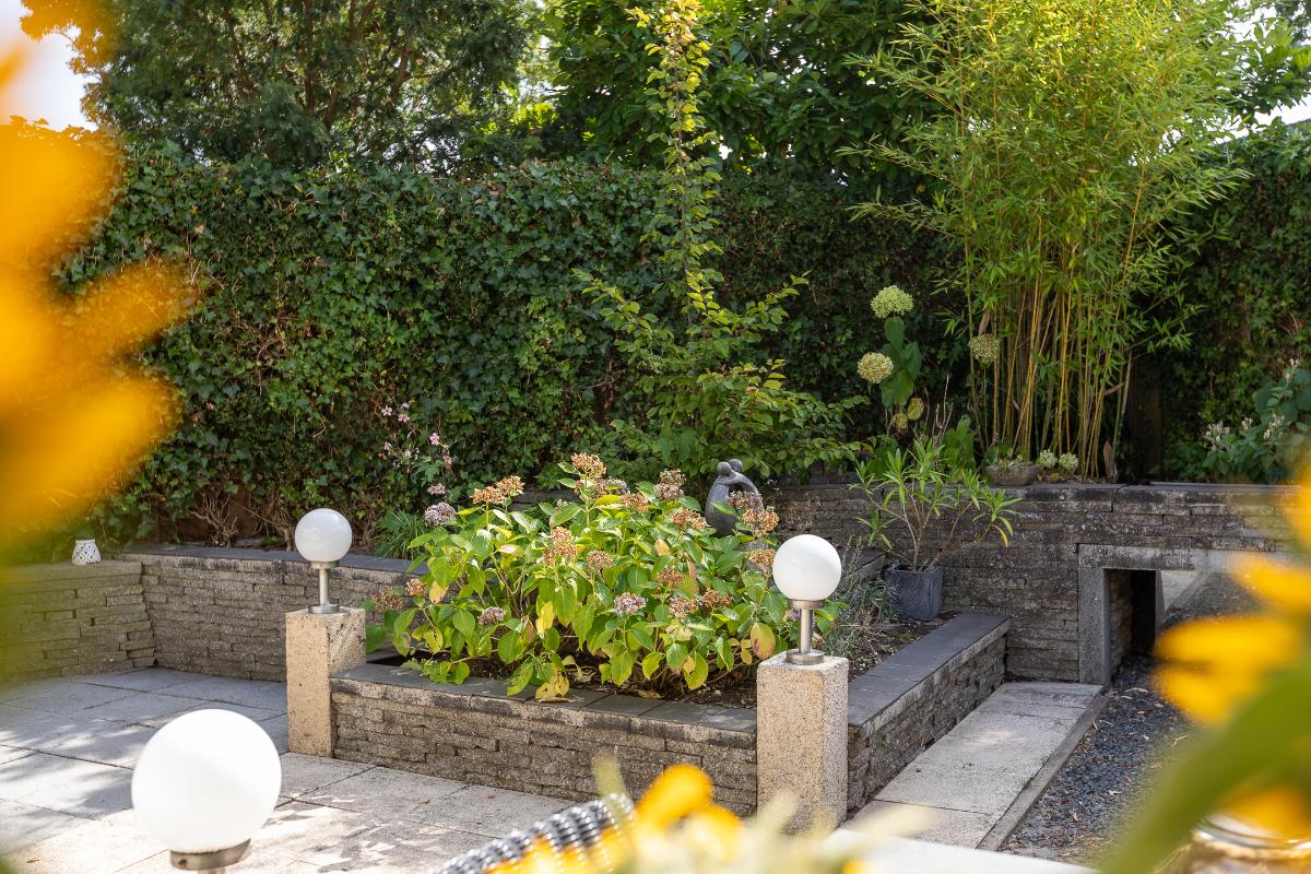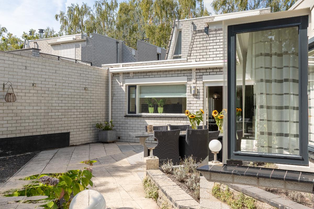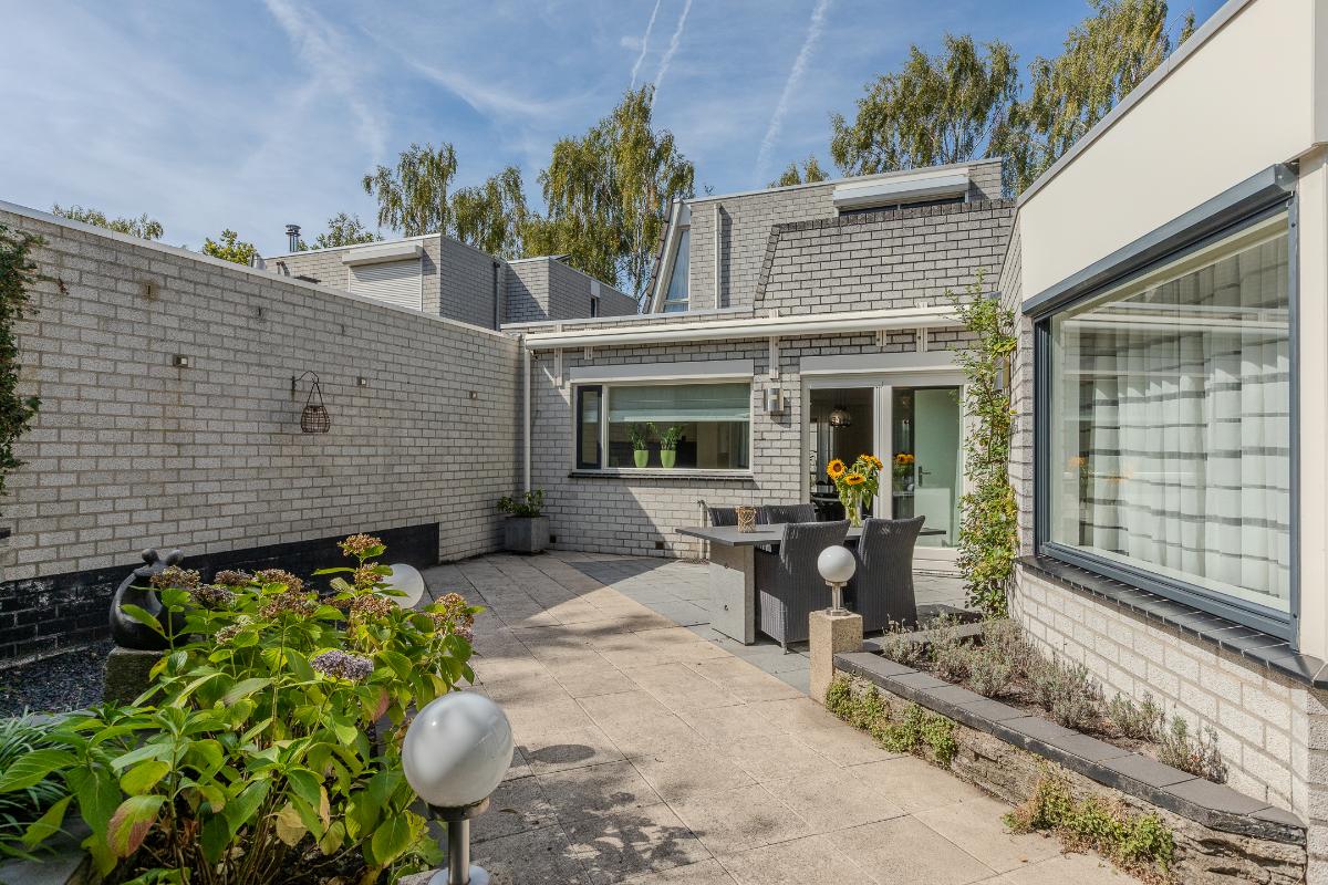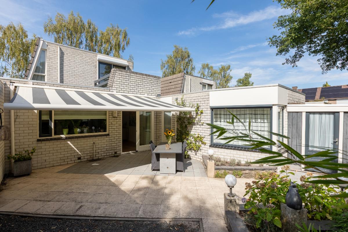 Tuin De achtertuin is verzorgd en onderhoudsvriendelijk aangelegd met sierbestrating, groene borders, elektrische zonneluifel en een verhoogd plantenperkje. De hoge erfafscheiding biedt volop privacy, waardoor dit een beschutte plek is om te genieten. Er is ruimte voor meerdere zitjes: zo kunt u kiezen voor een zonnig terras of juist een plek in de schaduw onder het zonnescherm. De tuin vraagt weinig onderhoud en nodigt vooral uit om te ontspannen. Achter de aanbouw staat een aangebouwde houten berging, ideaal voor het opbergen van tuingereedschap en tuinstoelen.