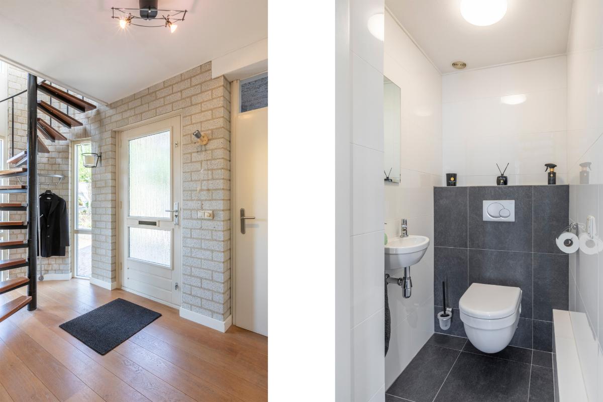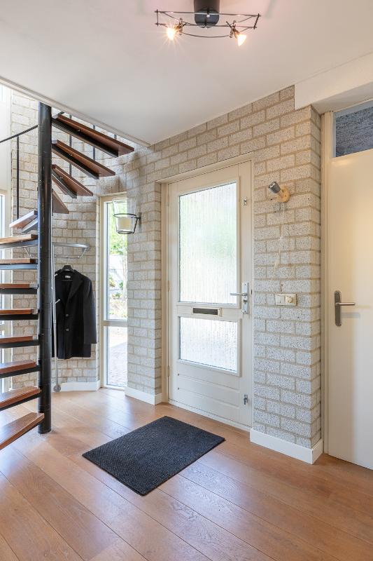Indeling van de woning Entree/hal De entree maakt meteen indruk door de markante ronde gevelpartij met hoge raampartijen. Hierdoor valt er veel daglicht binnen en voelt de hal bijzonder ruim en open aan. De houten vloer geeft warmte en karakter, terwijl de lichte wanden zorgen voor een frisse basis. Blikvanger is de fraaie spiltrap met houten treden die leidt naar de verdieping en de ruimte een speelse uitstraling geeft. In de hal bevindt zich tevens het moderne toilet, uitgevoerd in een neutrale kleurstelling met hangend closet en fonteintje. Vanuit de hal zijn de woonkamer en de garage/berging bereikbaar.