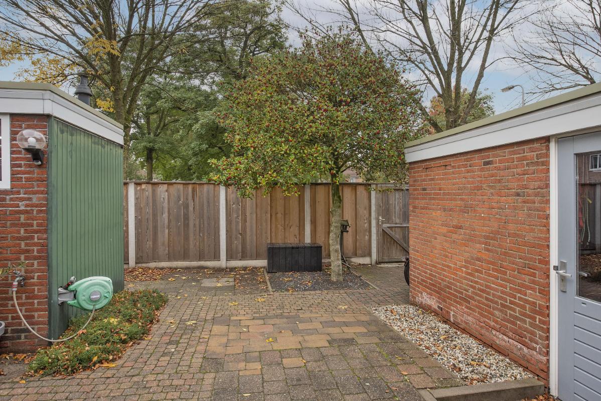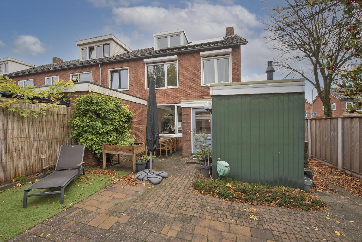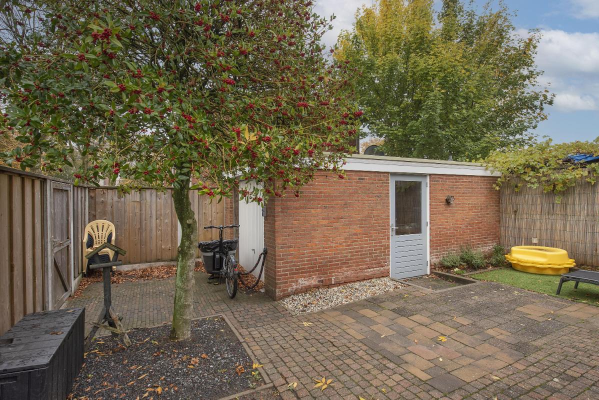 Fijne ruimte achter het huis De achtertuin is netjes aangelegd en biedt voldoende ruimte voor een zithoek of wat groen. Dankzij de ligging heb je er een fijne plek om buiten te zitten. Achterin staat de losse garage met berging – praktisch voor fietsen, tuingereedschap of wat extra opslag.