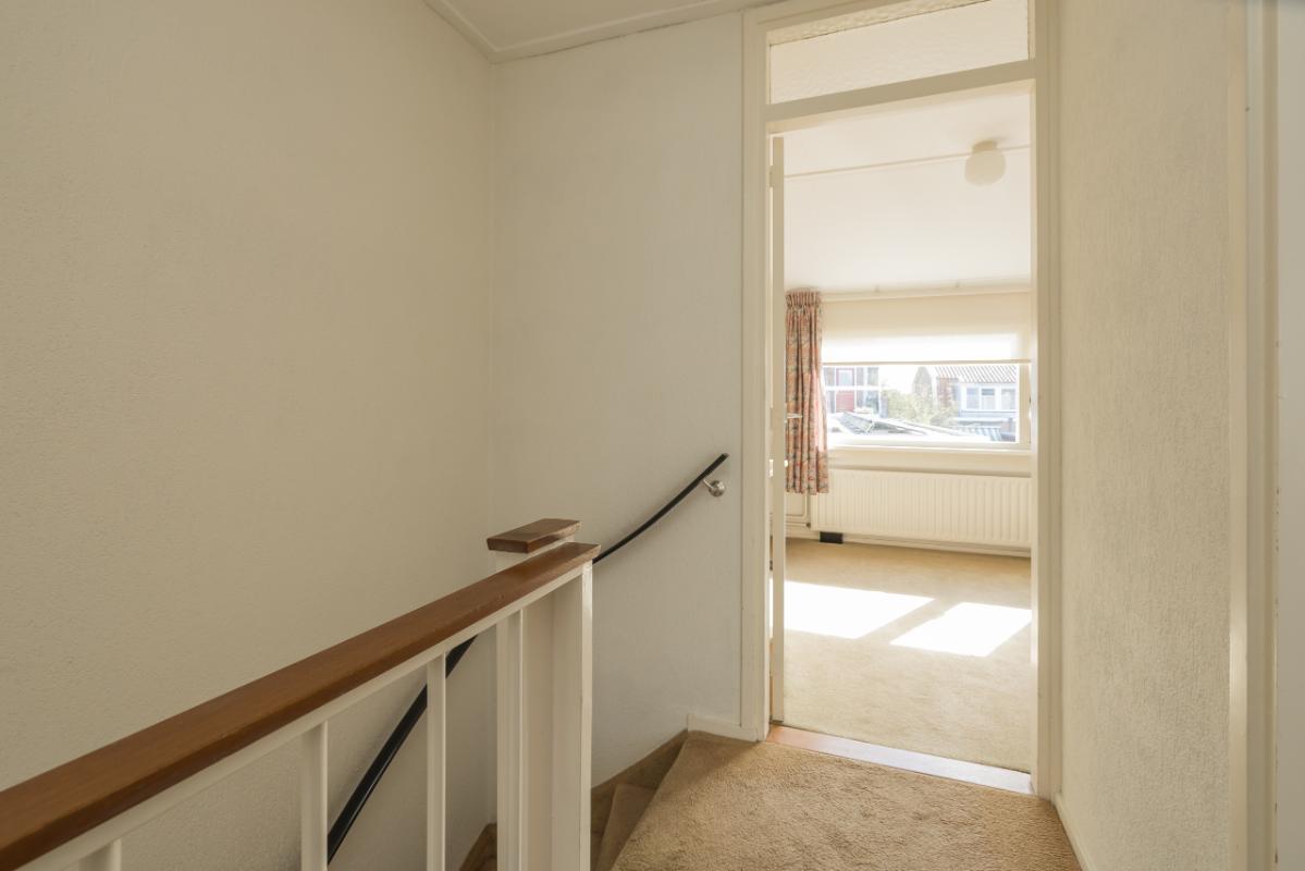 Begane grond Entree met hal voorzien van de meterkast (5 groepen en aardlekschakelaar). De lichte L-vormige woonkamer is voorzien van een erker aan de voorzijde, wat zorgt voor extra licht en ruimte. Vanuit de woonkamer kom je in de tussenhal met trapopgang naar de eerste verdieping, de badkamer met ruime inloopdouche en de aparte toiletruimte met wastafel. Aan de achterzijde bevindt zich de woonkeuken in U-opstelling, uitgevoerd in een lichte kleurstelling en voorzien van oven, gaskookplaat, afzuigkap en koel-/vriescombinatie. Aansluitend is de praktische bijkeuken bereikbaar, met aansluiting voor de wasmachine, extra bergruimte en een deur naar de achtertuin.
