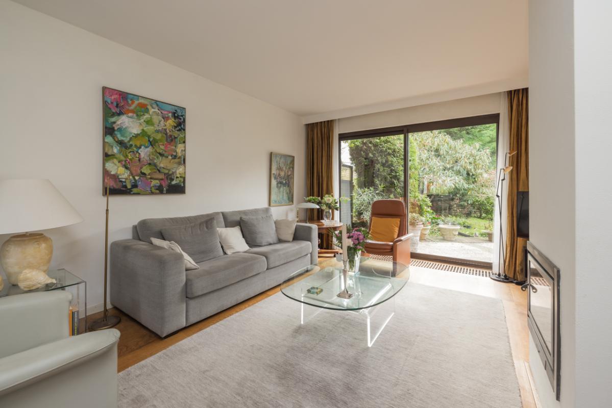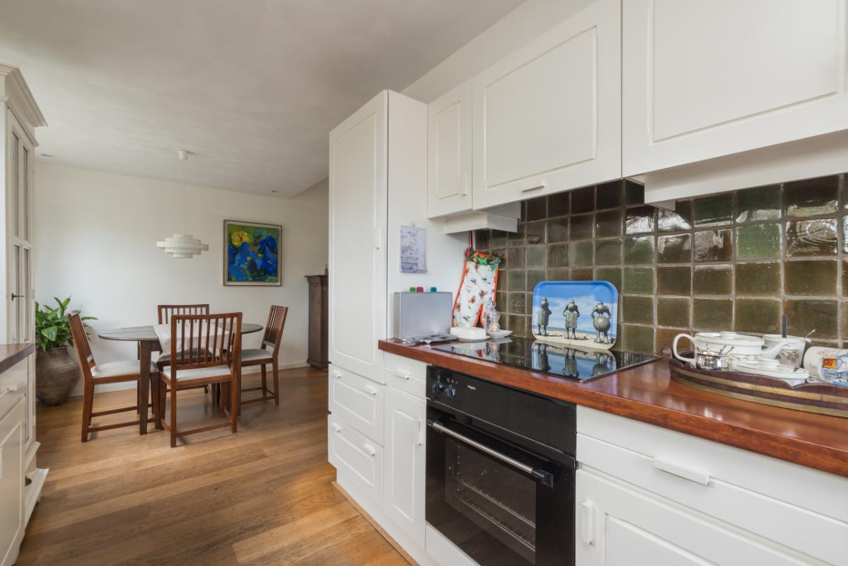 Ground floor layout: You enter the spacious hall. Here you'll find the coat closet, meter cupboard, and toilet with a small sink. The bright L-shaped living room features a cozy wood-burning stove and sliding doors leading to the lovely back garden. At the front is the open-plan kitchen. This attractive country-style kitchen with a corner layout is equipped with an oven/grill, ceramic cooktop, and a close-in water heater.