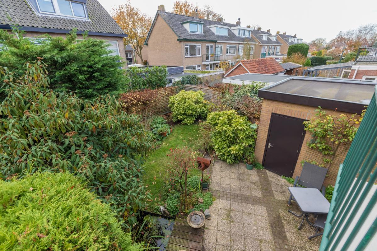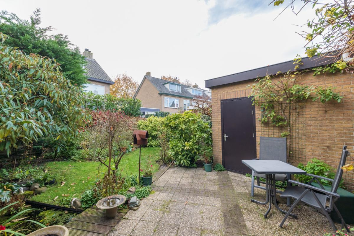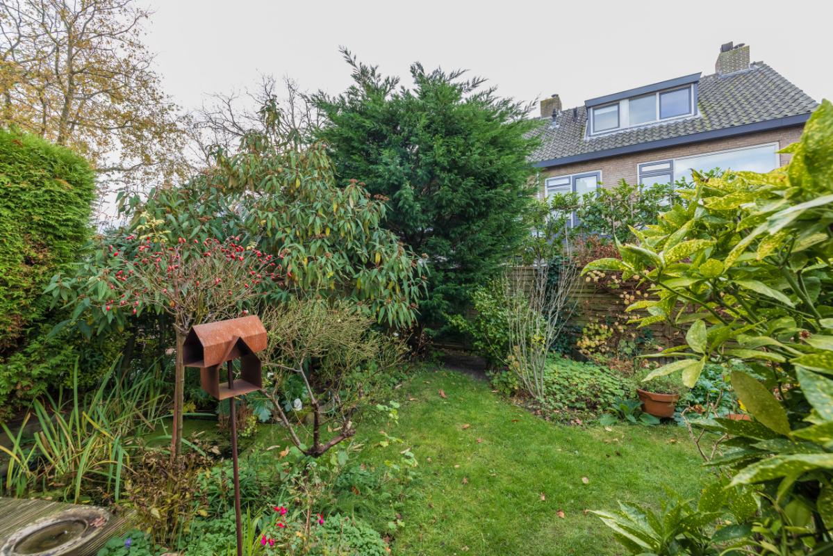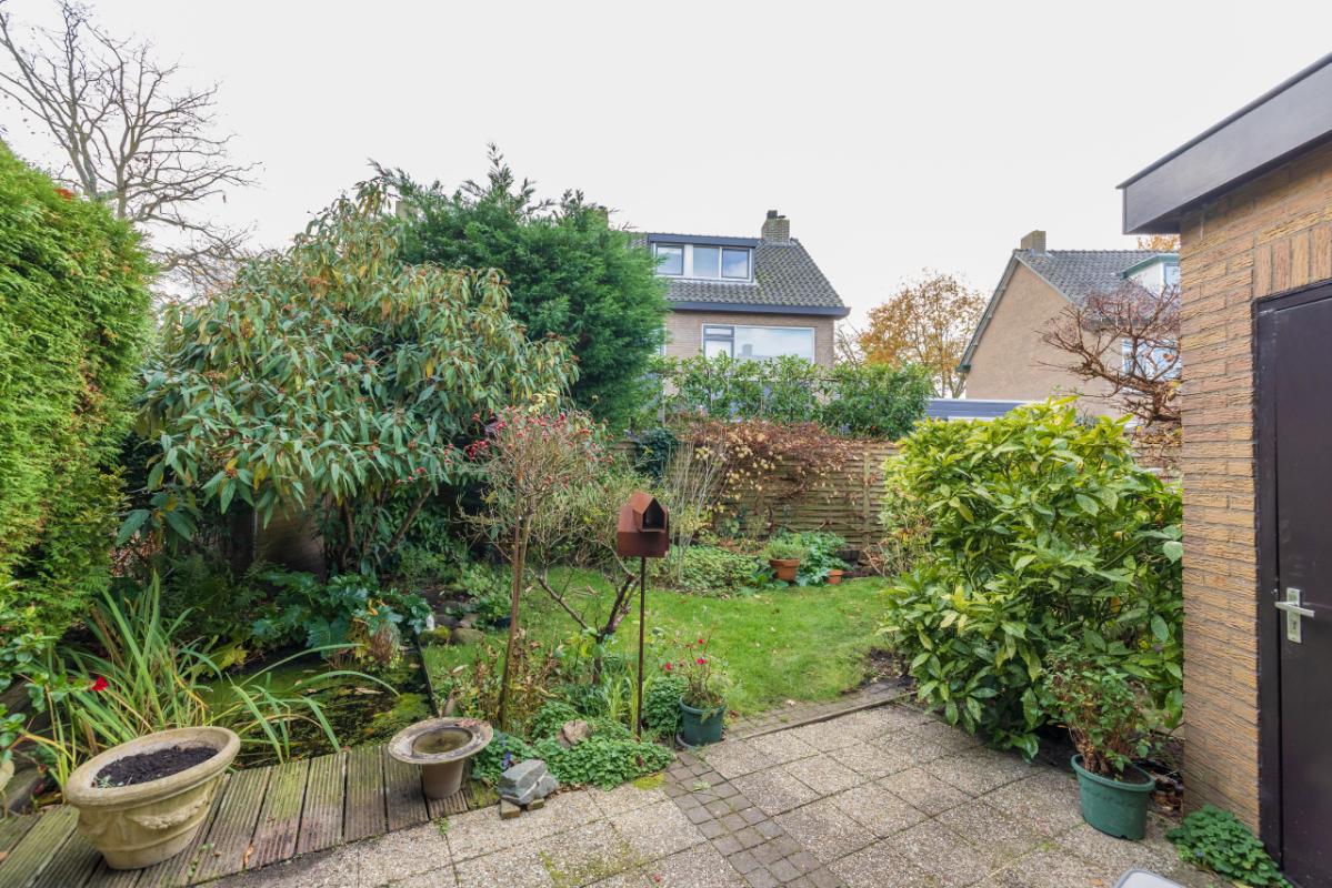 Tuin: De ruime voortuin (8,5 meter diep, 9,7 meter breed) heeft een royale oprit met parkeergelegenheid voor 2 auto’s op eigen terrein. De voortuin is heerlijk groen aangelegd en biedt hierdoor privacy vanaf de straat. Ook de achtertuin is fraai aangelegd met een terras, vijver, gazon en groene borders. De zonnige achtertuin ligt op het zuidwesten waardoor er heerlijk van de zon genoten kan worden.