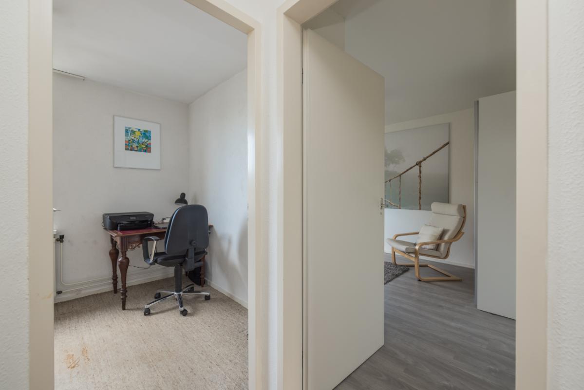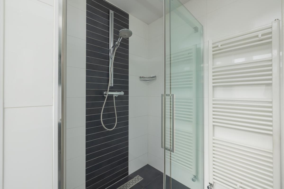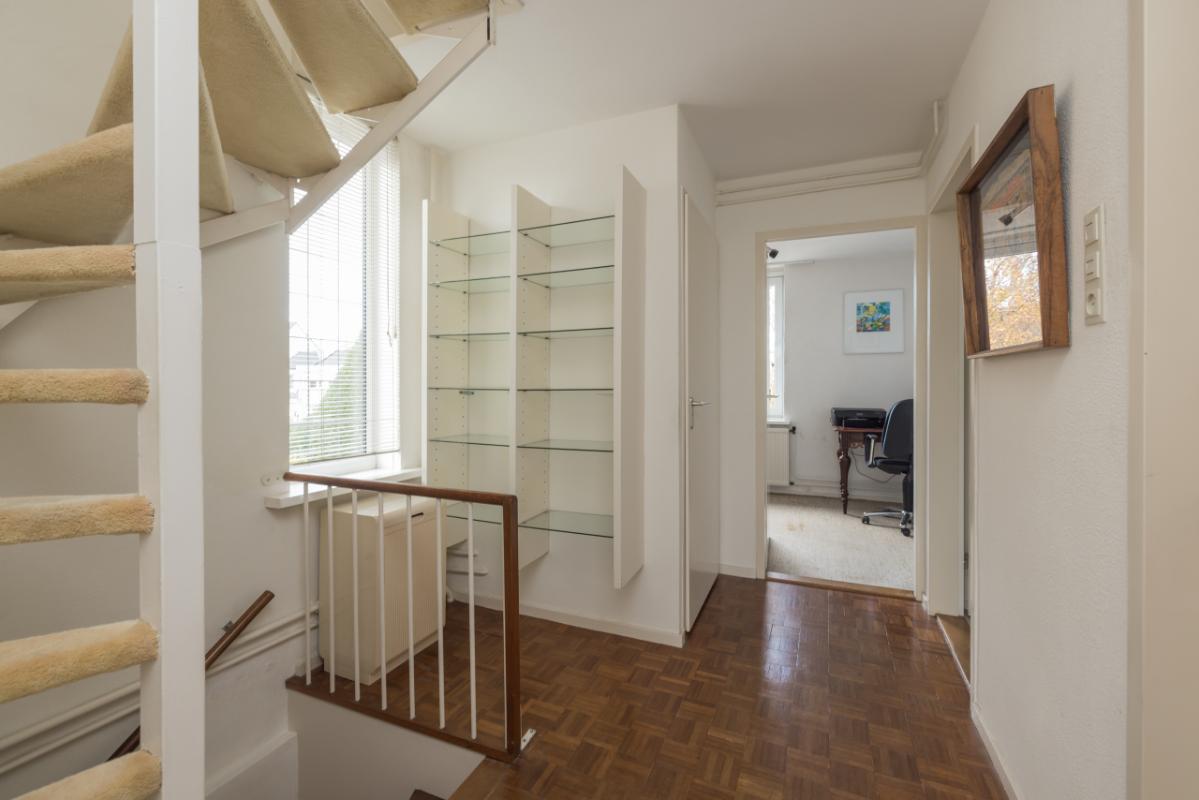 First floor: Spacious landing with a separate toilet. This floor has two bedrooms at the front. The generous (master) bedroom is located at the rear and features a built-in wardrobe and access to the sunny southwest-facing balcony. The modern bathroom (gray and white) features a large walk-in shower, vanity, designer radiator, and washing machine connection.